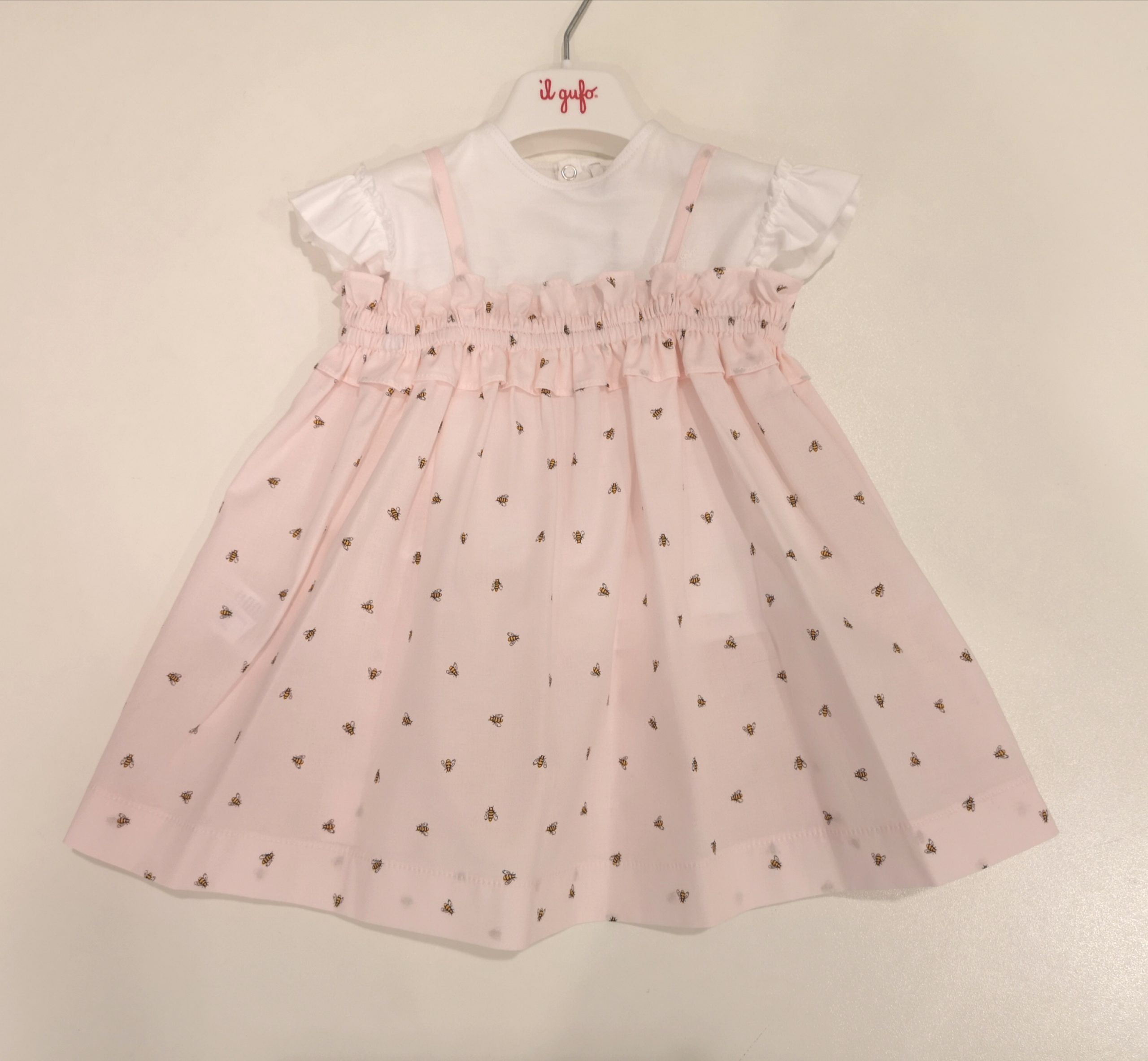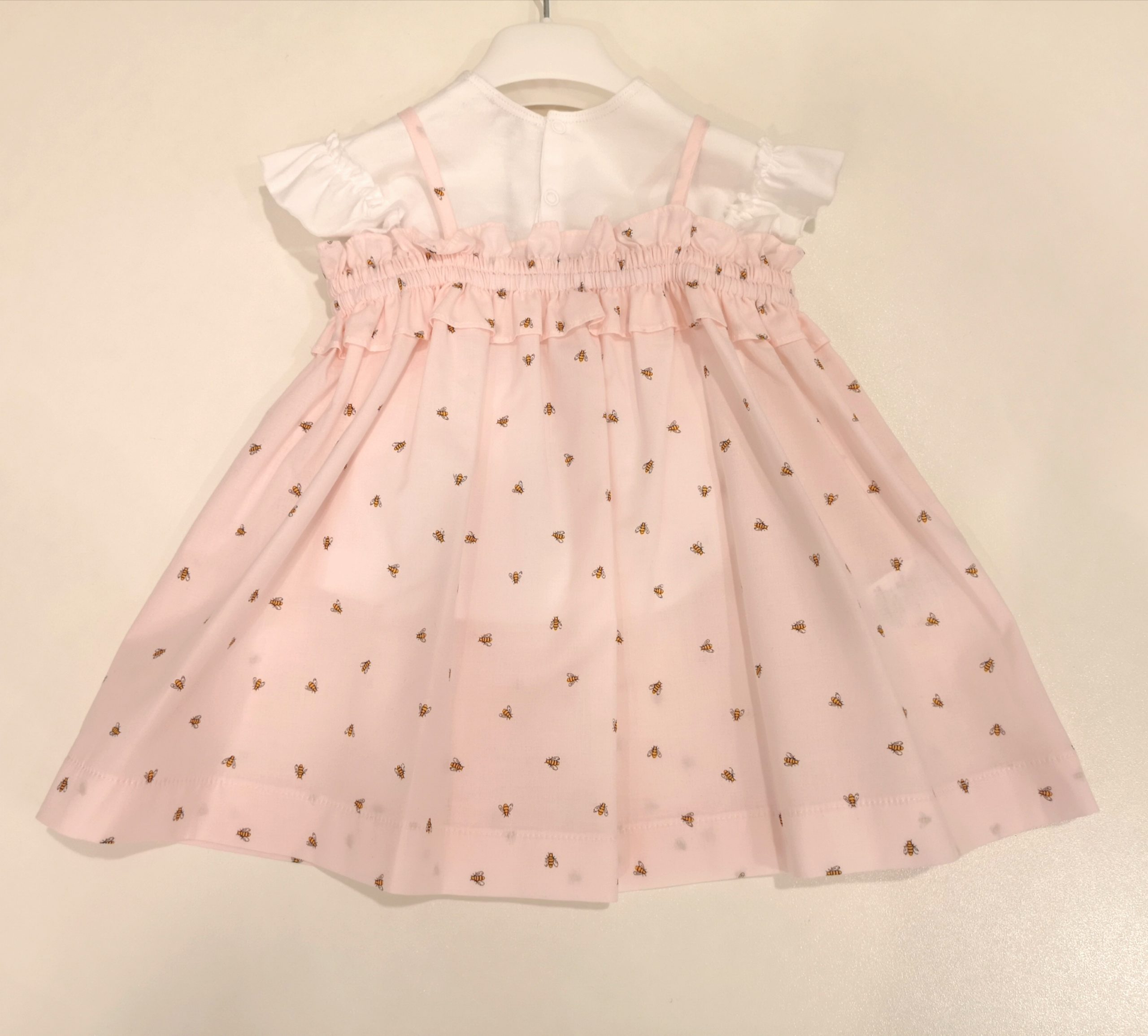 Completo 2 pezzi: Abito con bretelline in tessuto rosa fantasia piccole api + t-shirt in jersey di cotone bianco