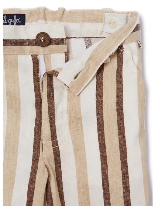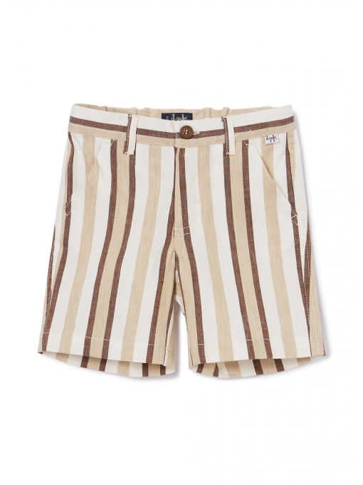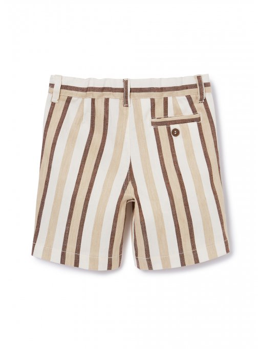 Raffinato pantalone corto in tessuto misto lino con righe tinto filo con giochi di color terra, regolazione della vita con pratico elastico nascosto