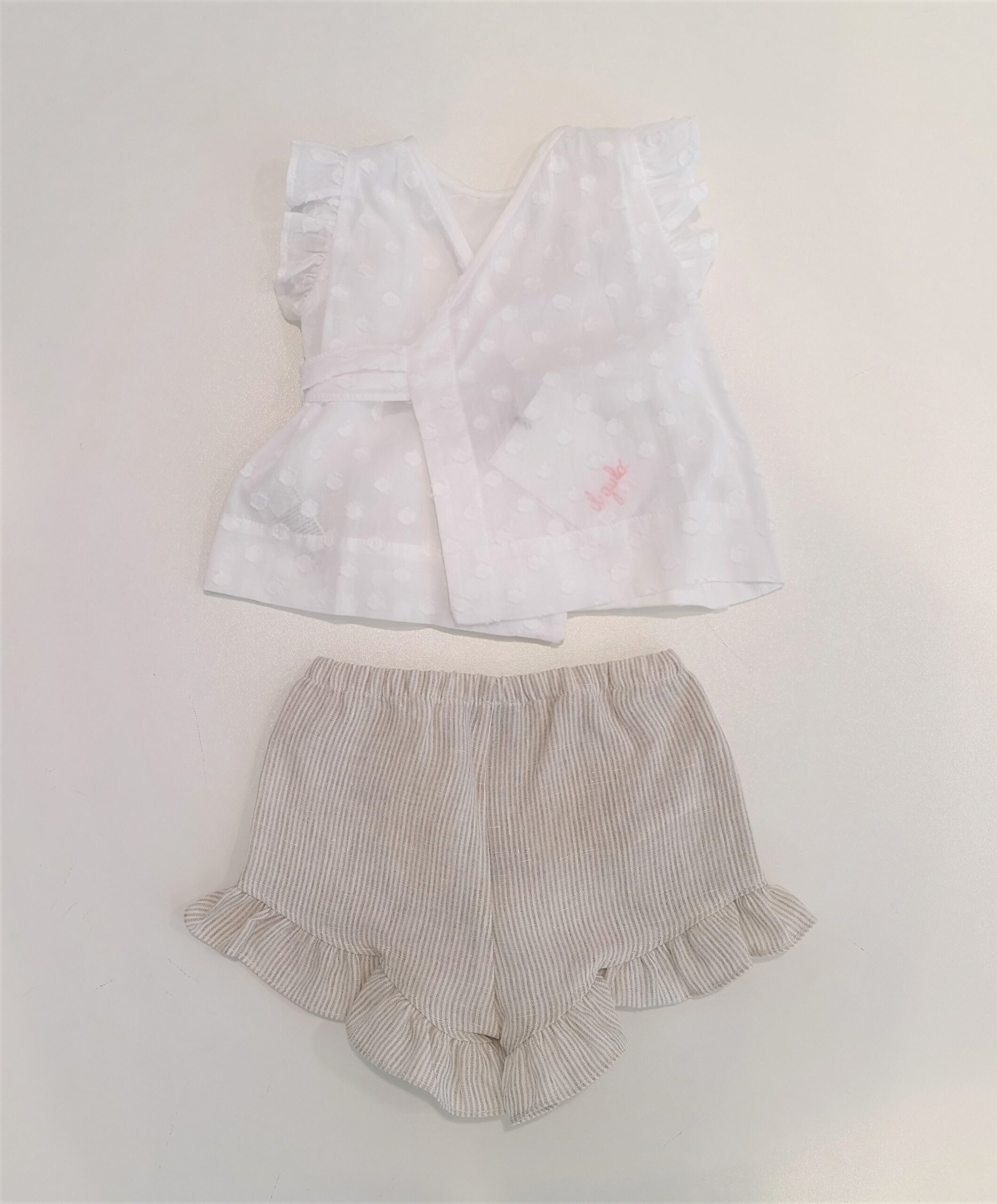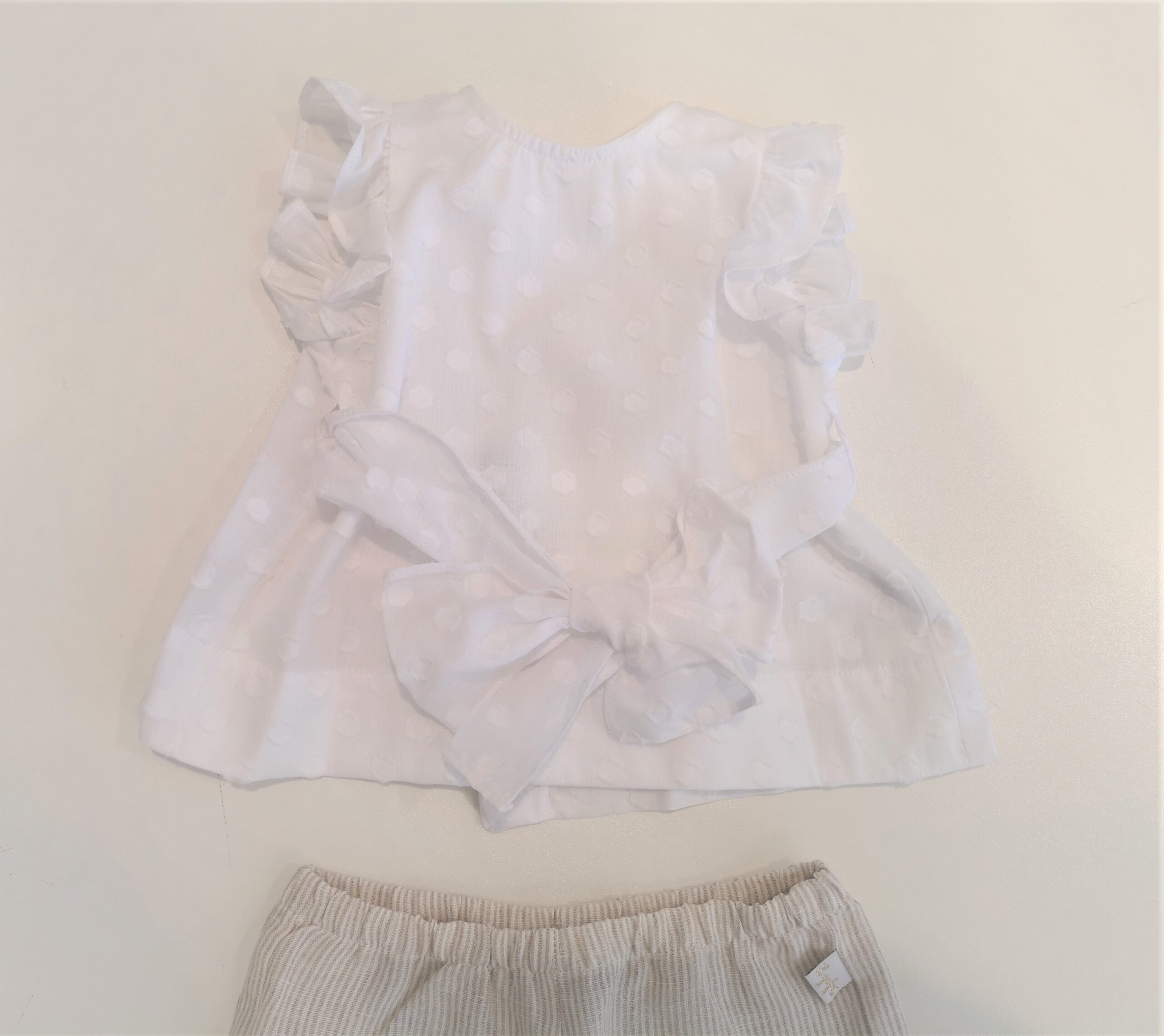 Completo due pezzi: short beige in tessuto a righine, blusa bianca con tessuto lavorato con fiocco davanti che si incrocia davanti