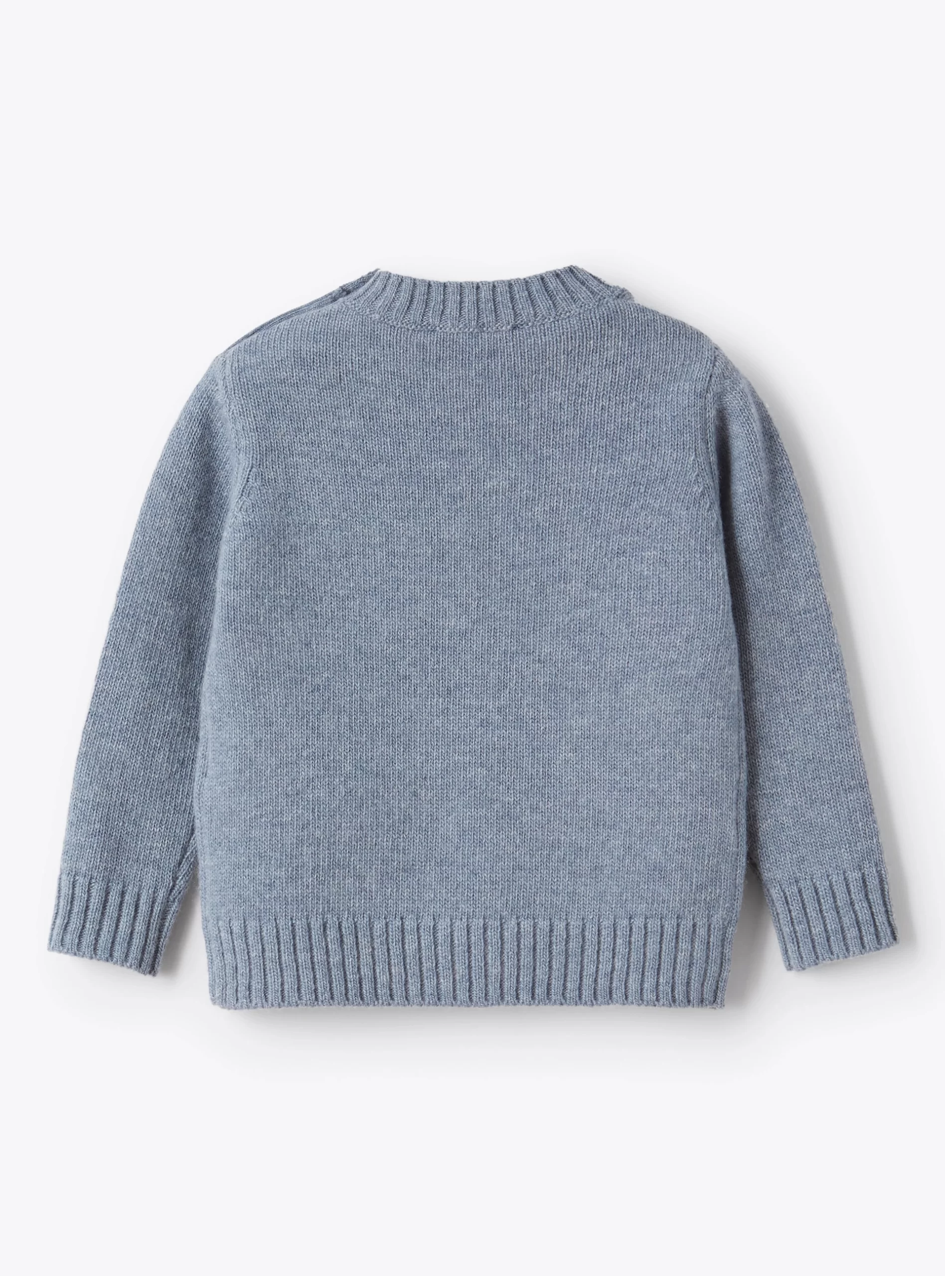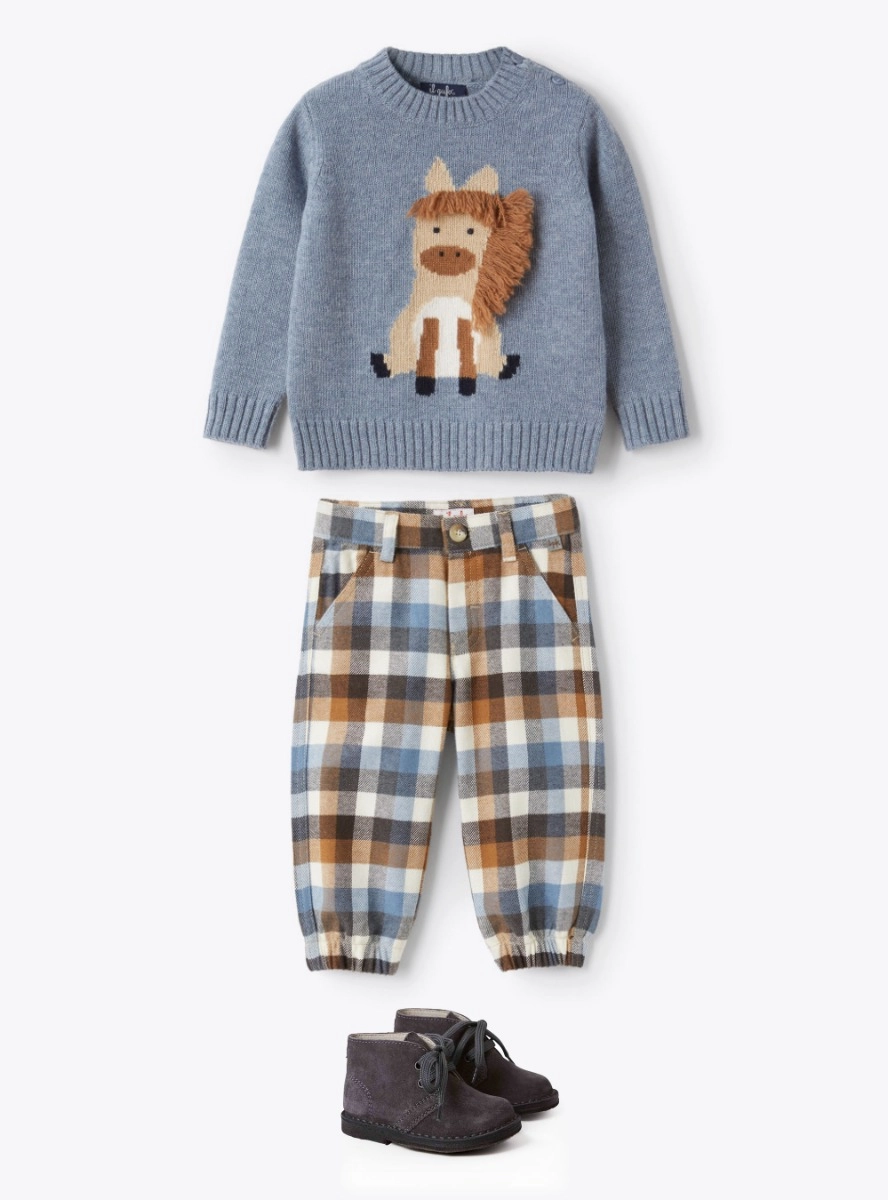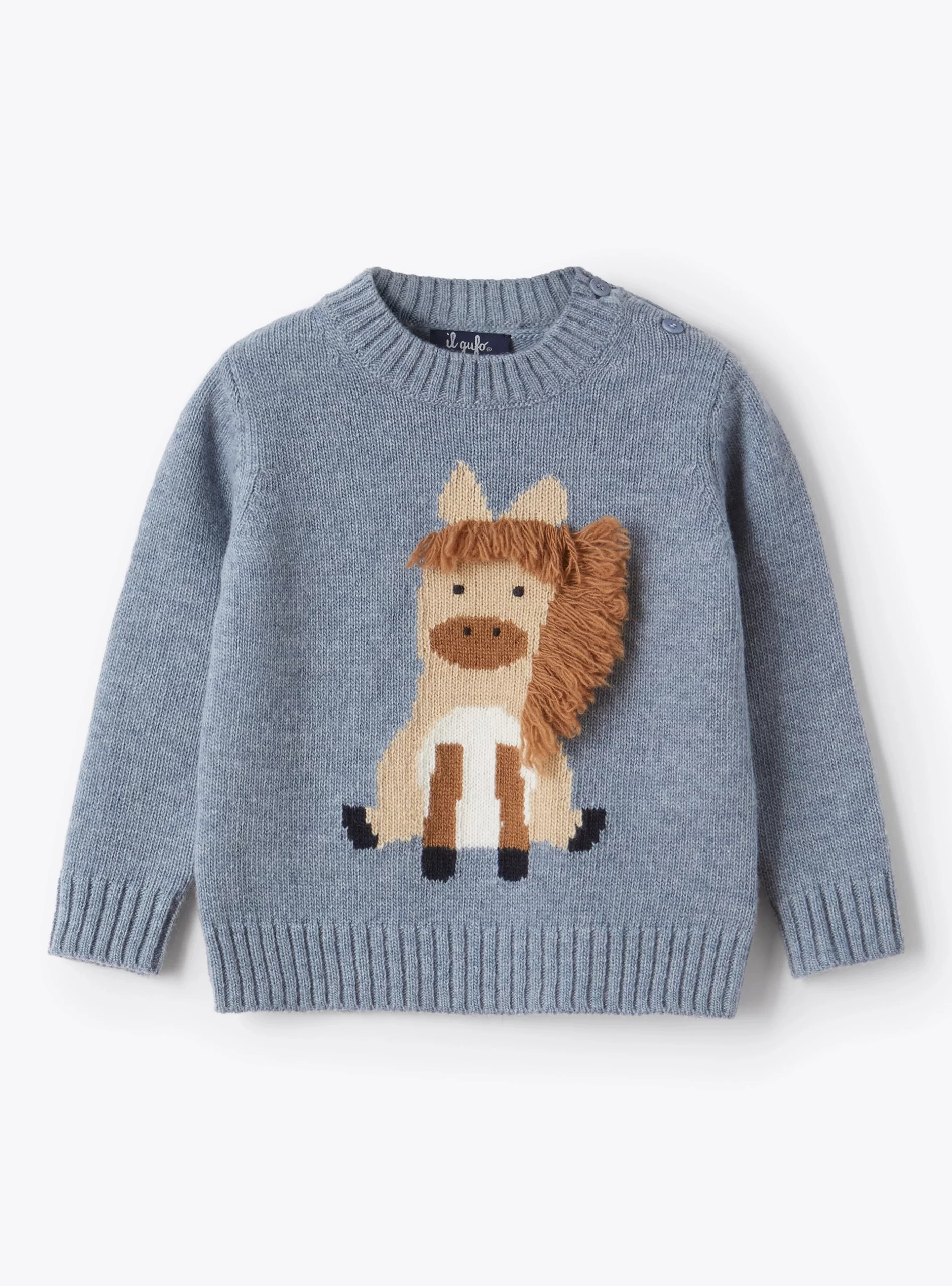 Maglione girocollo in pura lana merino extra fine azzurro polvere certificata ®Woolmark con simpatico cavallino frontale realizzato con ricamo a mano e lavorazione ad intarsio. Le finiture di collo, polsini e fondo sono interamente a costine.