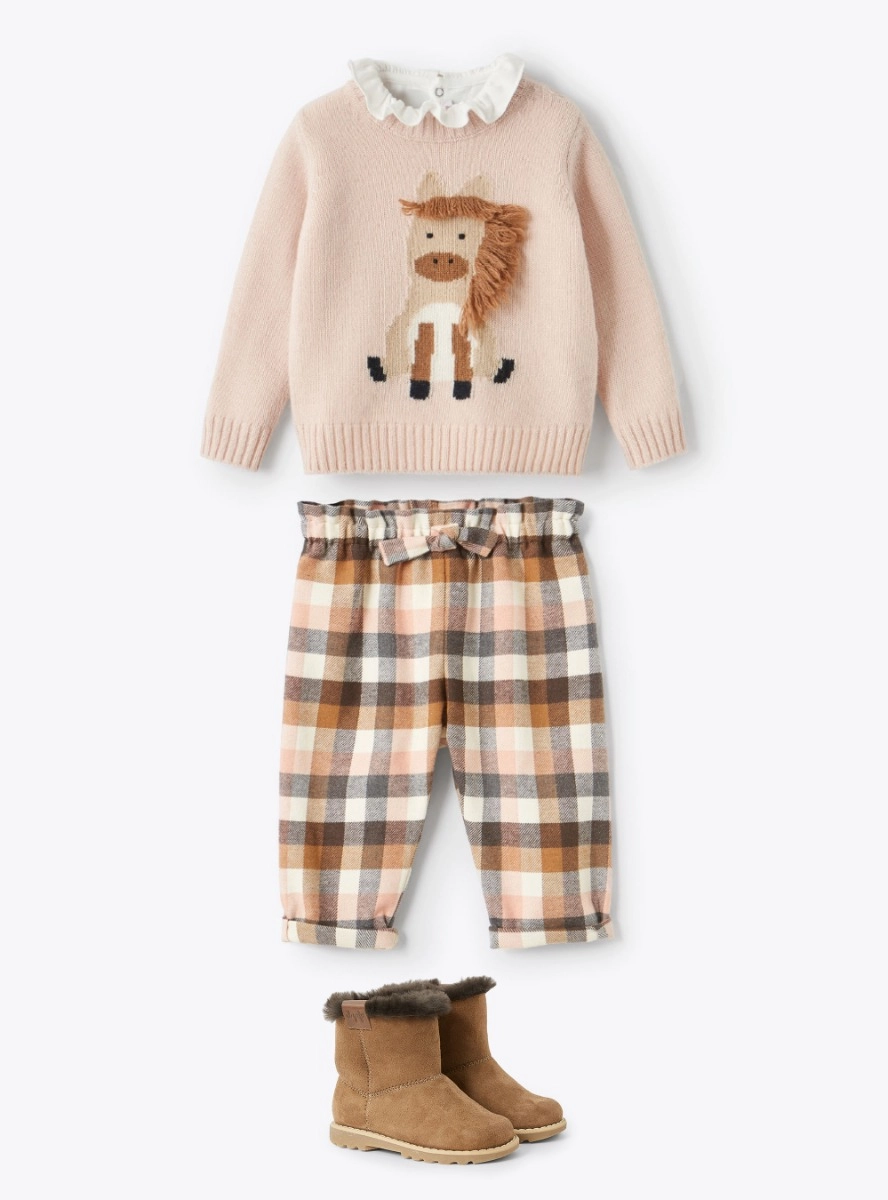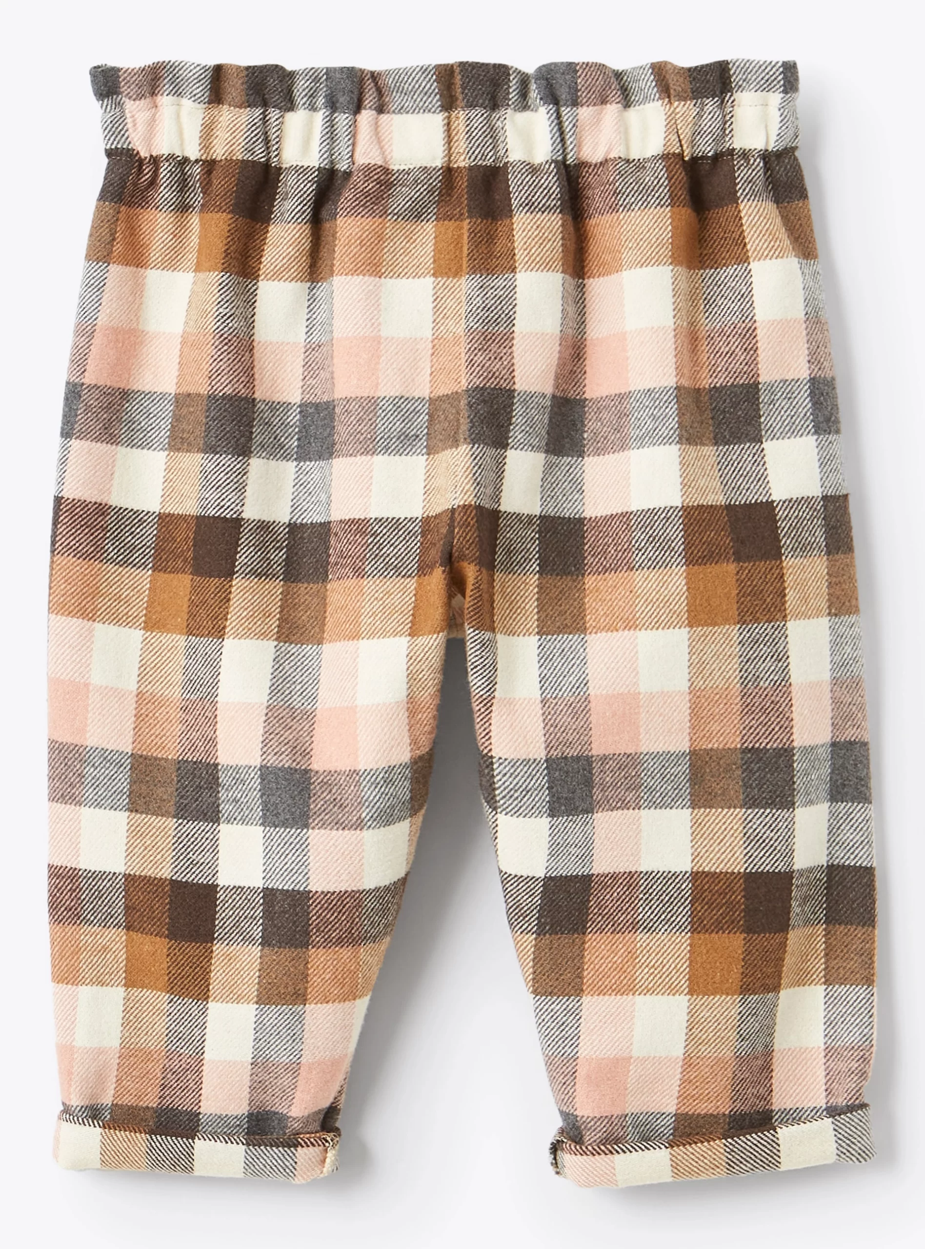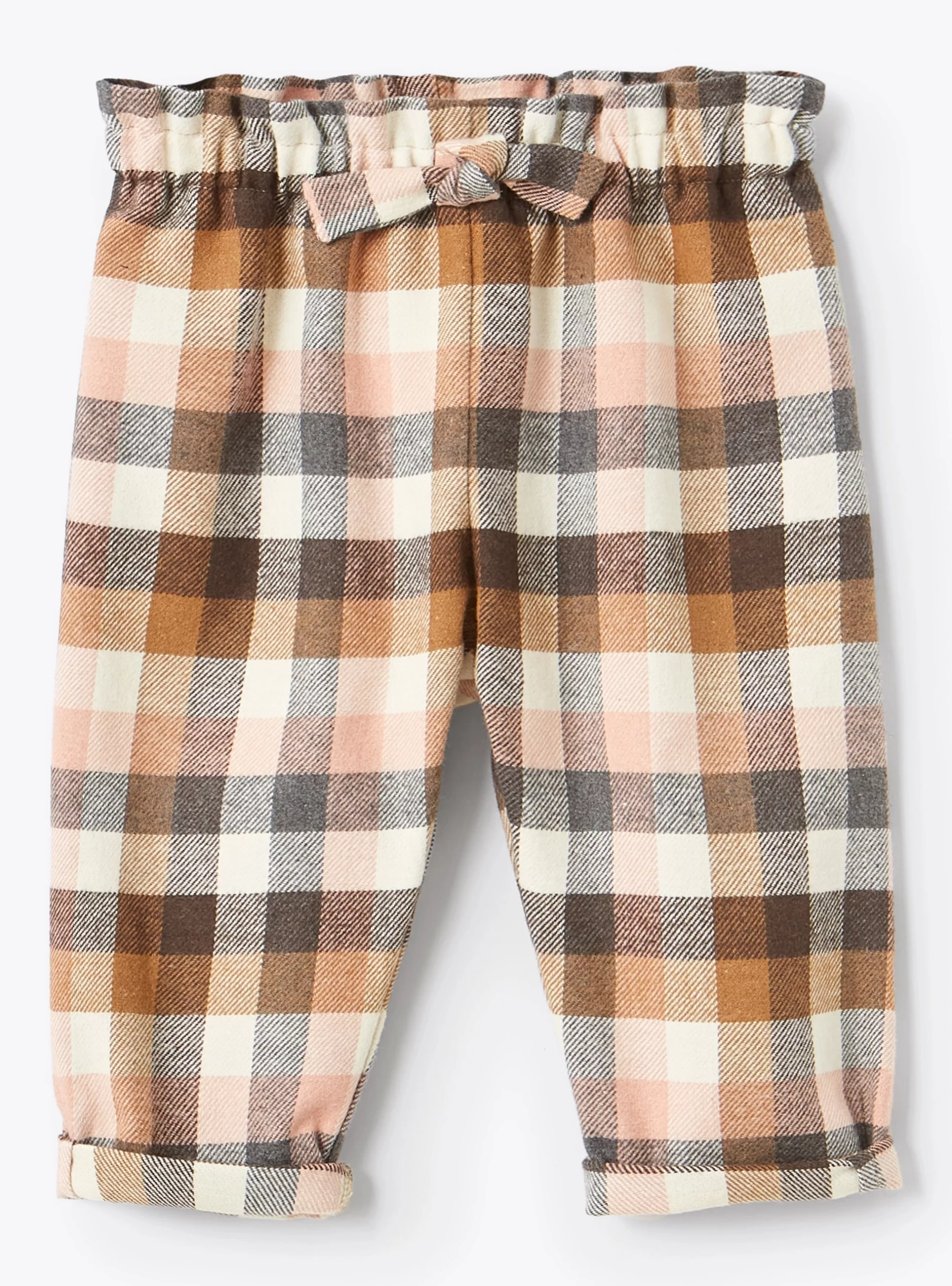 Pantalone da neonata dalla gamba leggermente ampia in cotone con fantasia a quadri sui toni del rosa, del marrone e del beige. Elastico in vita con fiocchetto frontale.