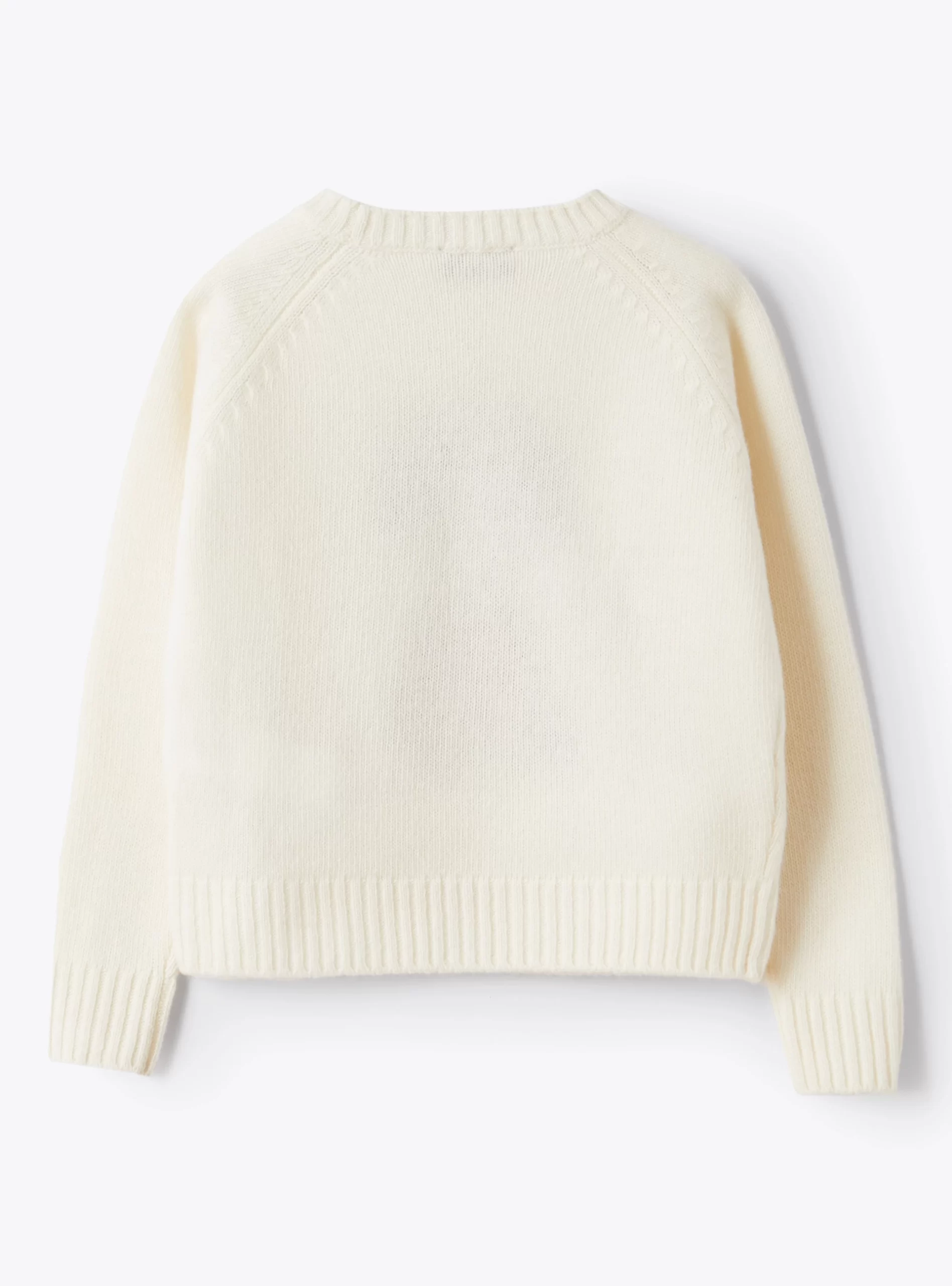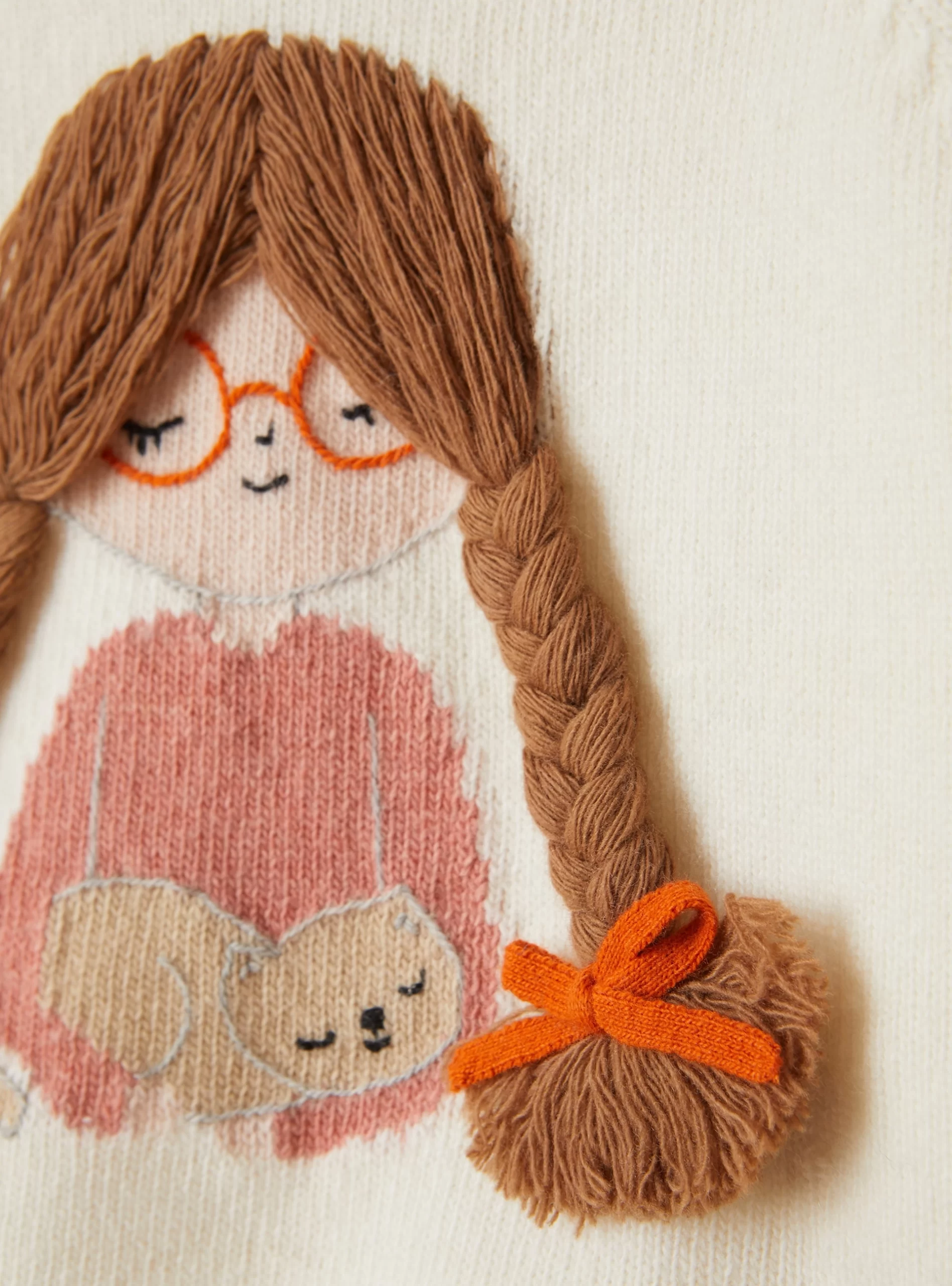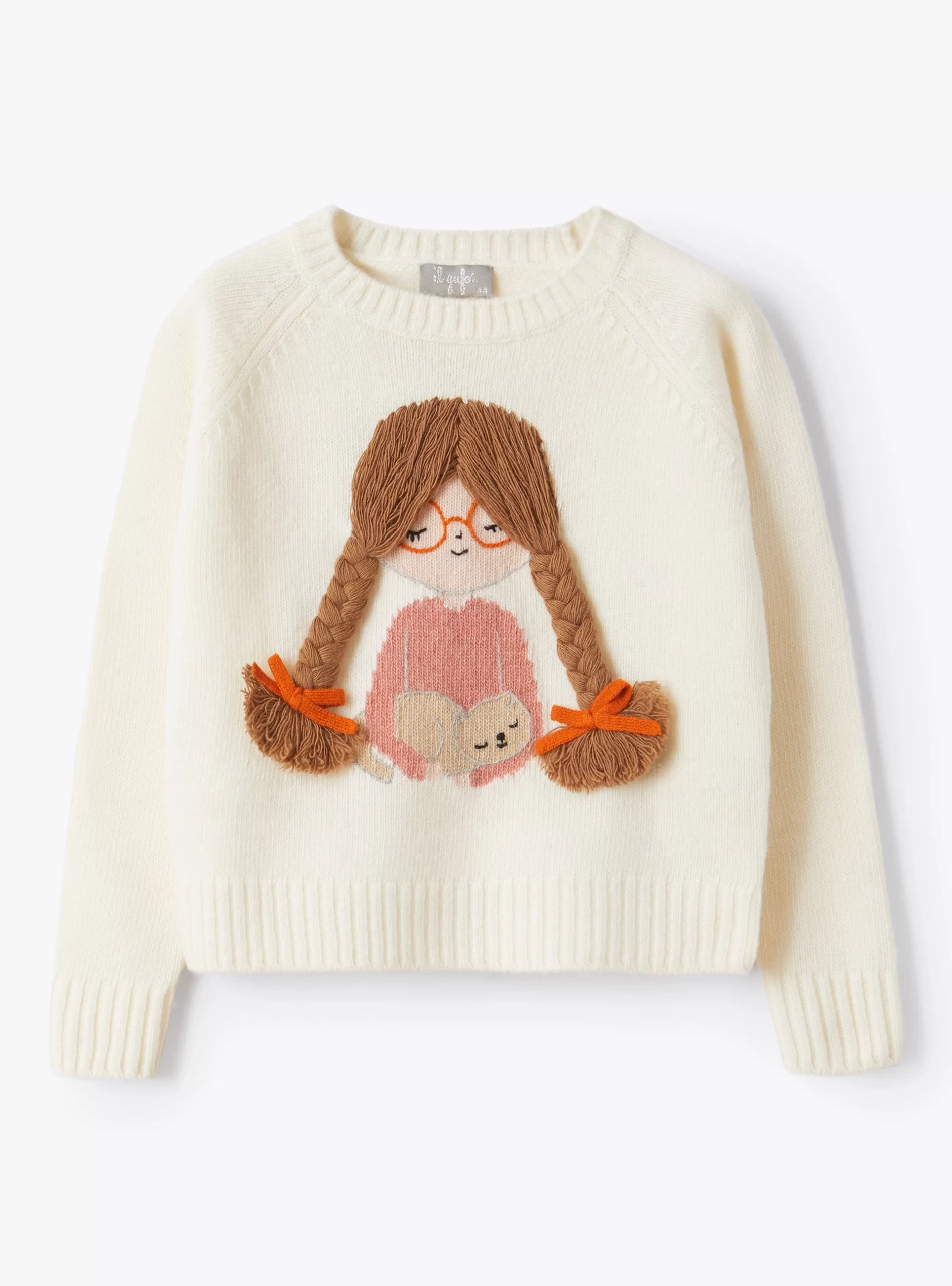 Maglione girocollo in pura lana merino extra fine certificata ®Woolmark di colore bianco latte con ricamo a mano e lavorazione ad intarsio di una bambina che tiene in braccio un gattino. Finiture di collo, orlo e polsini realizzate interamente a costine e vestibilità regular.