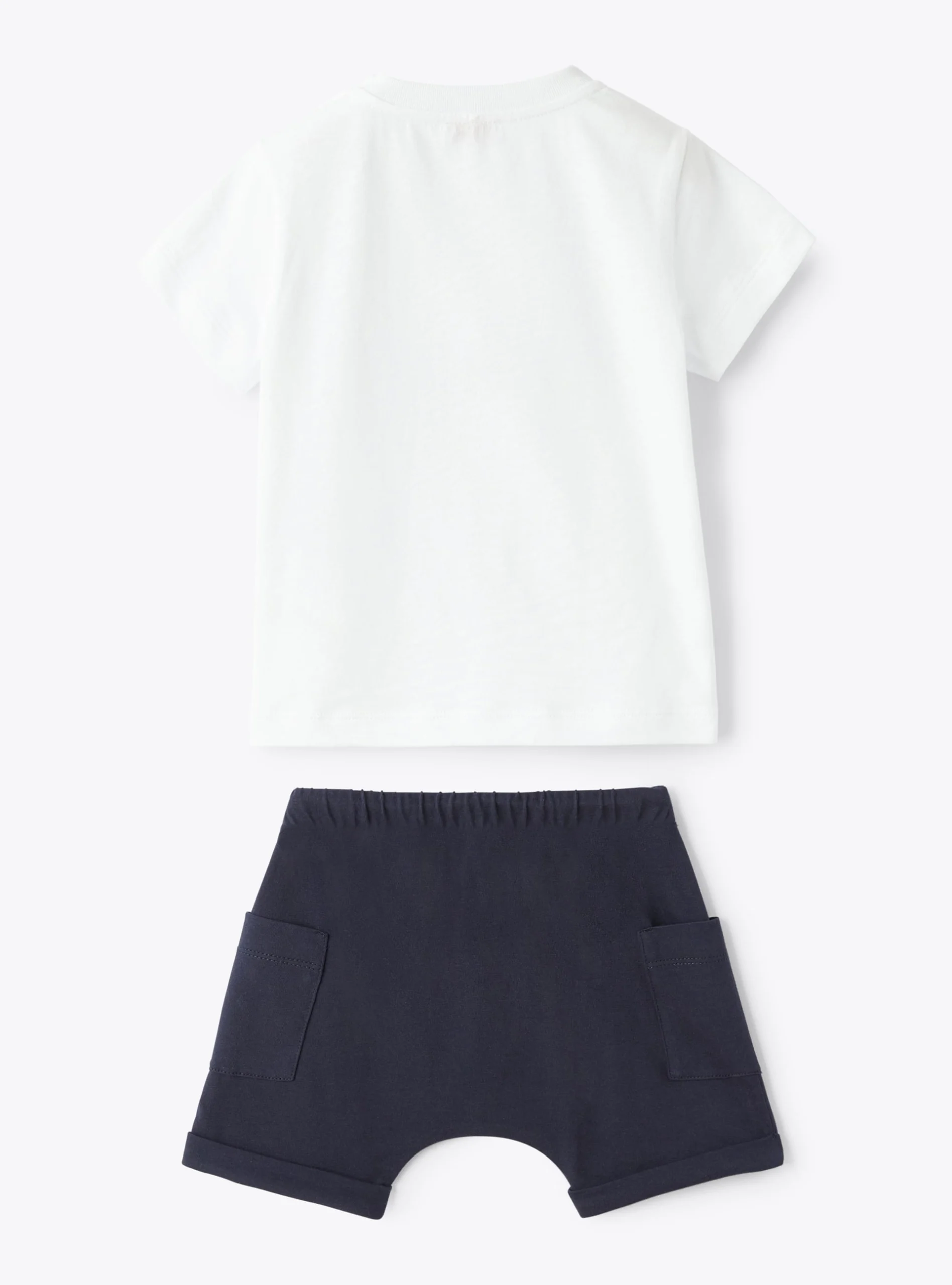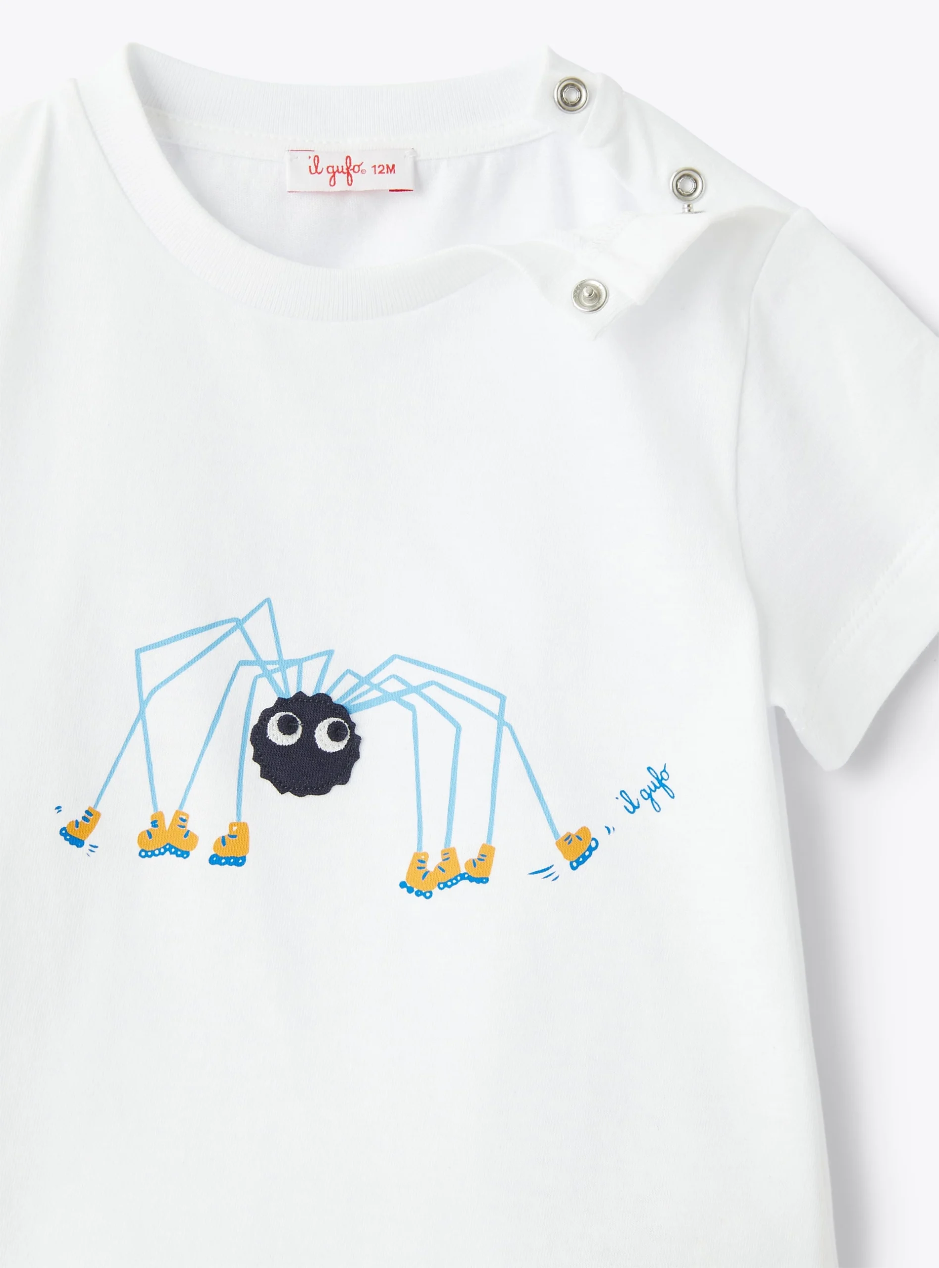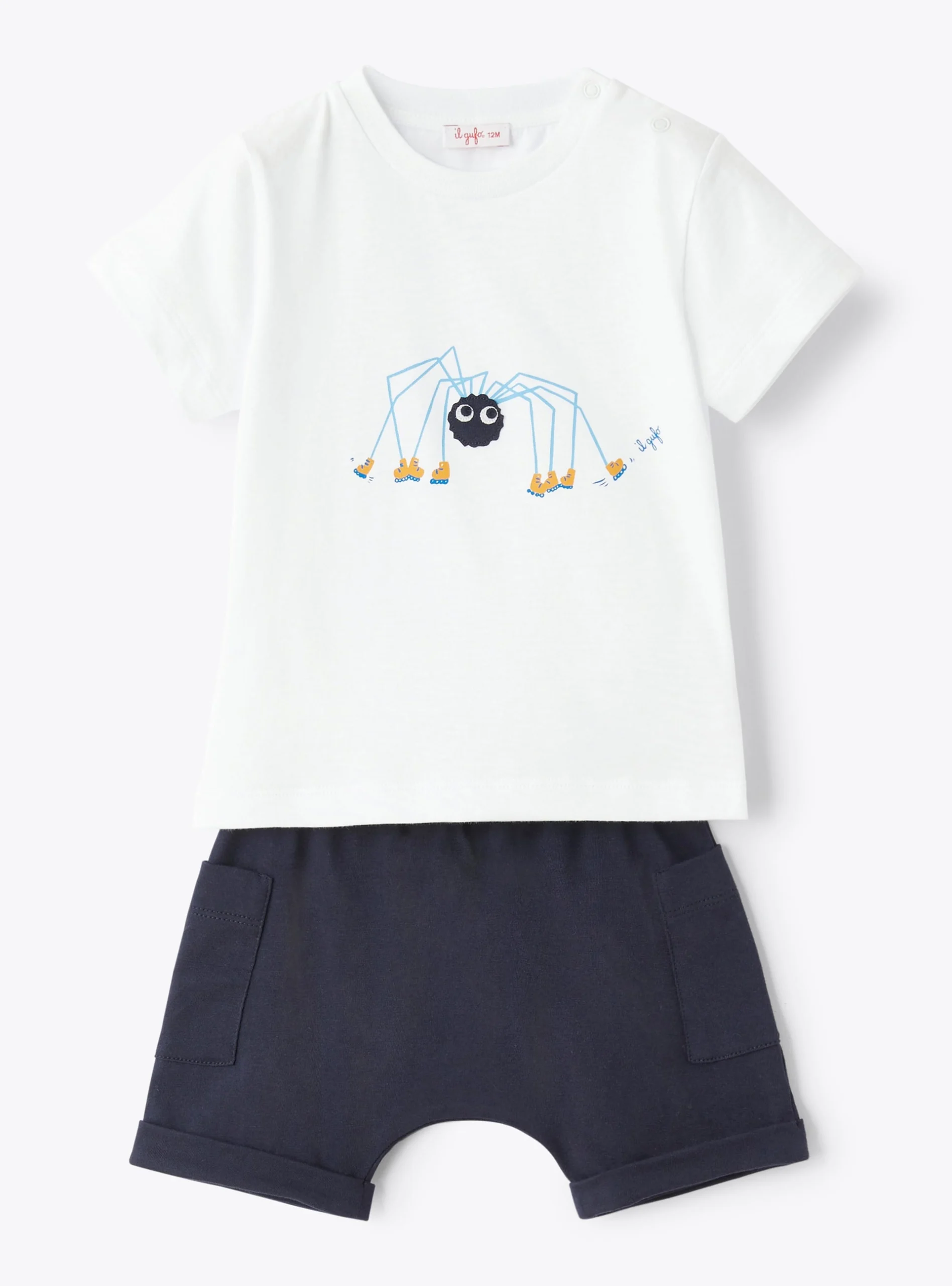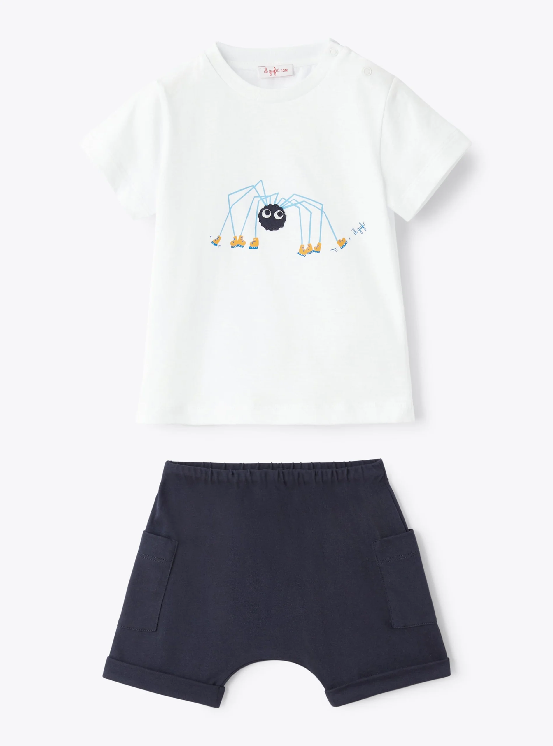 Completo due pezzi da neonato in jersey 100% cotone, realizzato con trattamento microdream che rende il capo più piacevole e morbido al tatto, composto da una t-shirt a manica corta bianca con stampa frontale di un divertente ragno con dettaglio di occhi in rilievo, realizzato con inserto applicato in popeline blu, con zampe e scarpe stampate sui toni del giallo e del celeste come il logo Il Gufo stampato a lato.