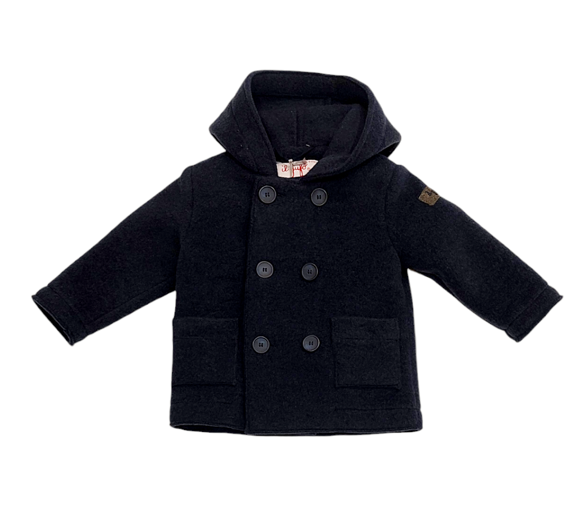 Morbido cappotto da neonato dal design e dalla linea classica con cappuccio e bordi effetto taglio a vivo.