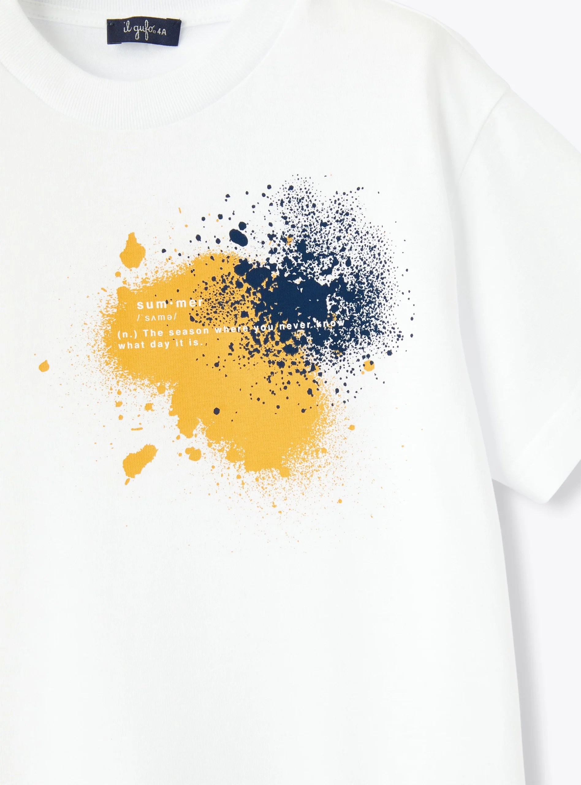T-shirt a manica corta in jersey 100% cotone di colore bianco con motivo di stampa ad effetto spray sui toni del blu e del color cannella con motivo di lettering a contrasto: summer. (n) The season where you never know whay day it is.