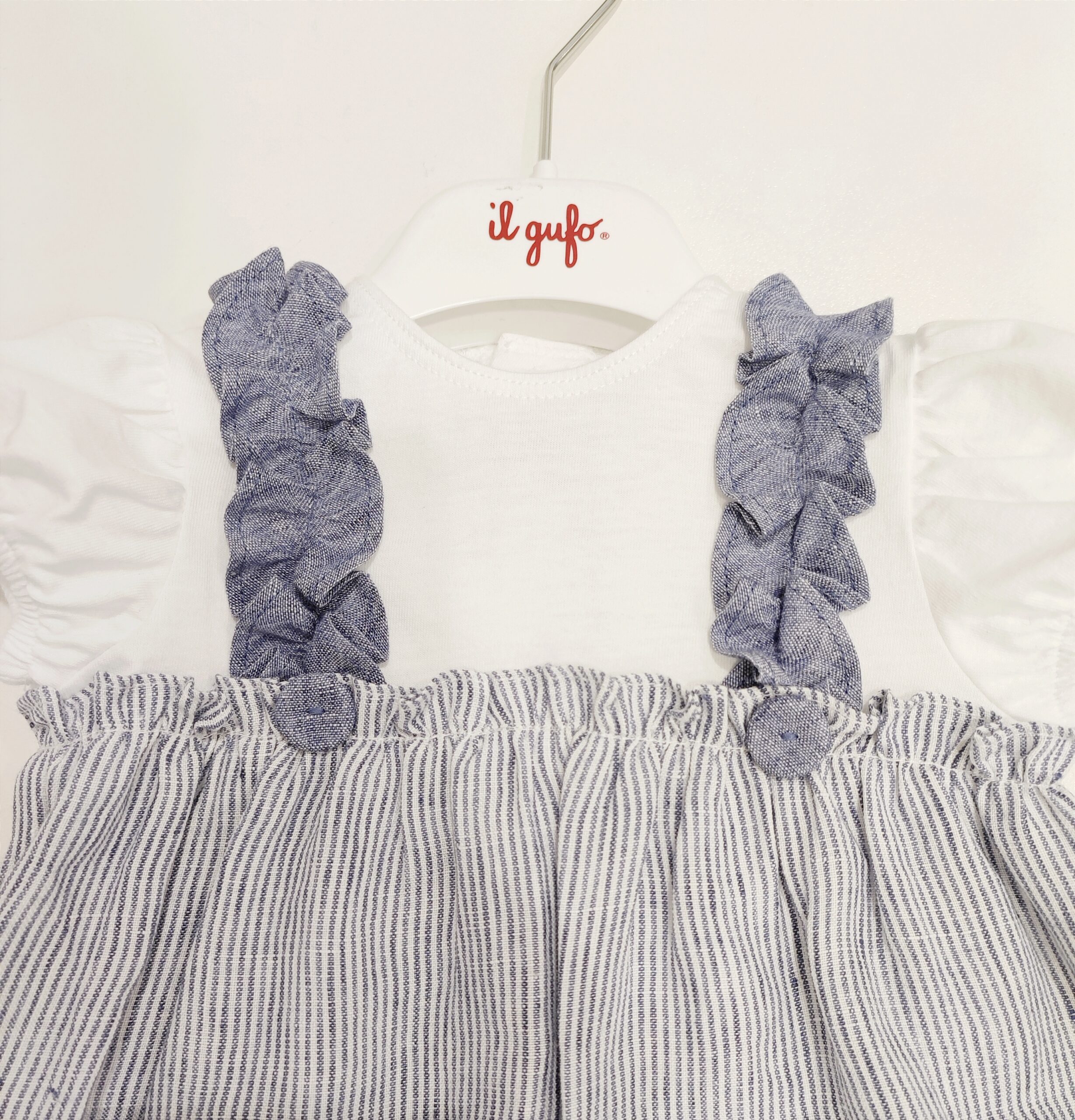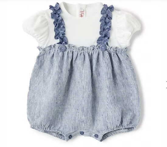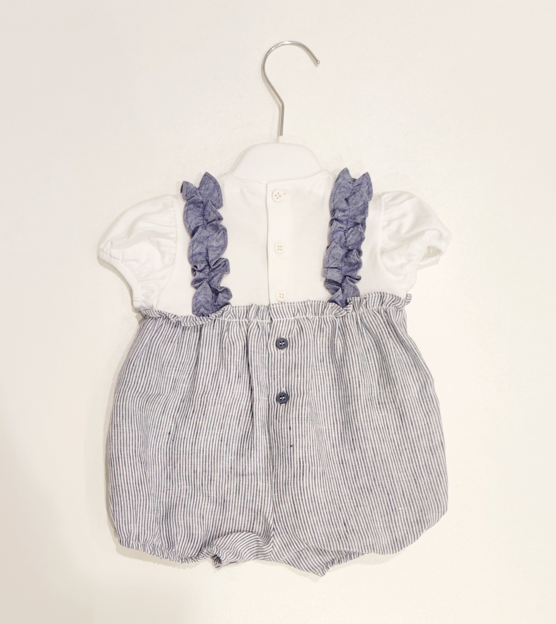 Pagliaccetto da neonata composto da una t-shirt in jersey di cotone bianco con maniche a sbuffo, giromanica elastico e finta salopette in 100% lino a righette azzurre con gioco di arricciature in vita e bretelle volant in tinta unita. Bottoncini su fondo elastico e sul retro del capo.