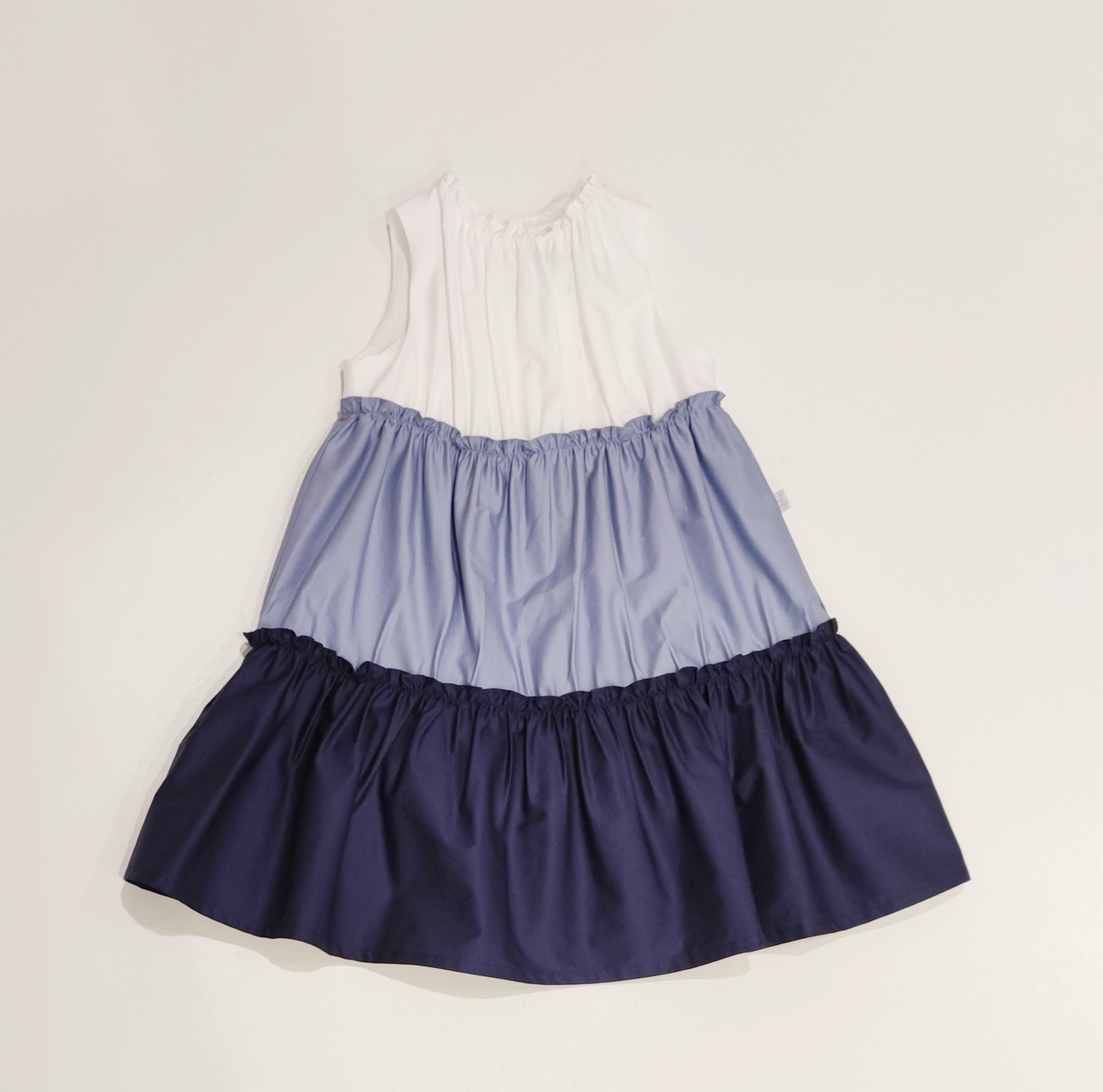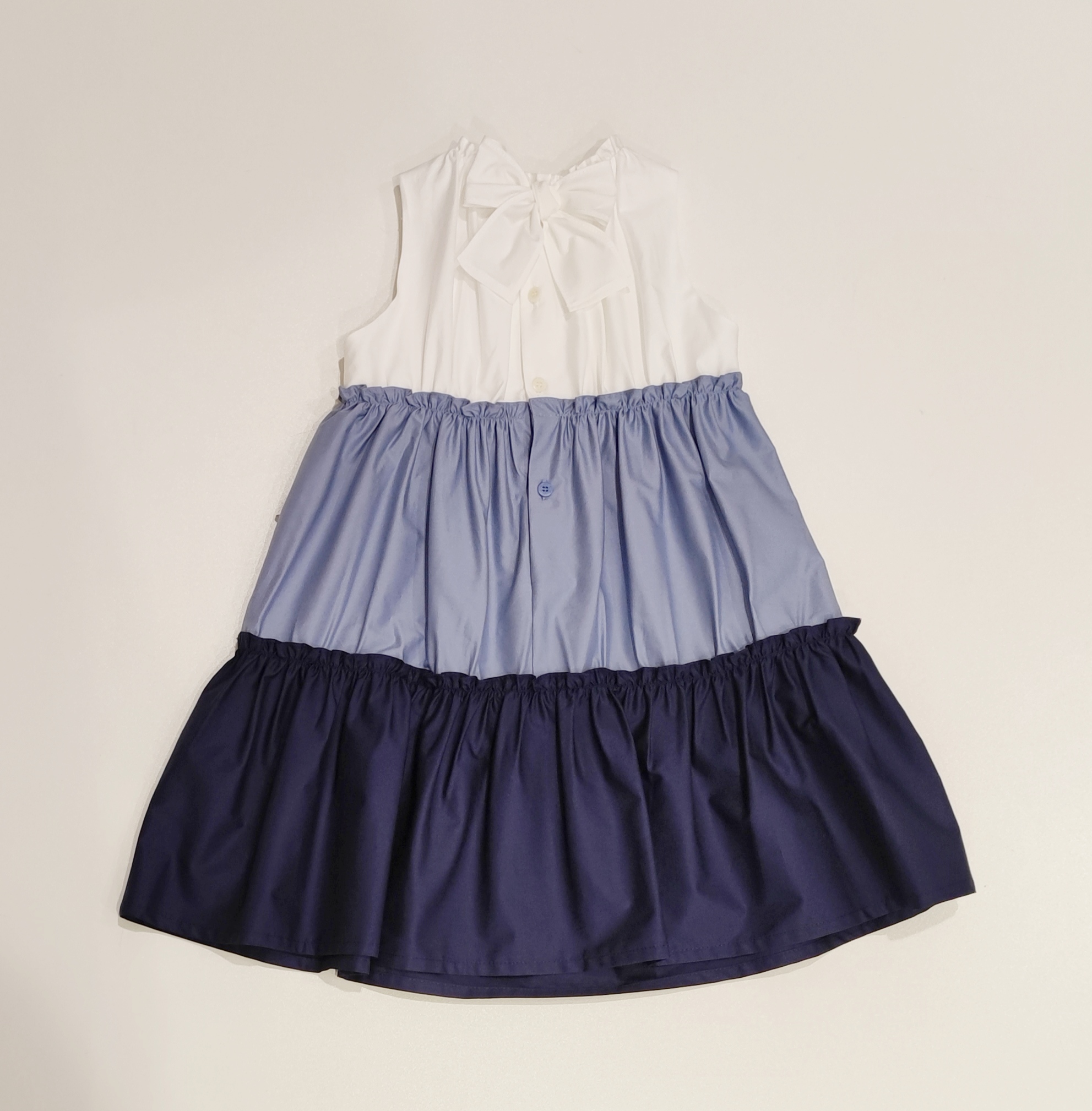 SeVestito in popeline bianco con doppia balza in bianco, azzurro e blu. Chiusura sul retro con bottoncini e fiocco.