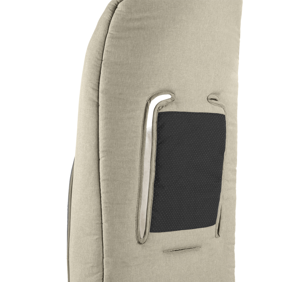 Inserto posteriore in materiale antiscivolo con apertura per il passaggio delle cinture di sicurezza.