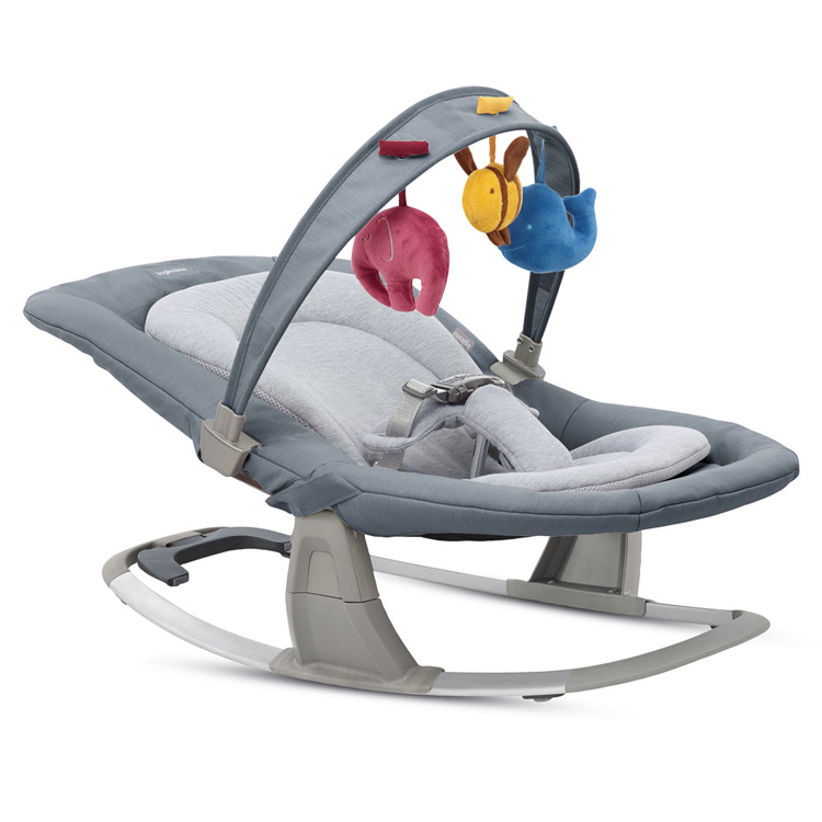 La forma curvata del telaio è progettata per garantire un dondolio dolce e armonico, con leva di blocco. La barra dei giochi è agganciabile in diverse posizioni con tre simpatici personaggi, colori e suoni ed elementi tattili unici. Music box con 3 melodie musicali con regolazione del volume.