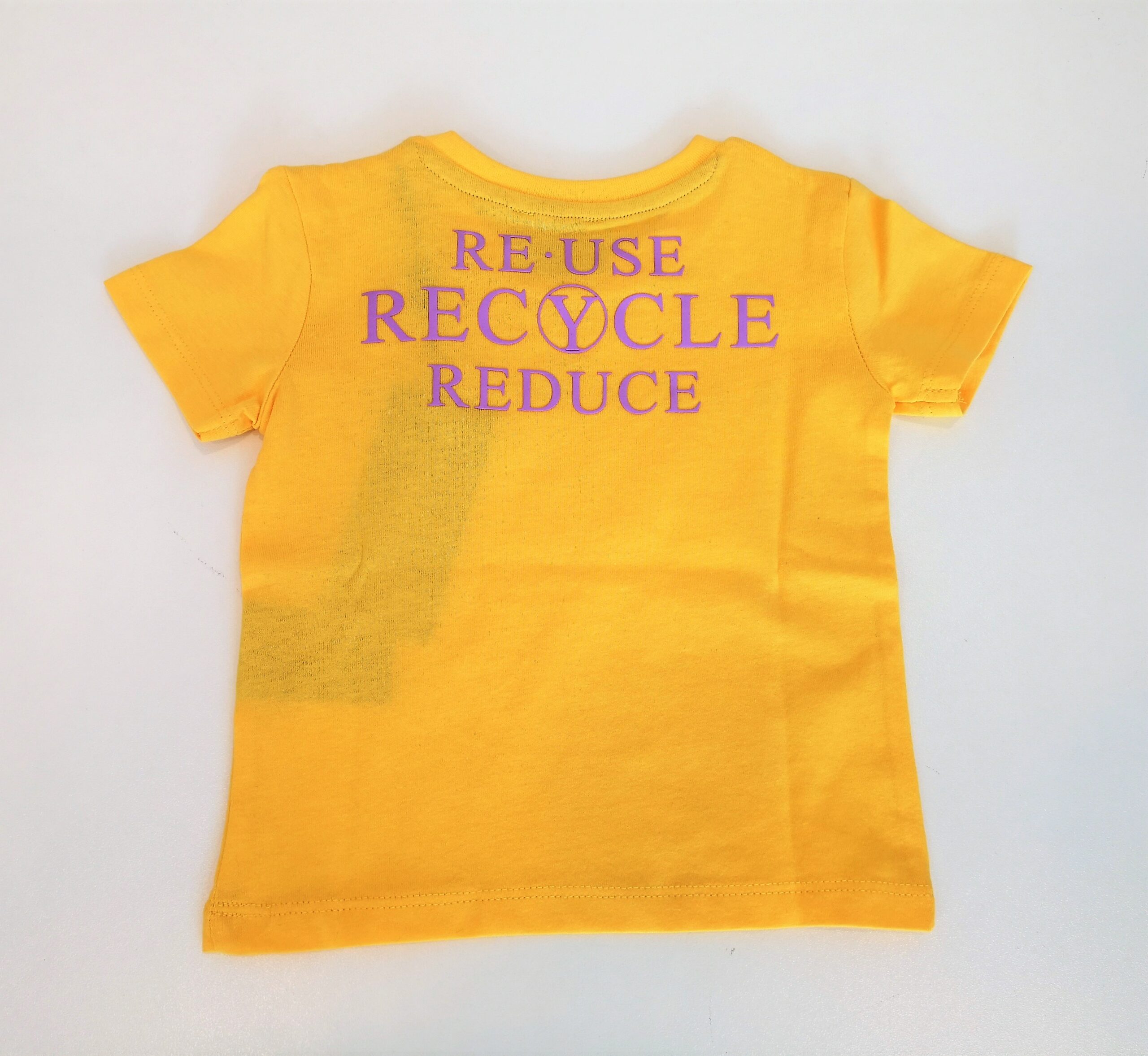 T-shirt manica corta gialla con scritte in contrasto color glicine. Bottoncini su una spalla per una facile indossatura.