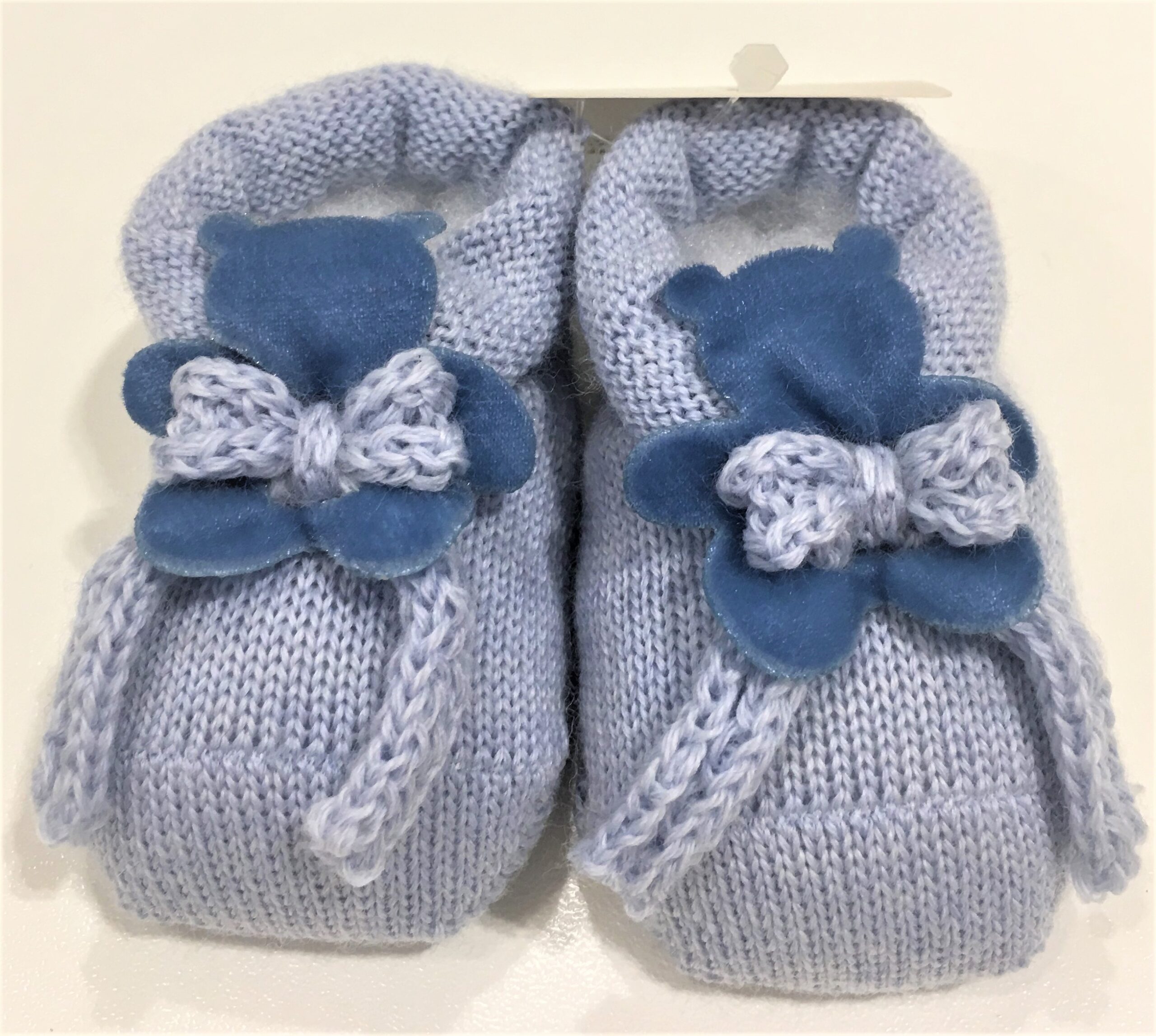 Scarpina in lana LA PERLA, colore cielo con orso velvet e fiocchetto.