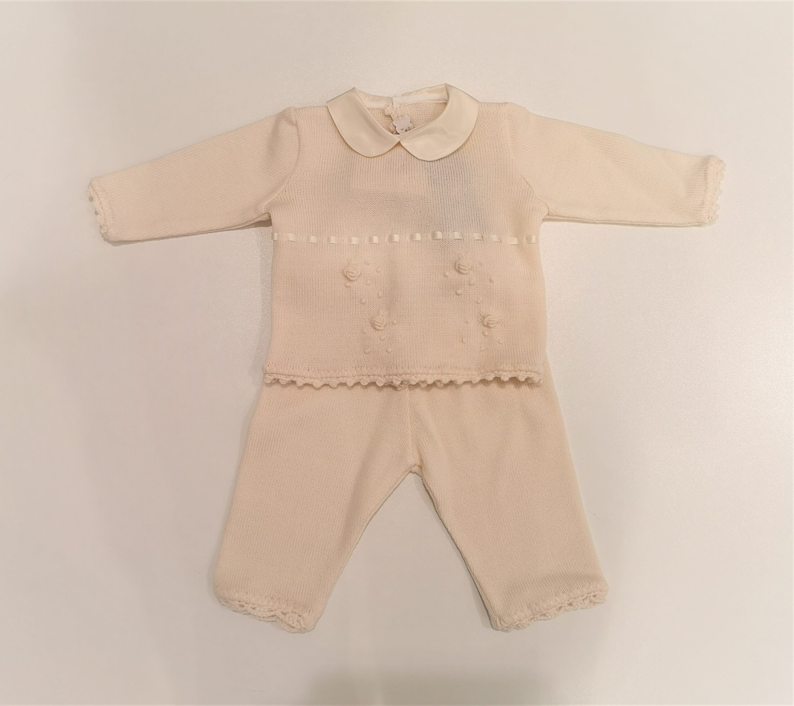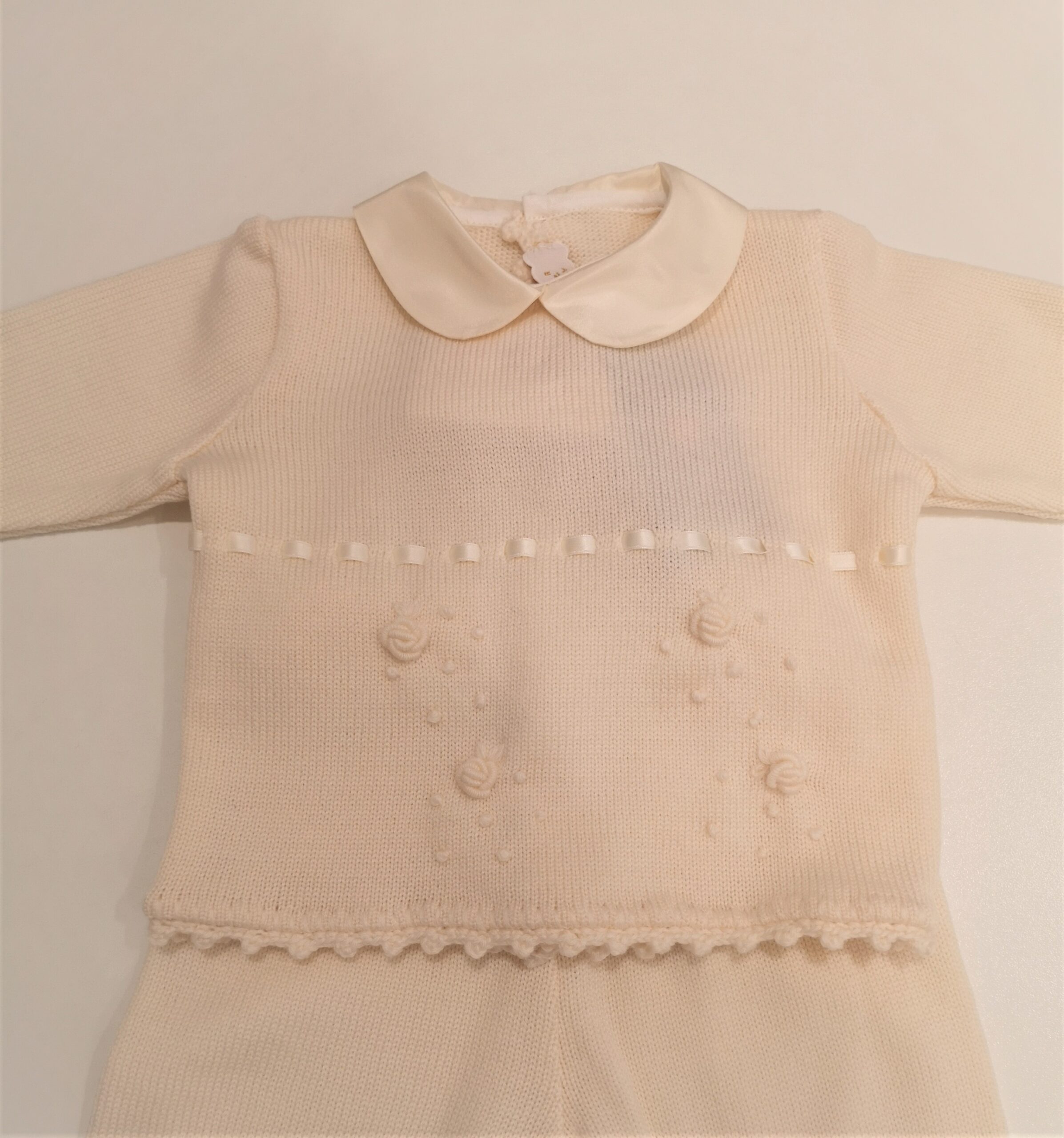 Completo nascita in maglia di lana color panna, collettino in tessuto e ricami di fiorellini e nastro di raso tono su tono. Ghettina senza piedini.