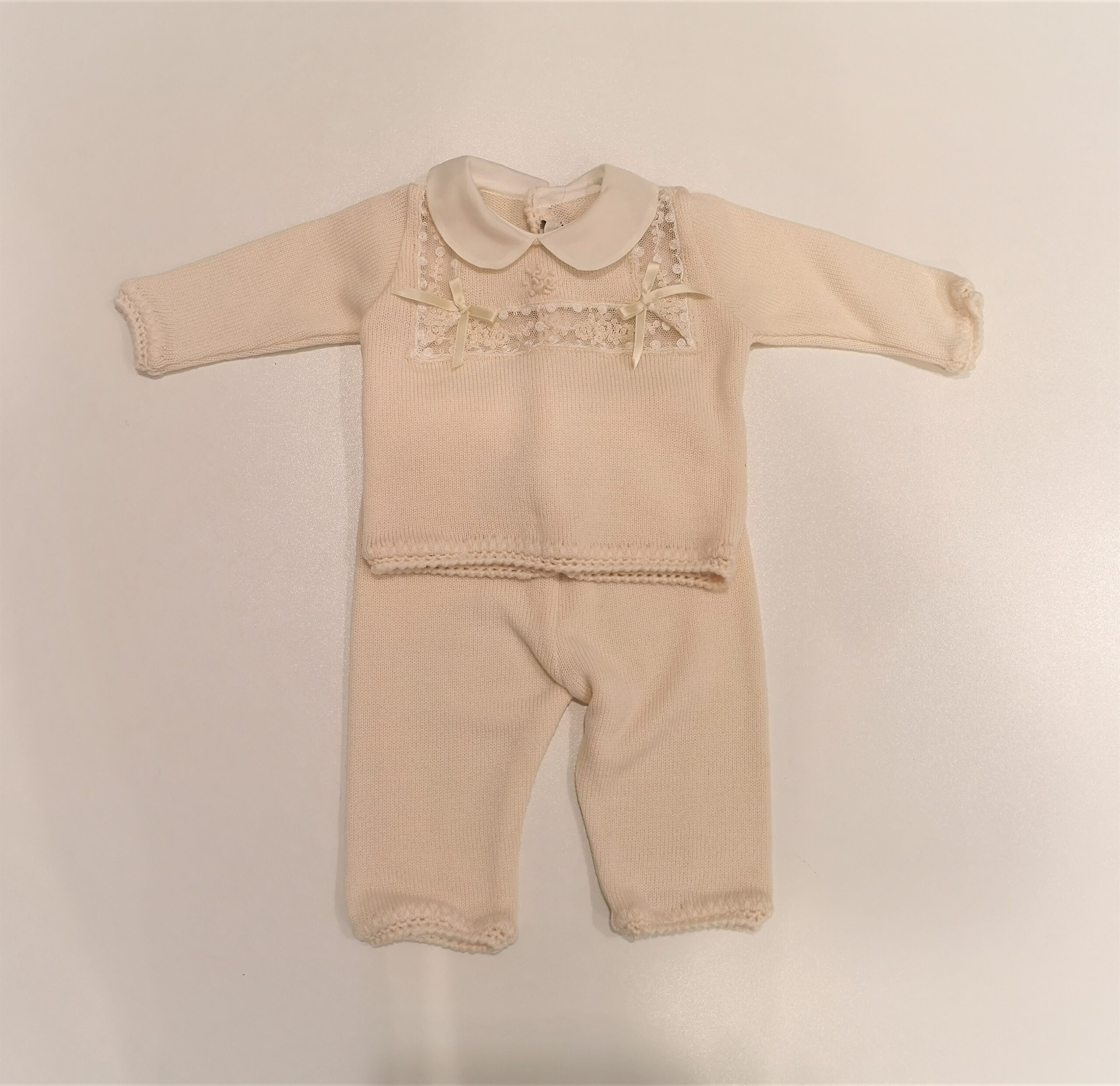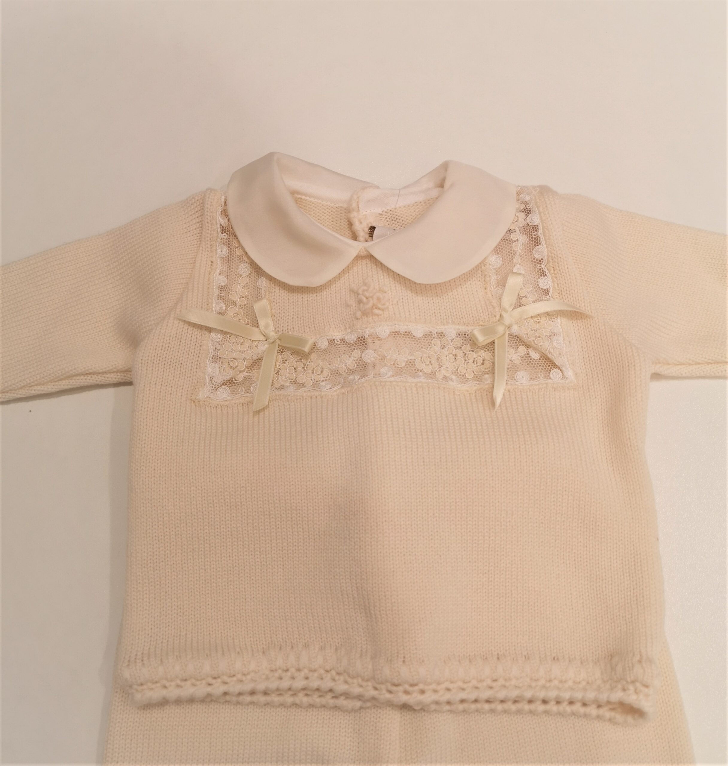 Completo nascita in maglia di lana color panna, collettino in tessuto e ricami di fiorellini, applicazione di pizzo e fiocchetti di raso tono su tono. Ghettina senza piedini