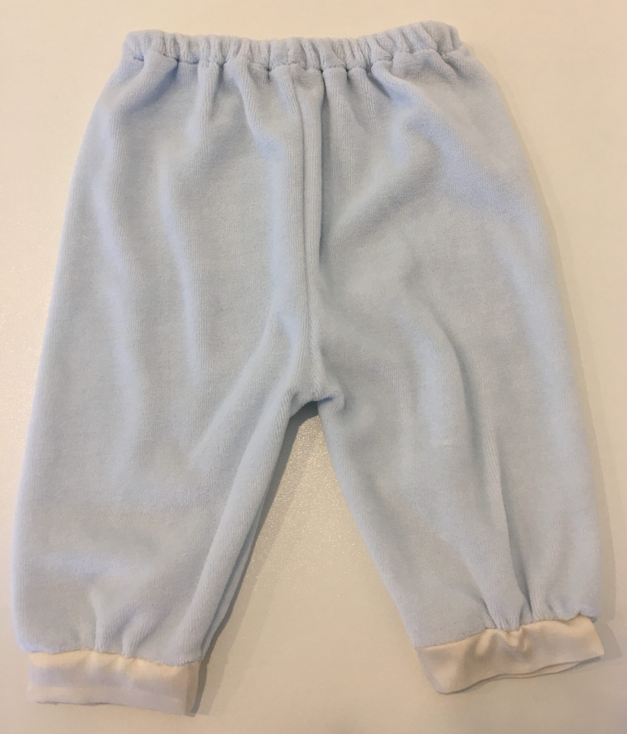 Completo nascita coprifasce in ciniglia 2 pezzi: maglia con bottoncini dietro, colletto in tessuto panna, orsacchiotto davanti in lana + pantaloni senza piedini con riporti in tessuto