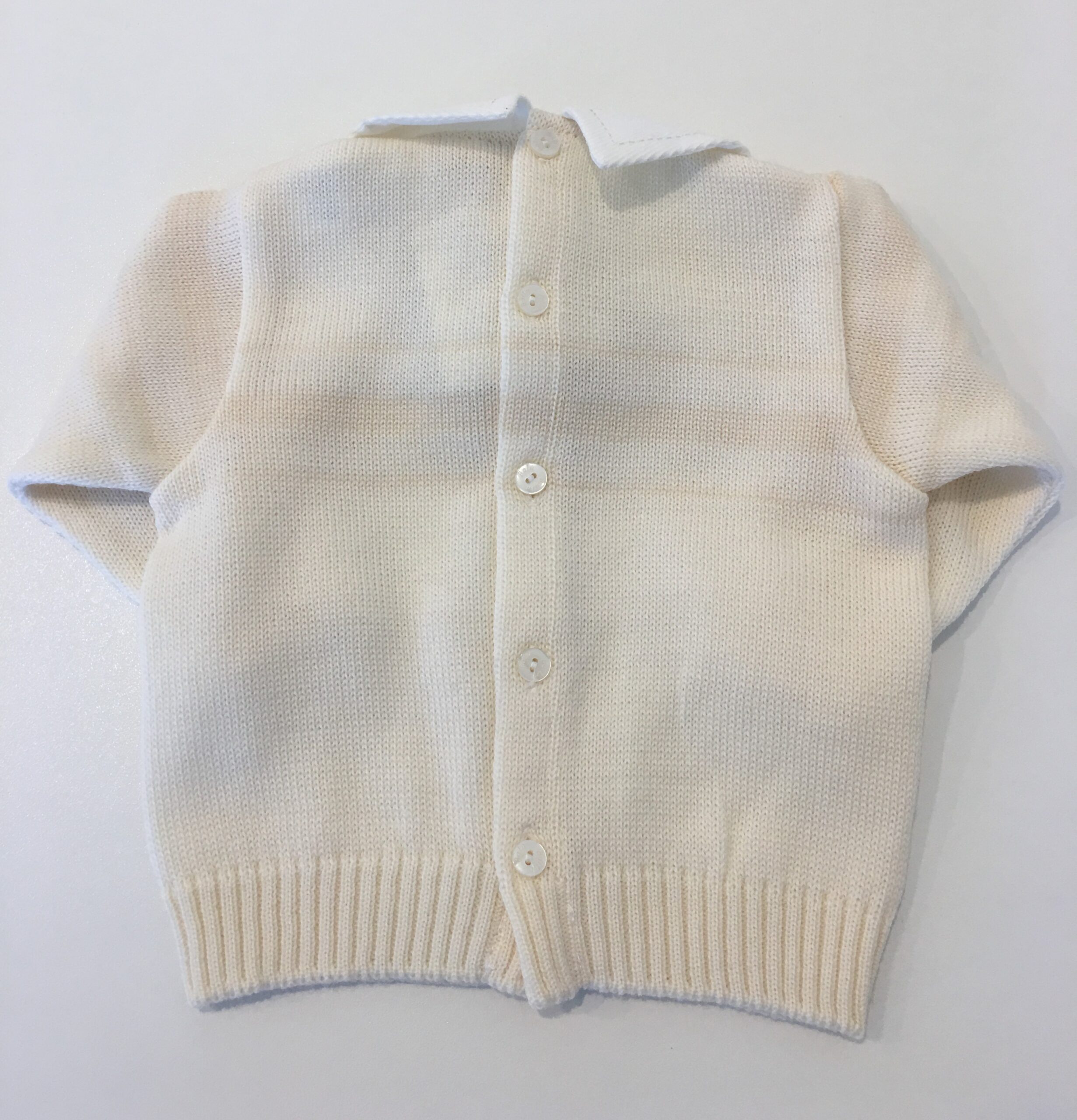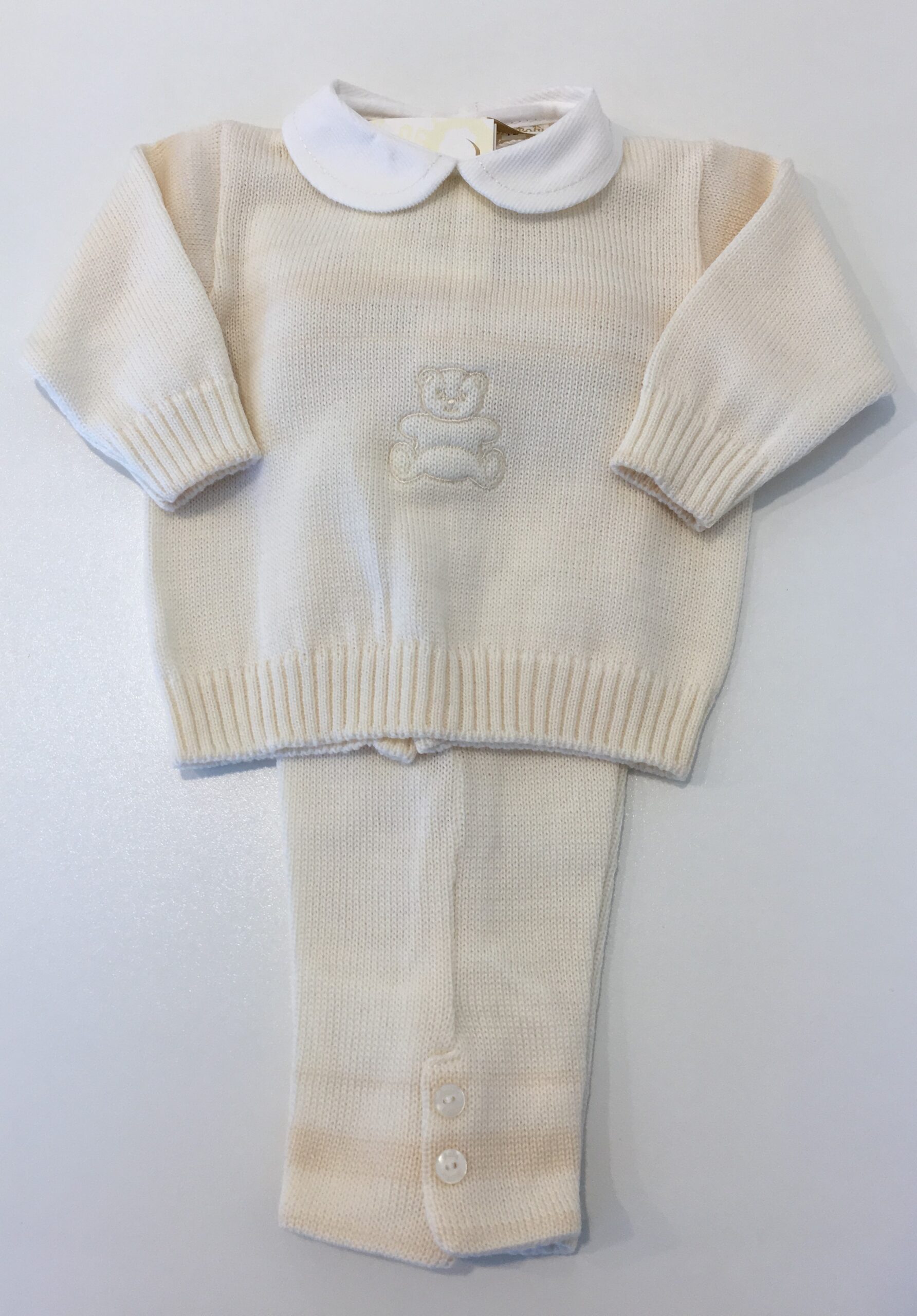 Completo nascita coprifasce in lana 2 pezzi: maglia con bottoncini dietro, colletto in tessuto, ricamo orsacchiotto tono su tono. La maglia presenta delle fasce in beige chiarissimo riprese nei pantaloni.