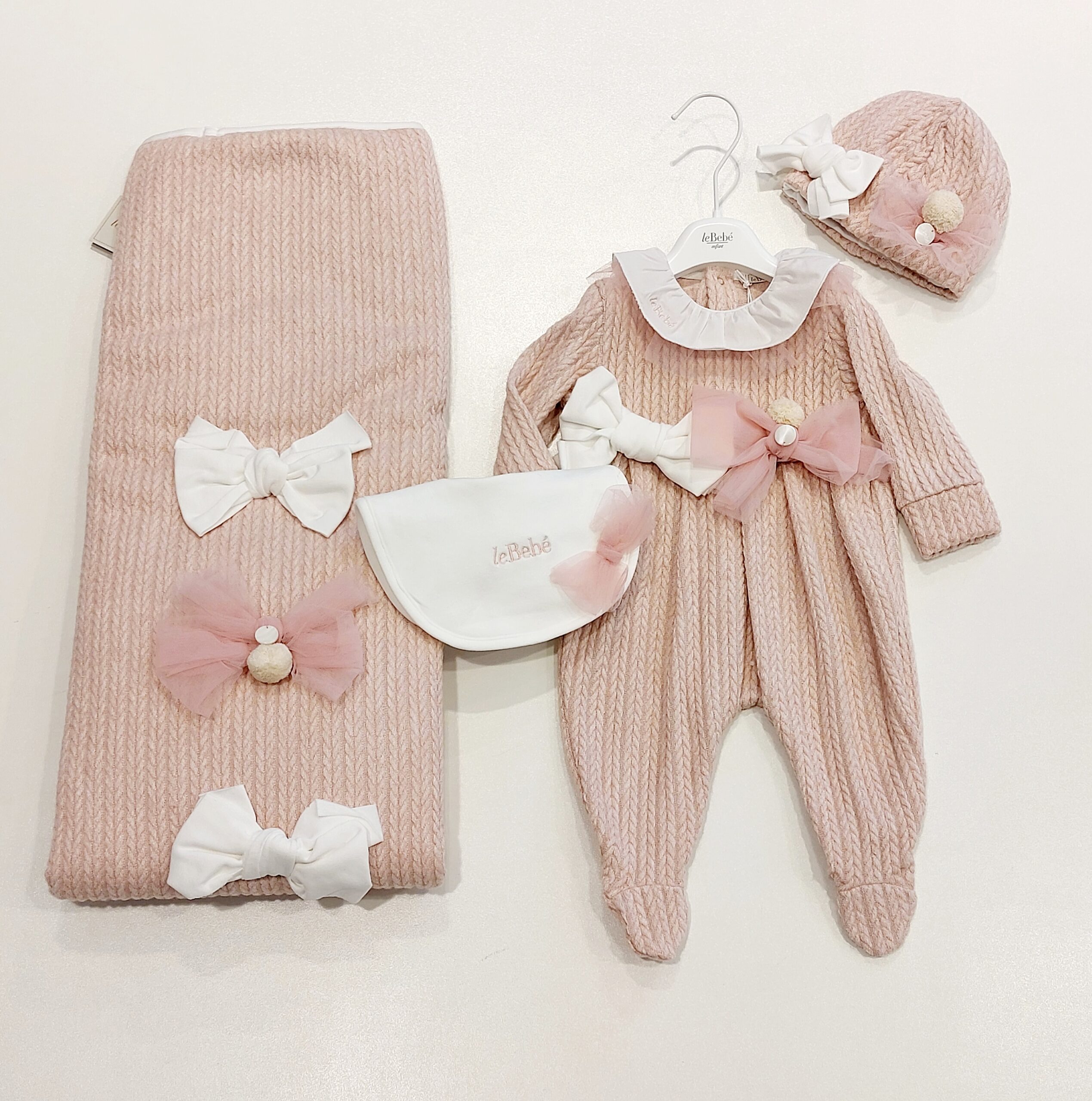 LE BEBE’ Coordinato tutina in maglia rosa con fiocchi corredino nascita neonata
