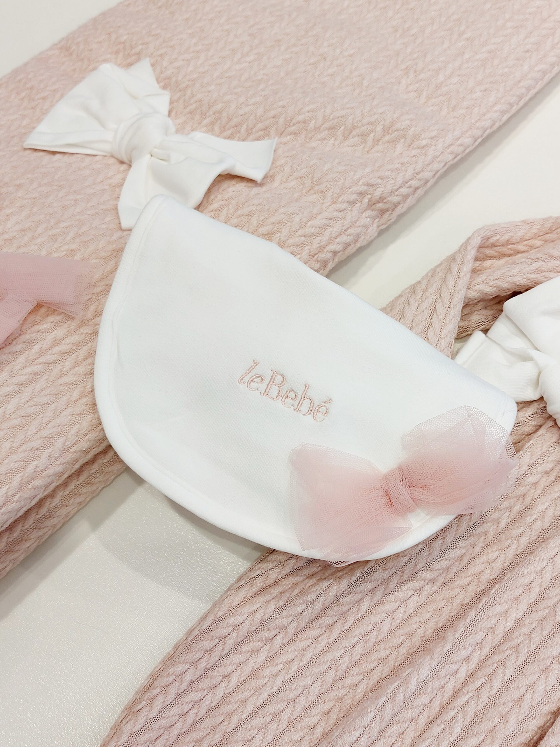 Bavetta bianca con fiocchetto in tulle rosa e scritta Le Bebé.
