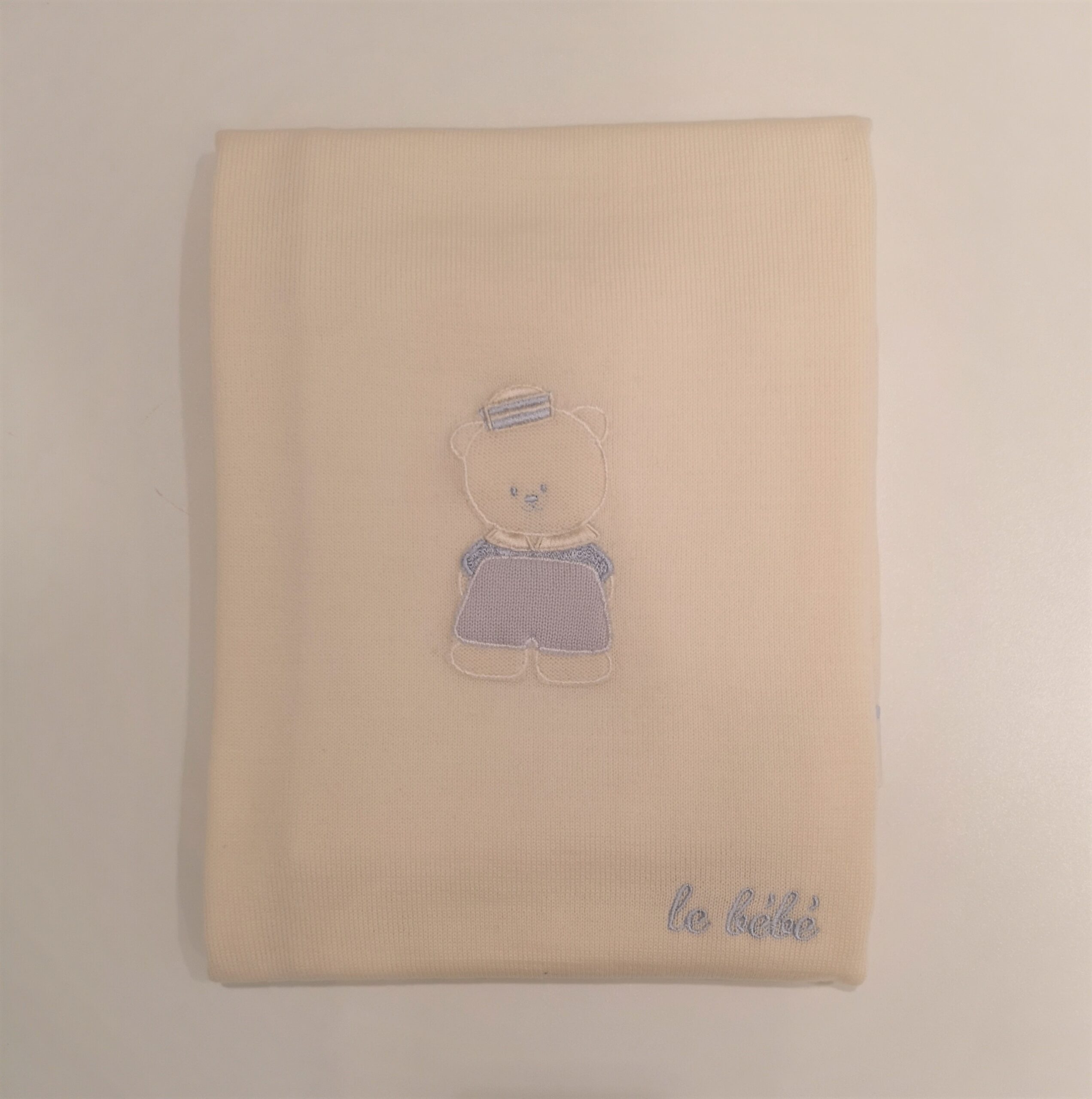 Copertina in maglia di lana panna con applicazione centrale orsetto azzurro e logo. Bordo in tessuto bianco e azzurro