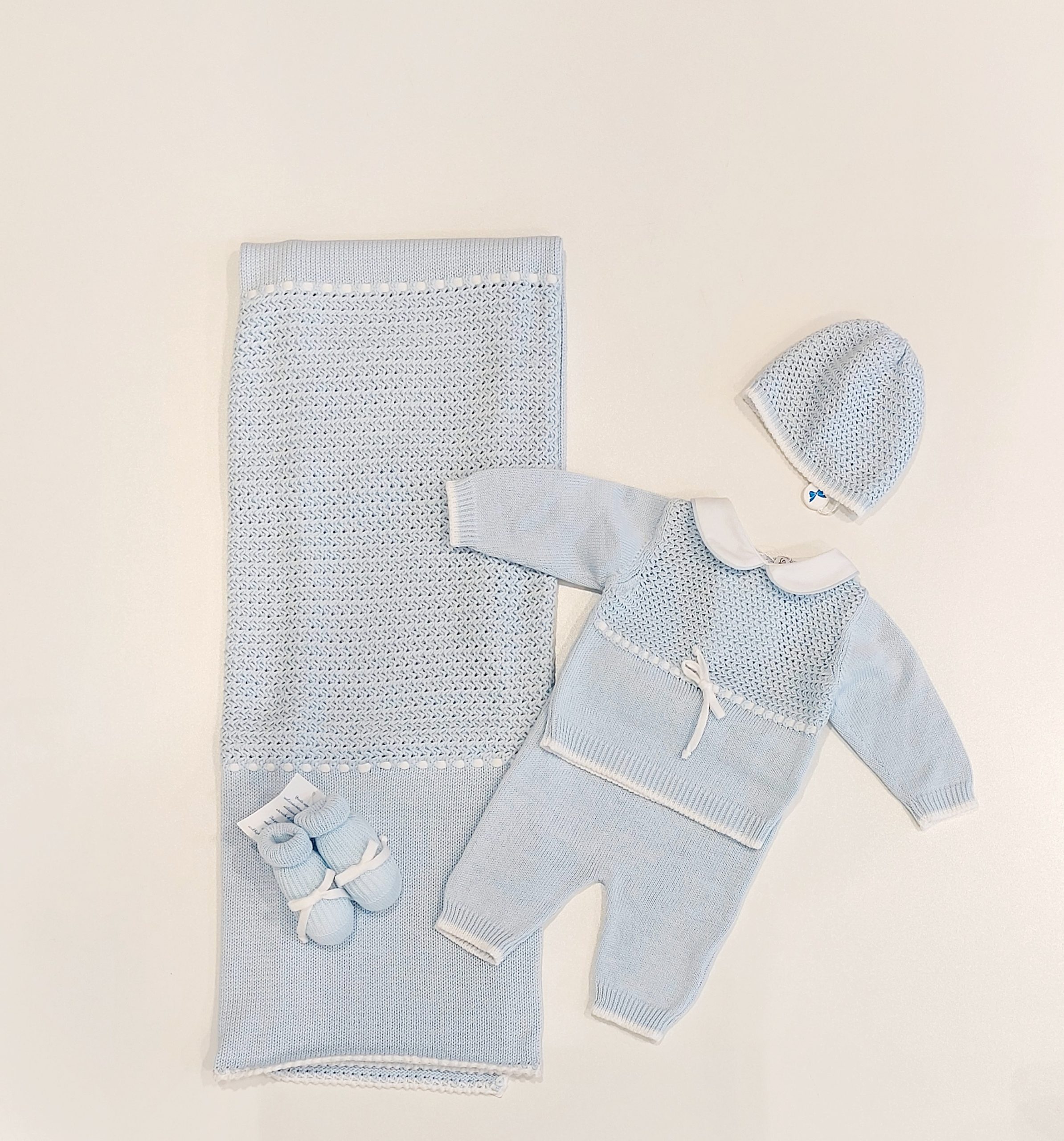 Completo 4 pezzi: copertina celeste in maglia di cotone con lavorazione effetto rete nella parte centrale. Coprifasce abbinato con collettino rotondo bianco completo di babbucce e cuffietta abbinati