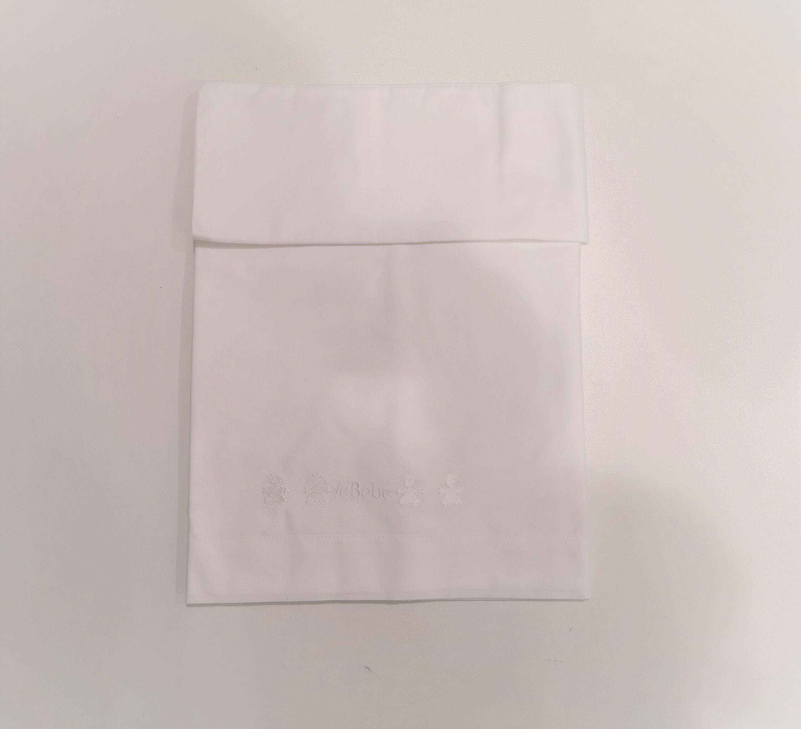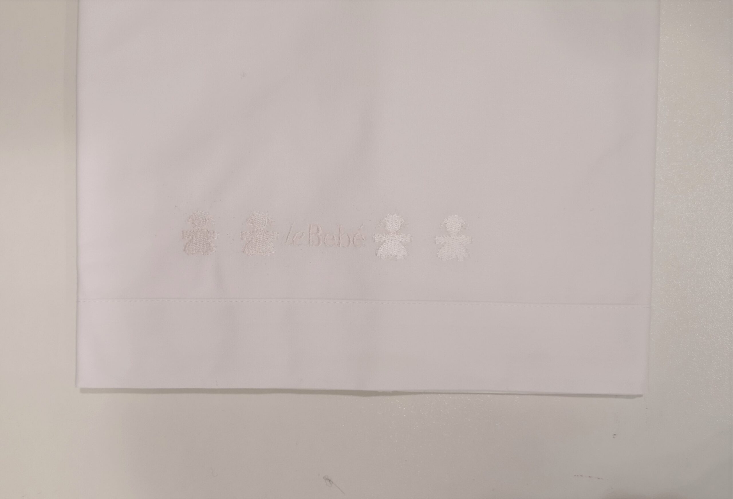 Lenzuolino bianco con sagome bimba bianco ricamate e logo. Completo con lenzuolino sotto e federa.
