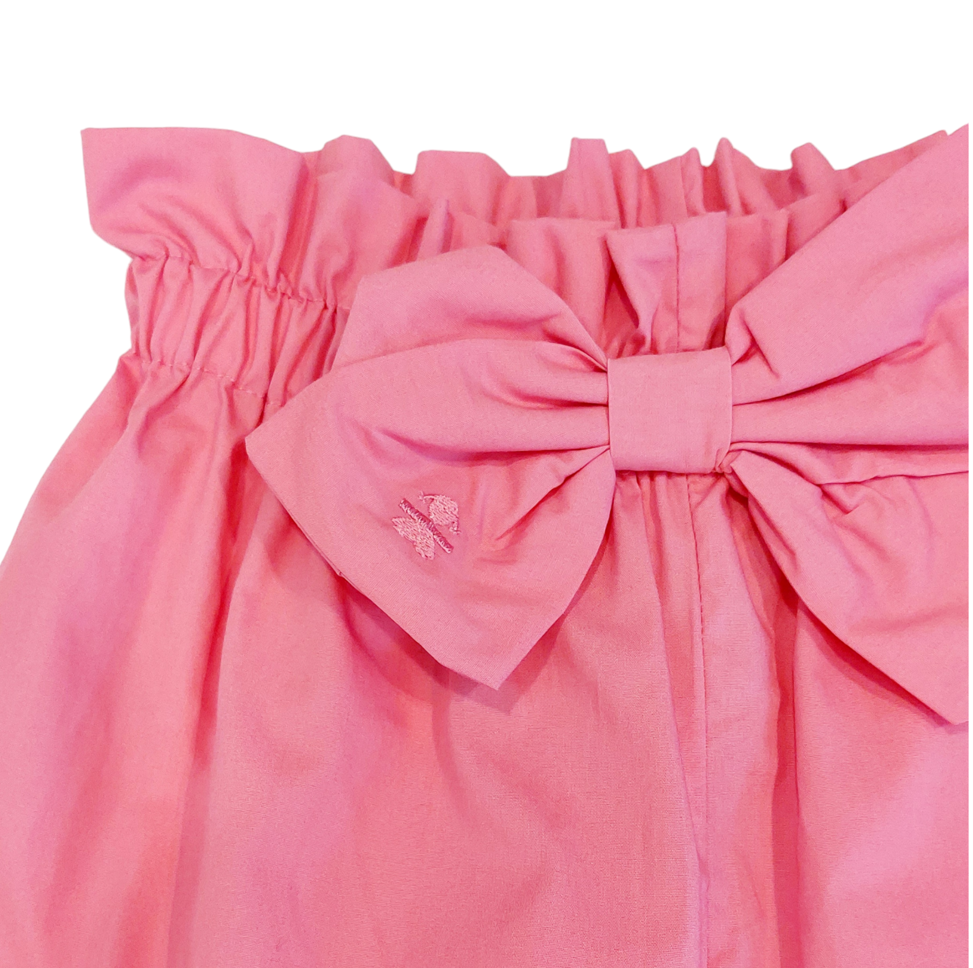 Pantalone in fresco cotone fuxia con fiocco davanti e elastico in vita.
