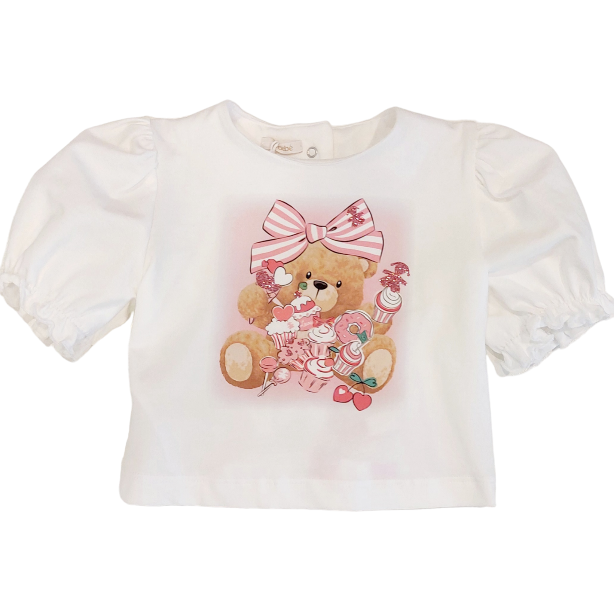 T-shirt bianca manica corta con stampa orsacchiotto rosa e coulisse con fiocco a righe fuxia dietro