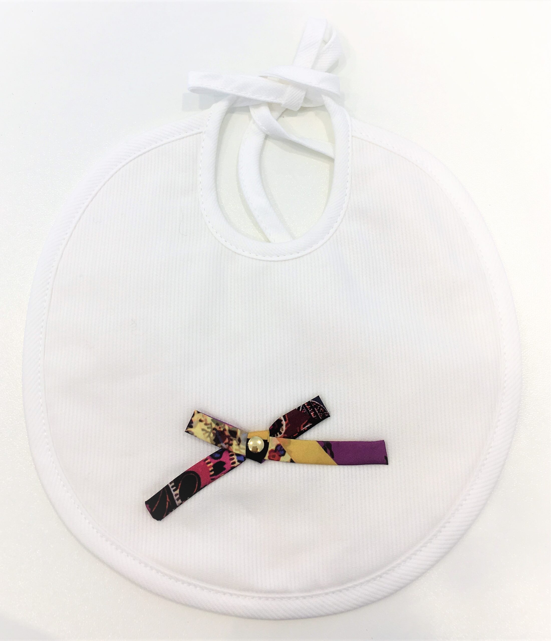 LO’LO’ bavetta colore panna con fiocchetto multicolor. Serie La Borsa. Retro in spugna.