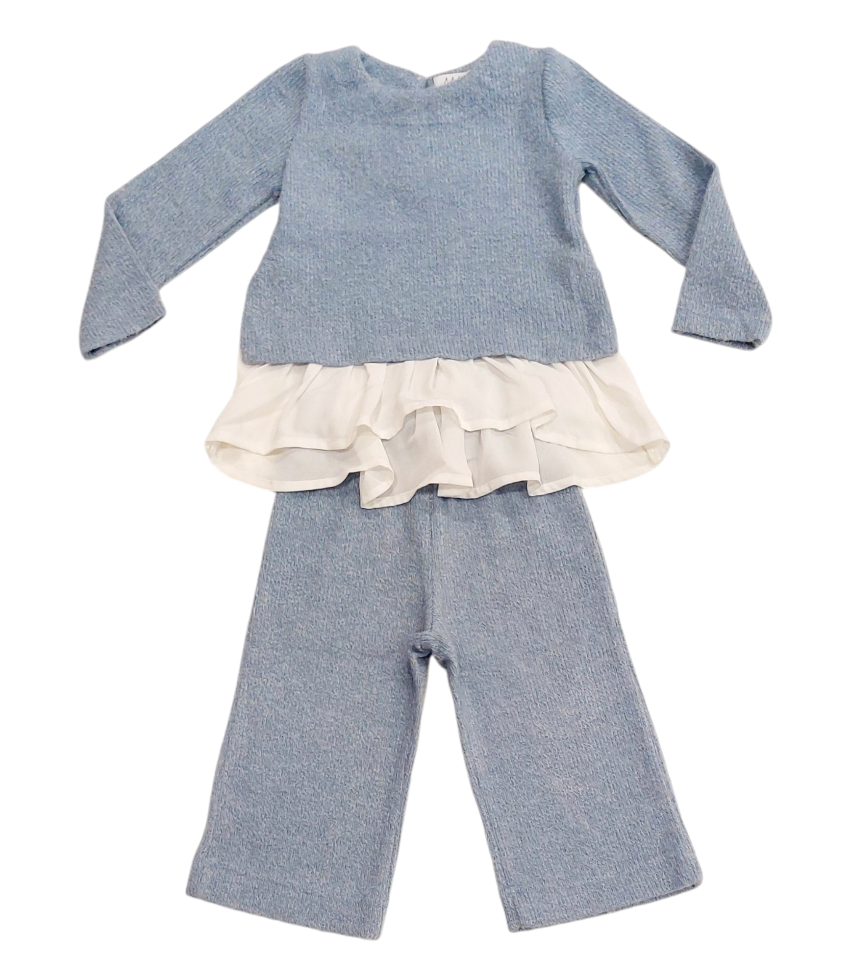 Completo 2 pezzi: pantalone e blusa in maglia azzurra. Blusa con tessuto effetto camicia nella parte inferiore.
