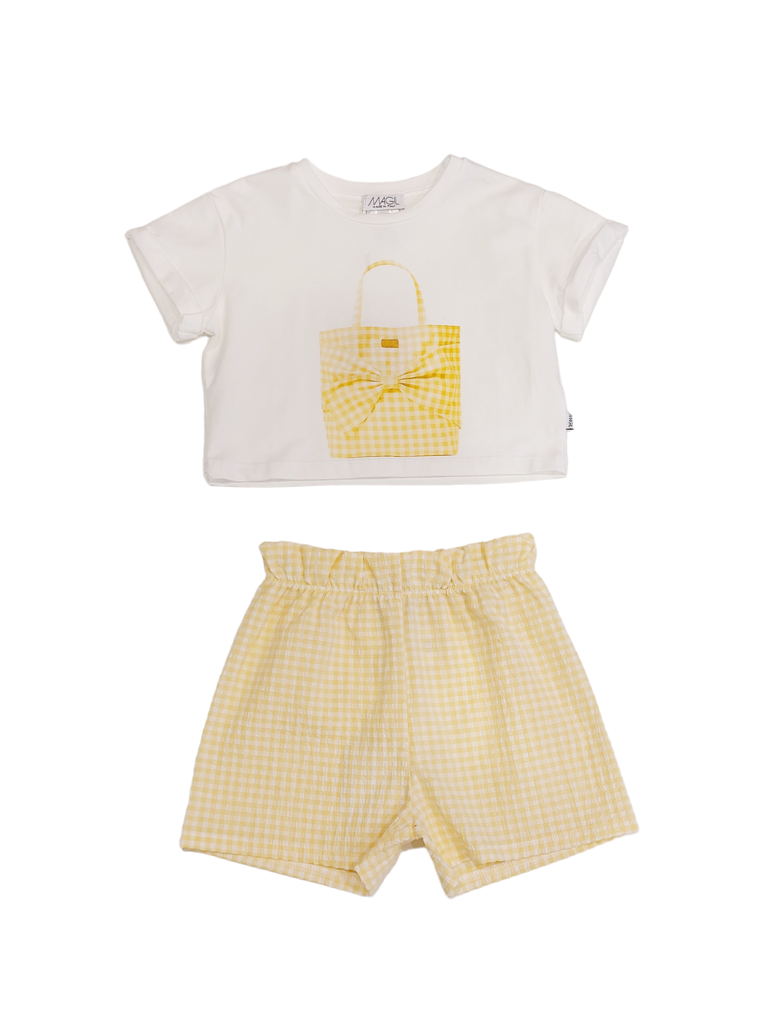 Carinissimo completo 2 pezzi: t-shirt bianca girocollo con stampa borsetta e pantaloncini a quadretti vichy giallo abbinati