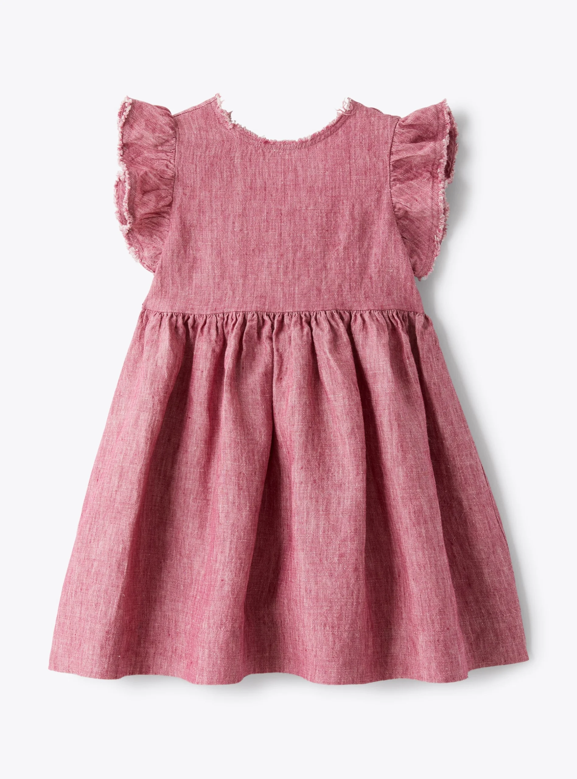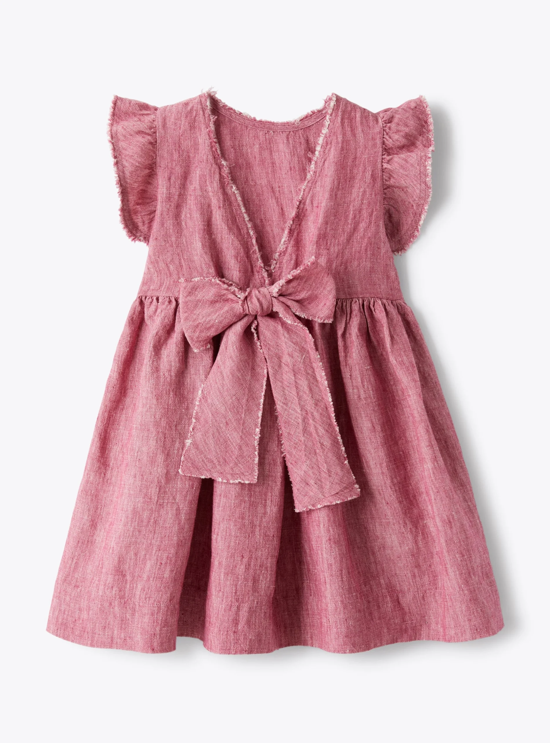 Vestito dal design svasato realizzato in 100% lino melange di colore viola tropea con maniche volant e scollatura a V sulla schiena che termina con un elegante fiocco decorativo, ampia gonna con dettaglio di arricciature in vita.