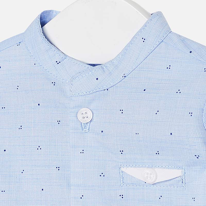 Camicia manica lunga per neonato con polsini con bottoni. Modello con colletto alla coreana ton sur ton. Chiusura con bottoni nella parte anteriore. Morbido tessuto di cotone elasticizzato. Finta tasca decorativa nella parte anteriore. Modello della nostra linea più elegante ed esclusivamente pensata per vestire i più piccoli durate le occasioni speciali.