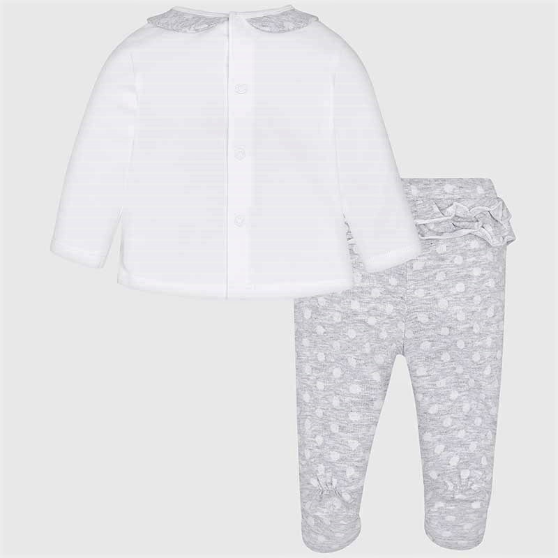 Completo nascita coprifasce in cotone 2 pezzi: maglia con inserti colore grigio a pois + ghettina grigio a pois con piedini e ruche dietro.