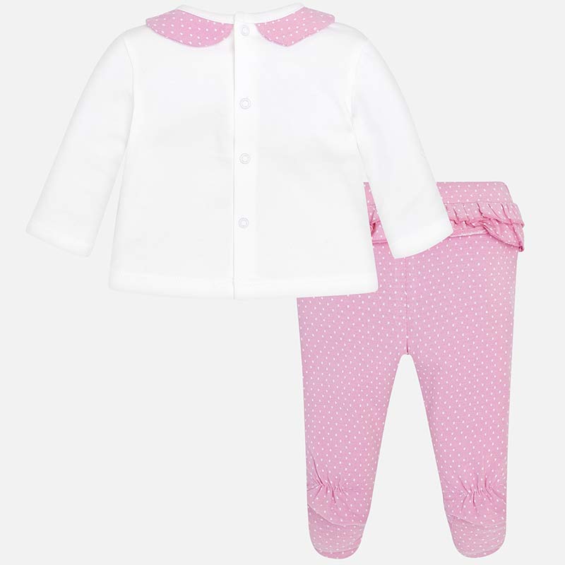 Completo nascita coprifasce in cotone 2 pezzi: maglia con inserti colore malva a pois + ghettina malva a pois con piedini e ruche dietro.