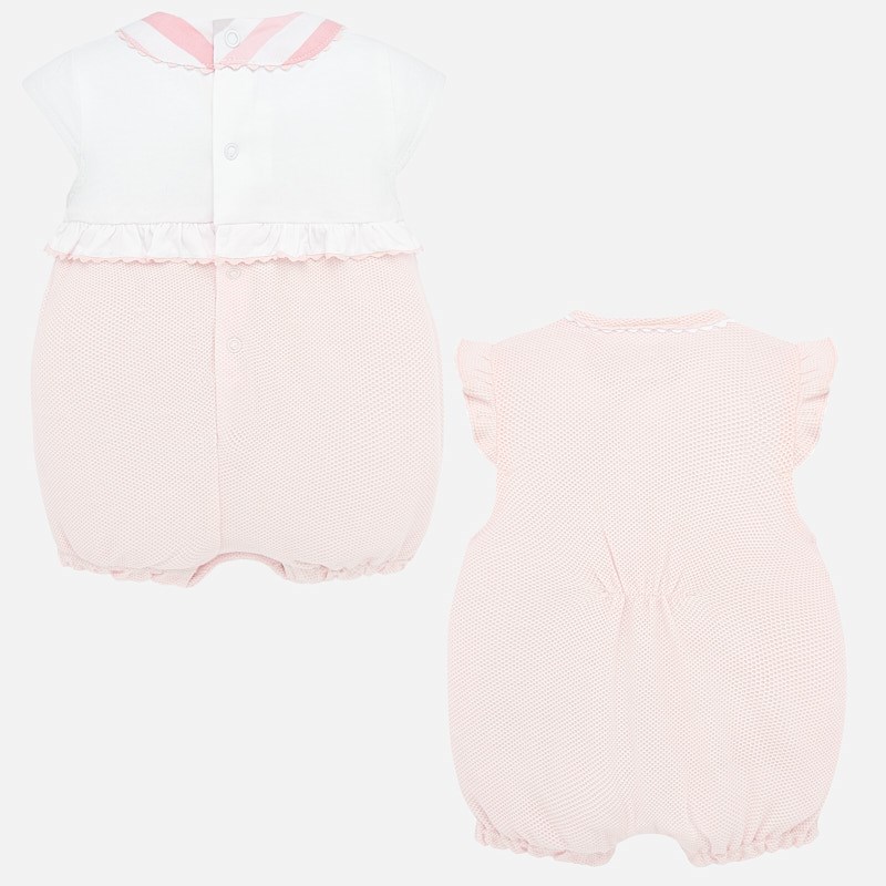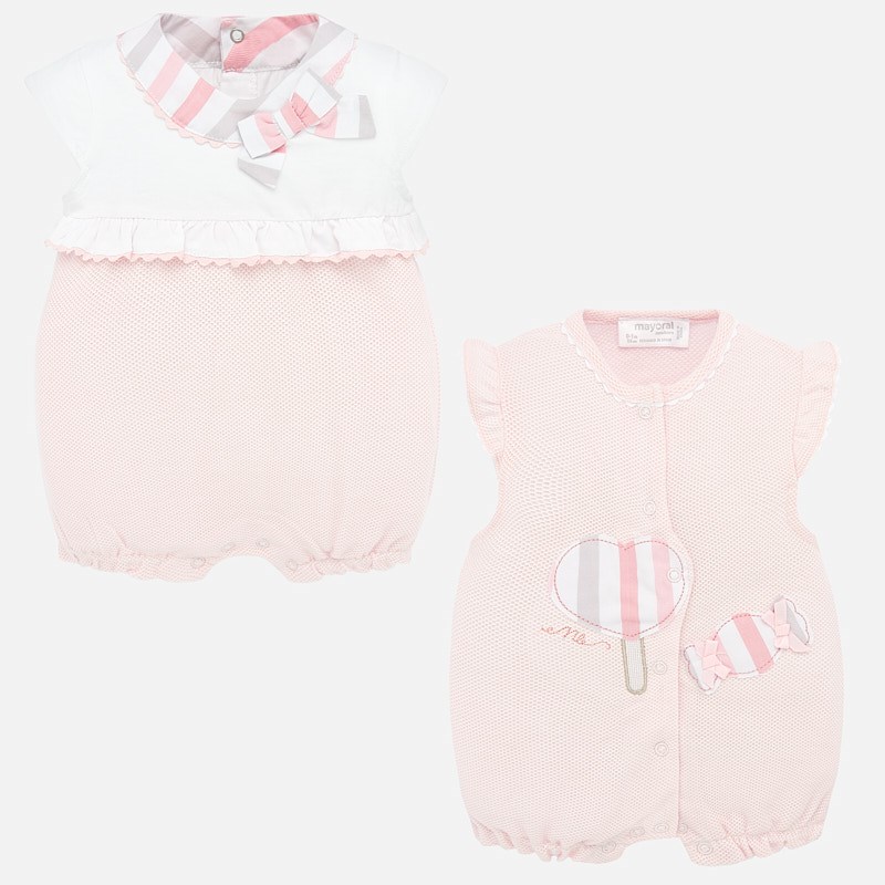 Set 2 tutine manica corta per neonata. Chiusura con bottoni a pressione. Morbido tessuto di cotone elasticizzato. Elementi decorativi: applicazione decorativa, fiocco, volant decorativi.
