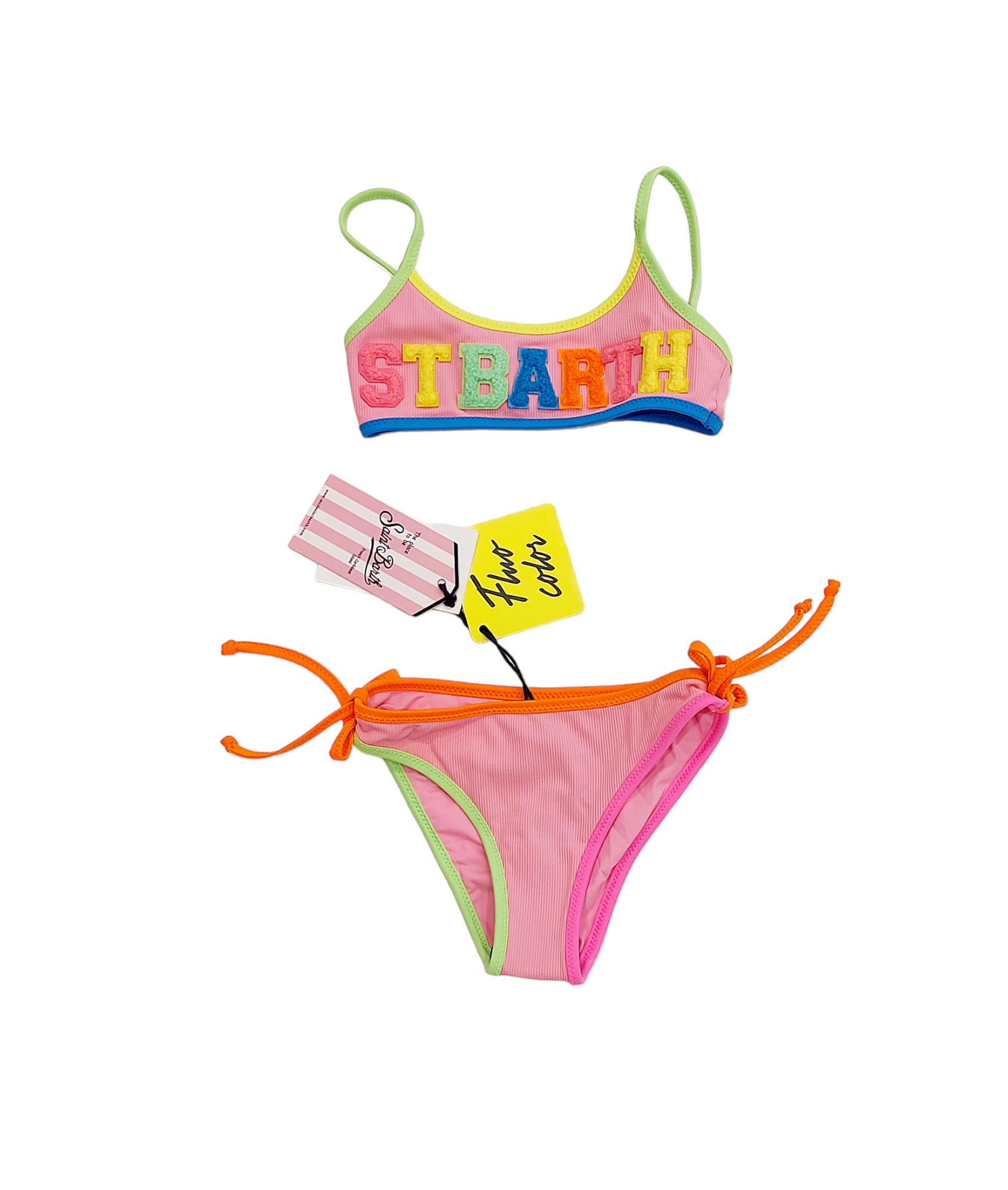 Costume modello bikini rosa con bordi colorati fluo: top con bretelline e scritta SAINT BARTH e slip con fiocchetti.
