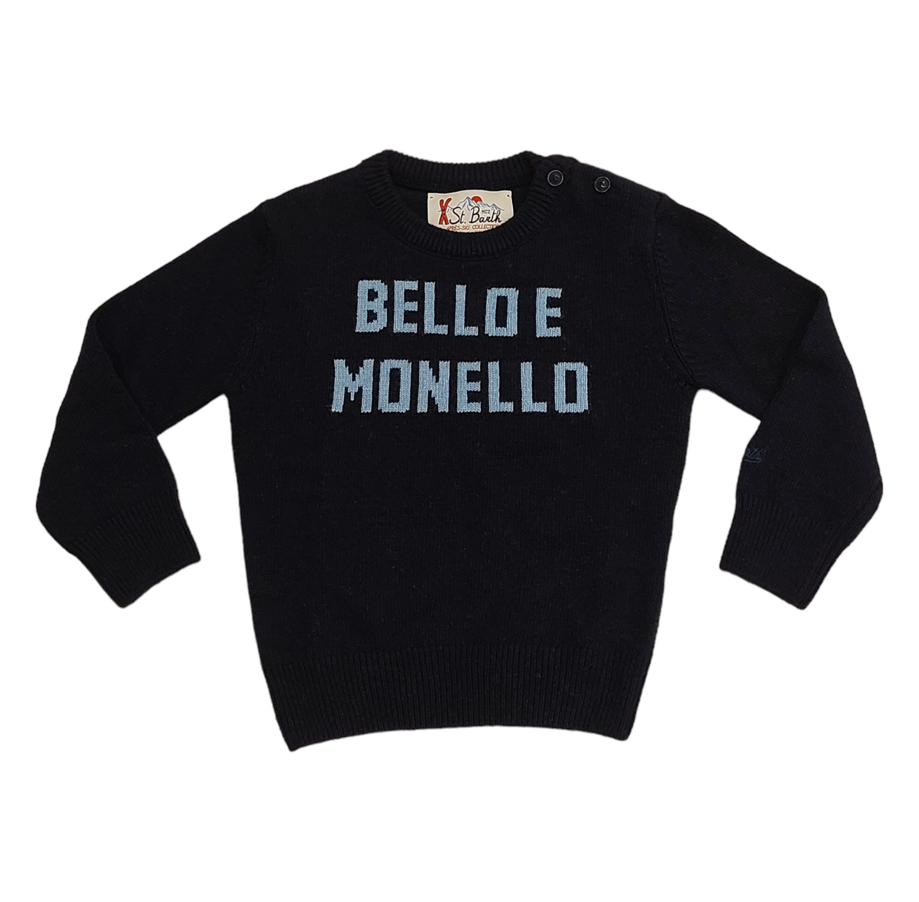 Maglione fondo blu con scritta in contrasto azzurra BELLO E MONELLO