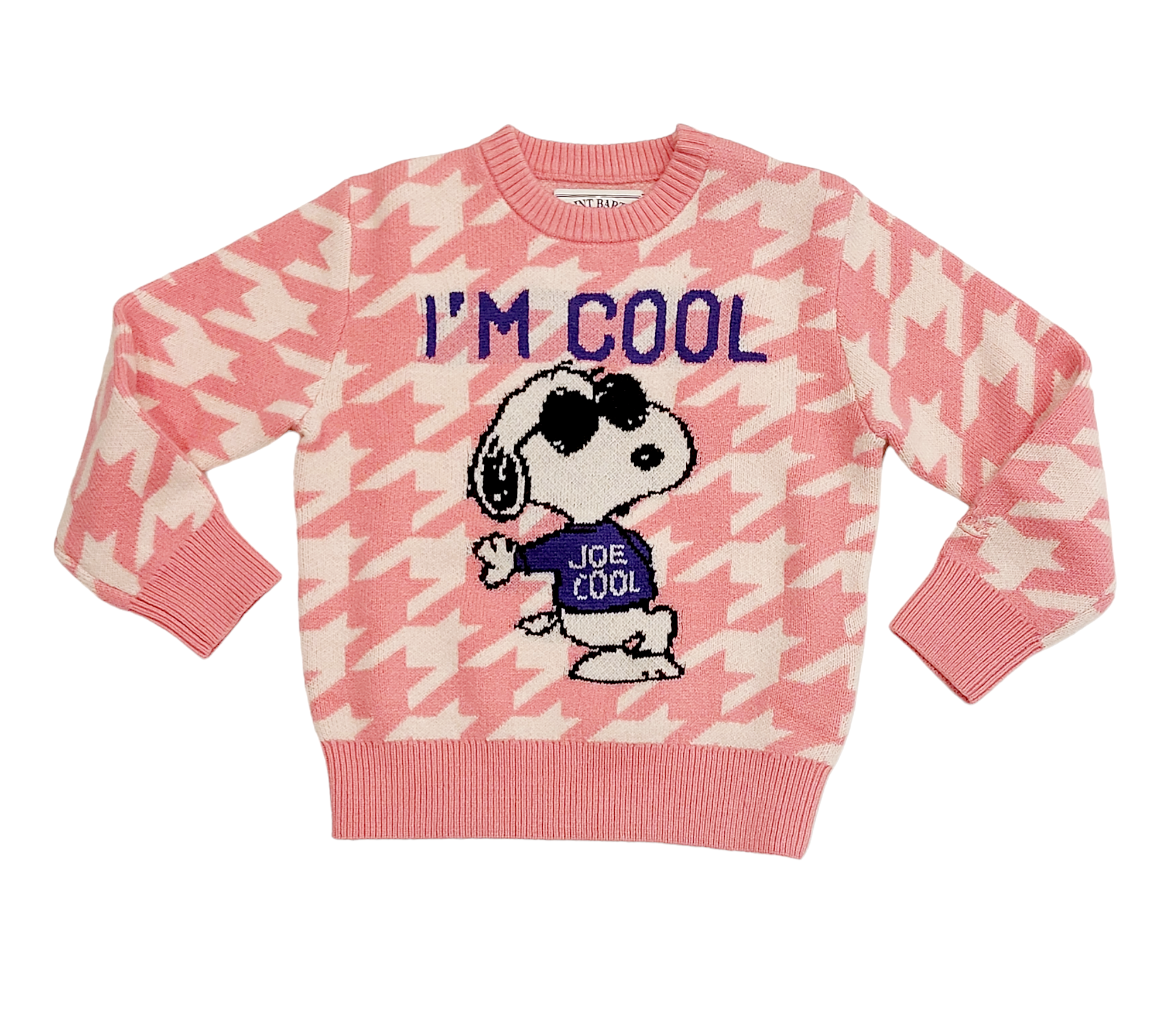Maglione fantasia pied de poule rosa con Snoopy e scritta I’M COOL in contrasto