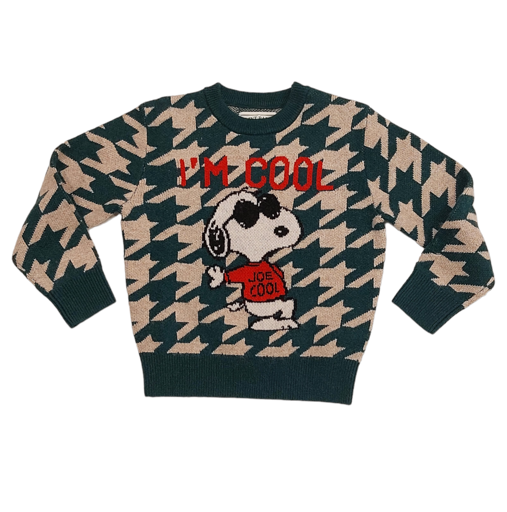 Maglione fantasia pied de poule verde con Snoopy e scritta I’M COOL in contrasto rosso