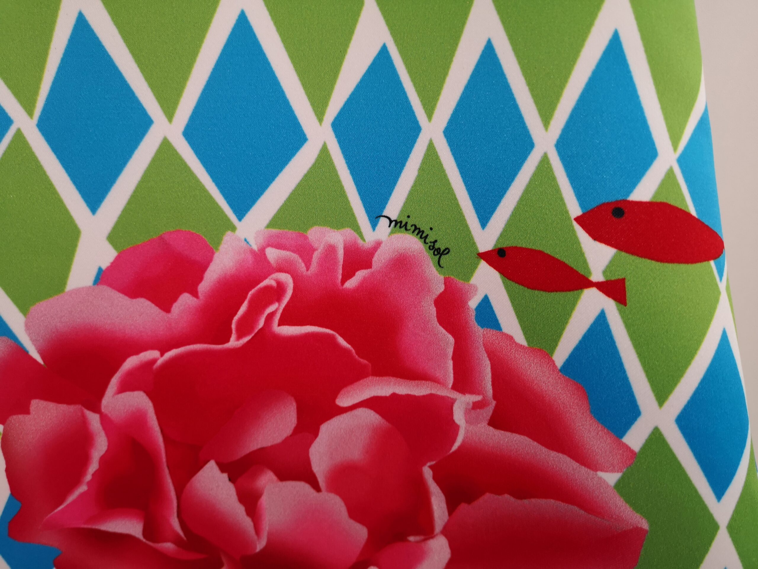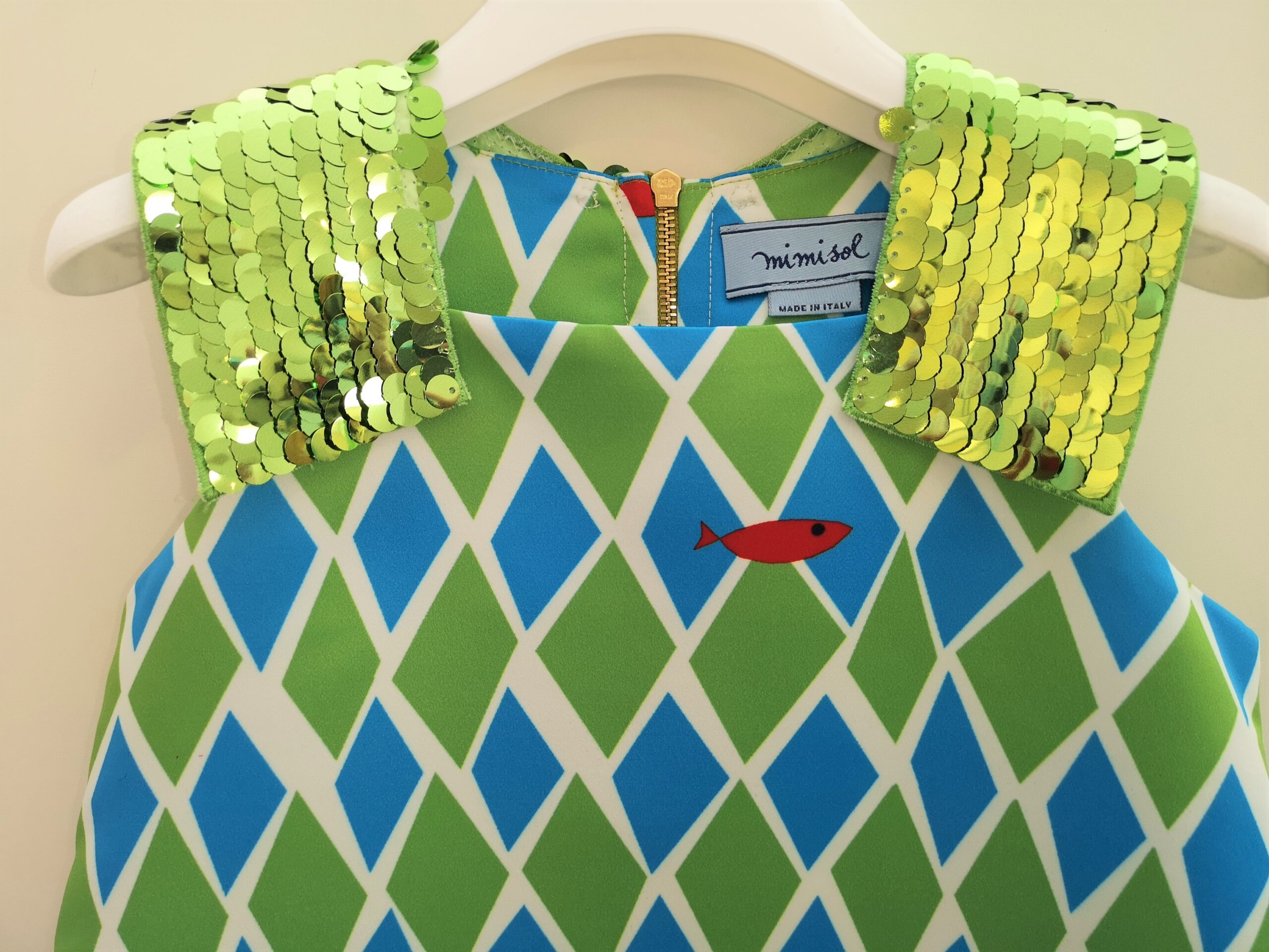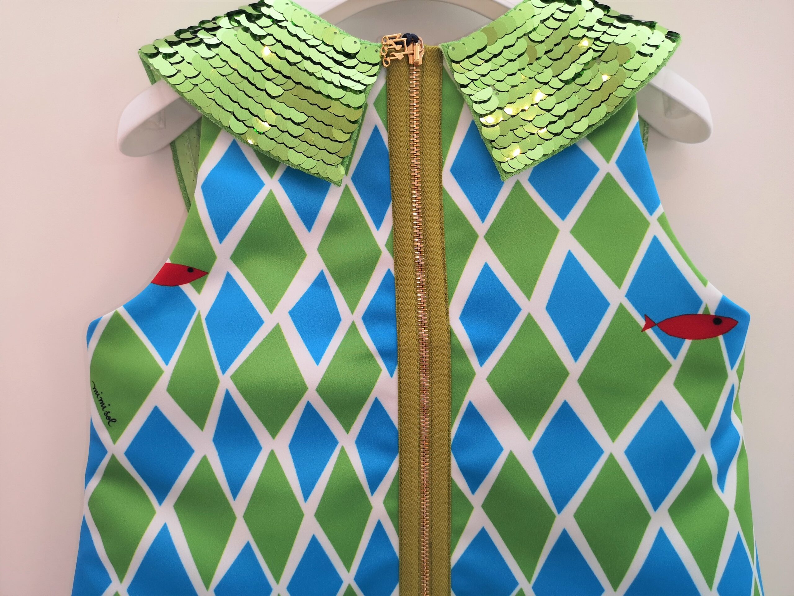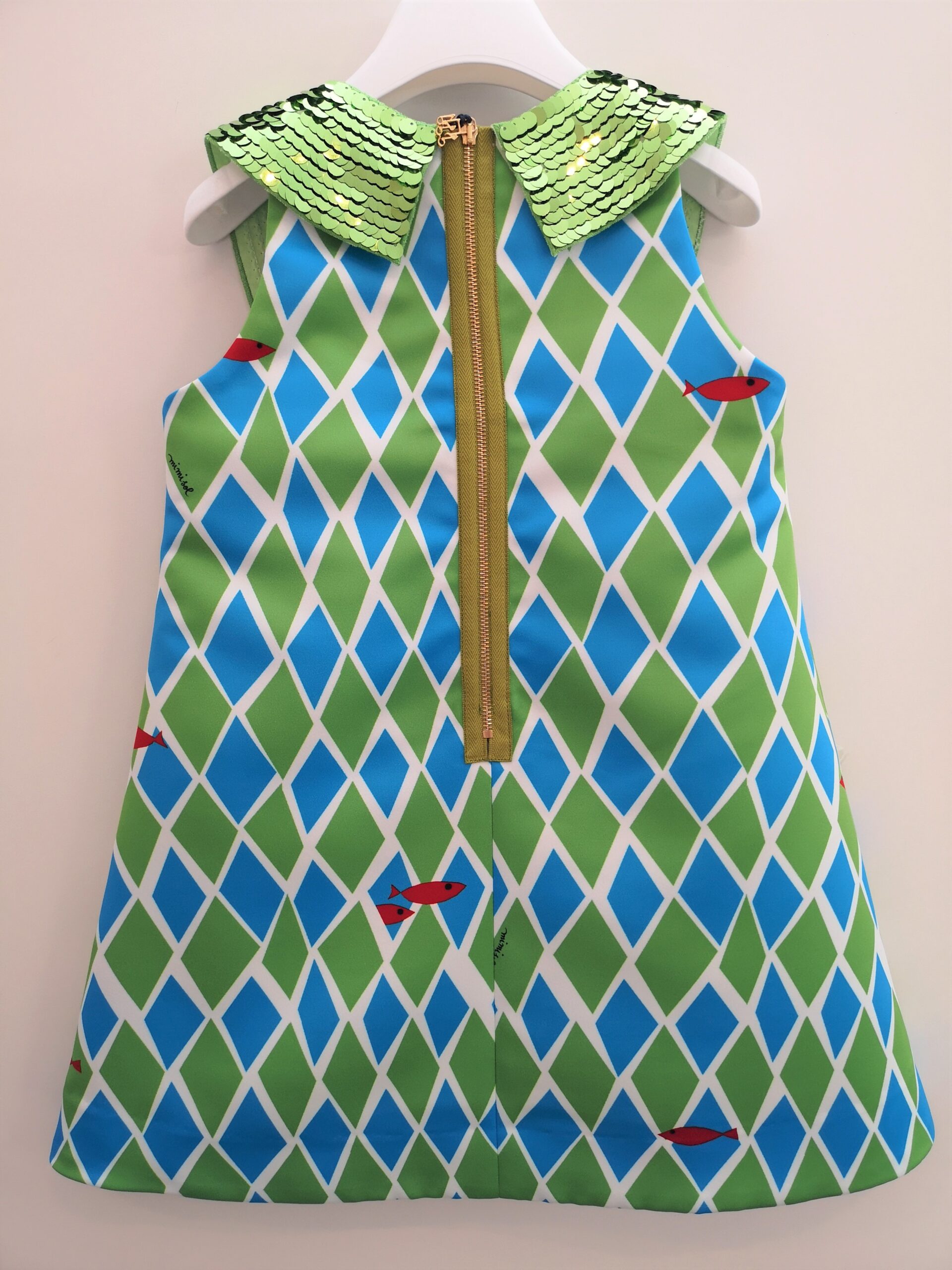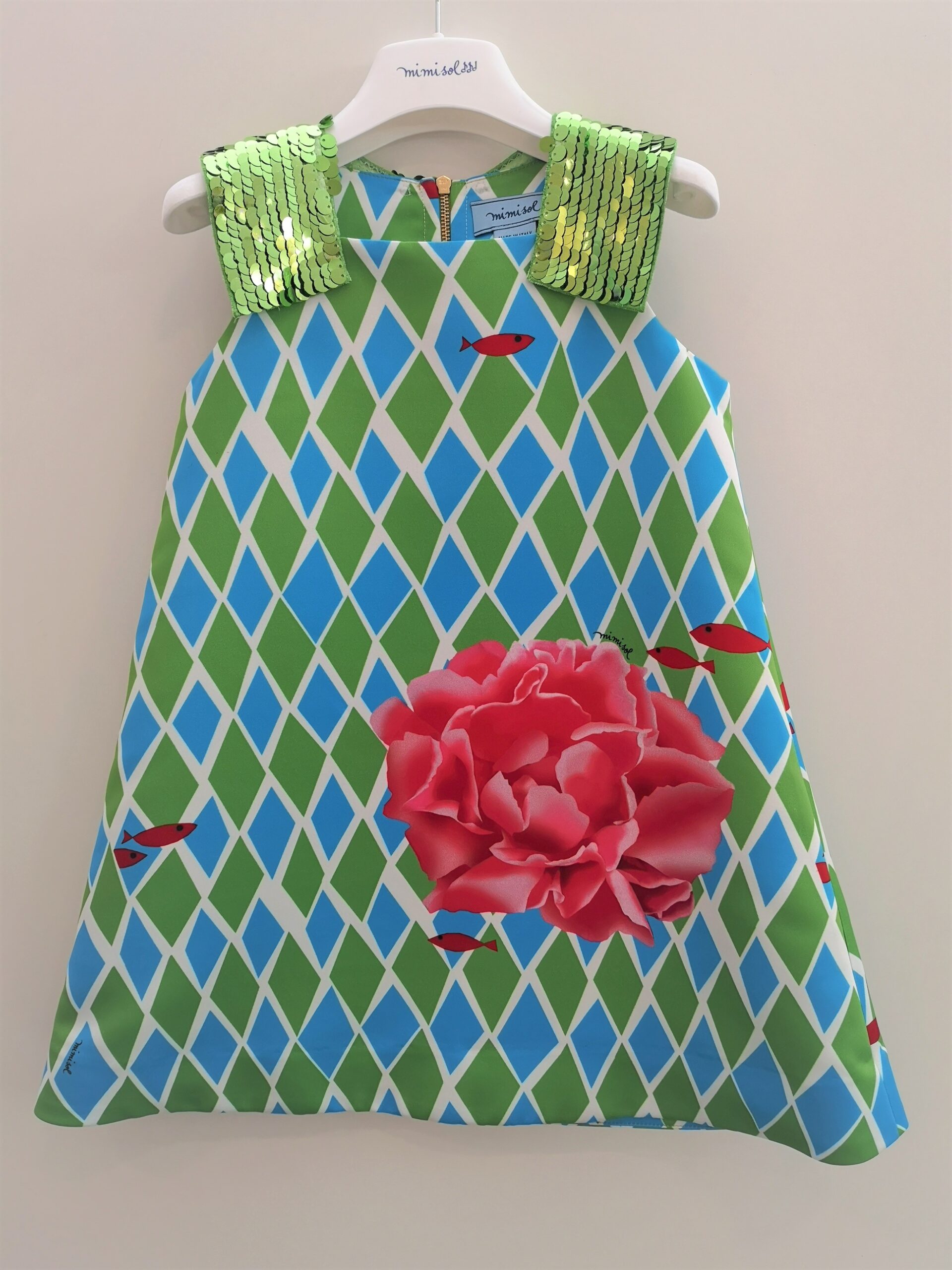 Abito con tessuto rombi verde-azzurro, macrofiore davanti e piccoli pesciolini rossi. Tessuto firmato “Mimisol”. Spalline ricoperte di paillettes verdi. Chiusura con zip a vista dietro