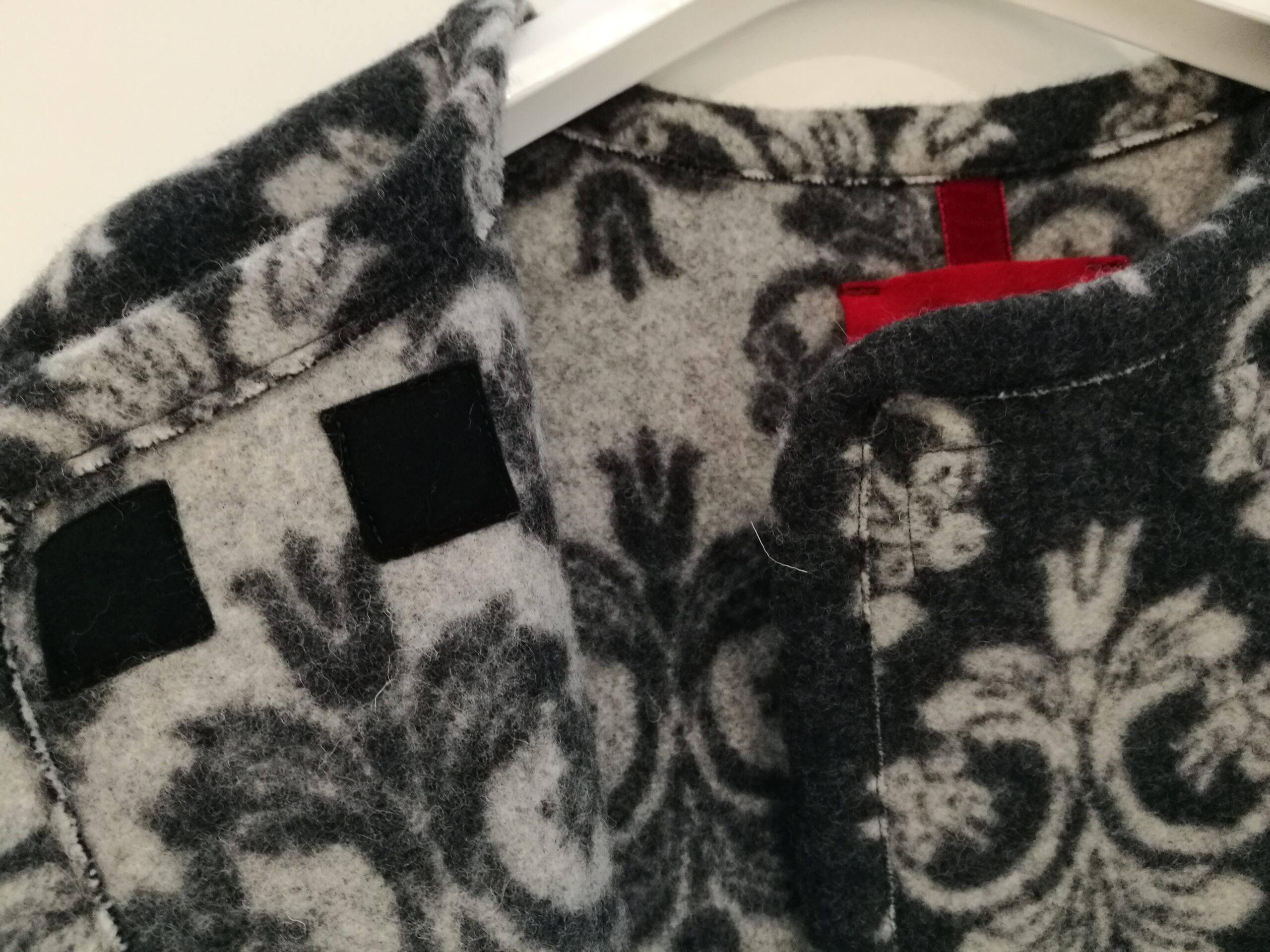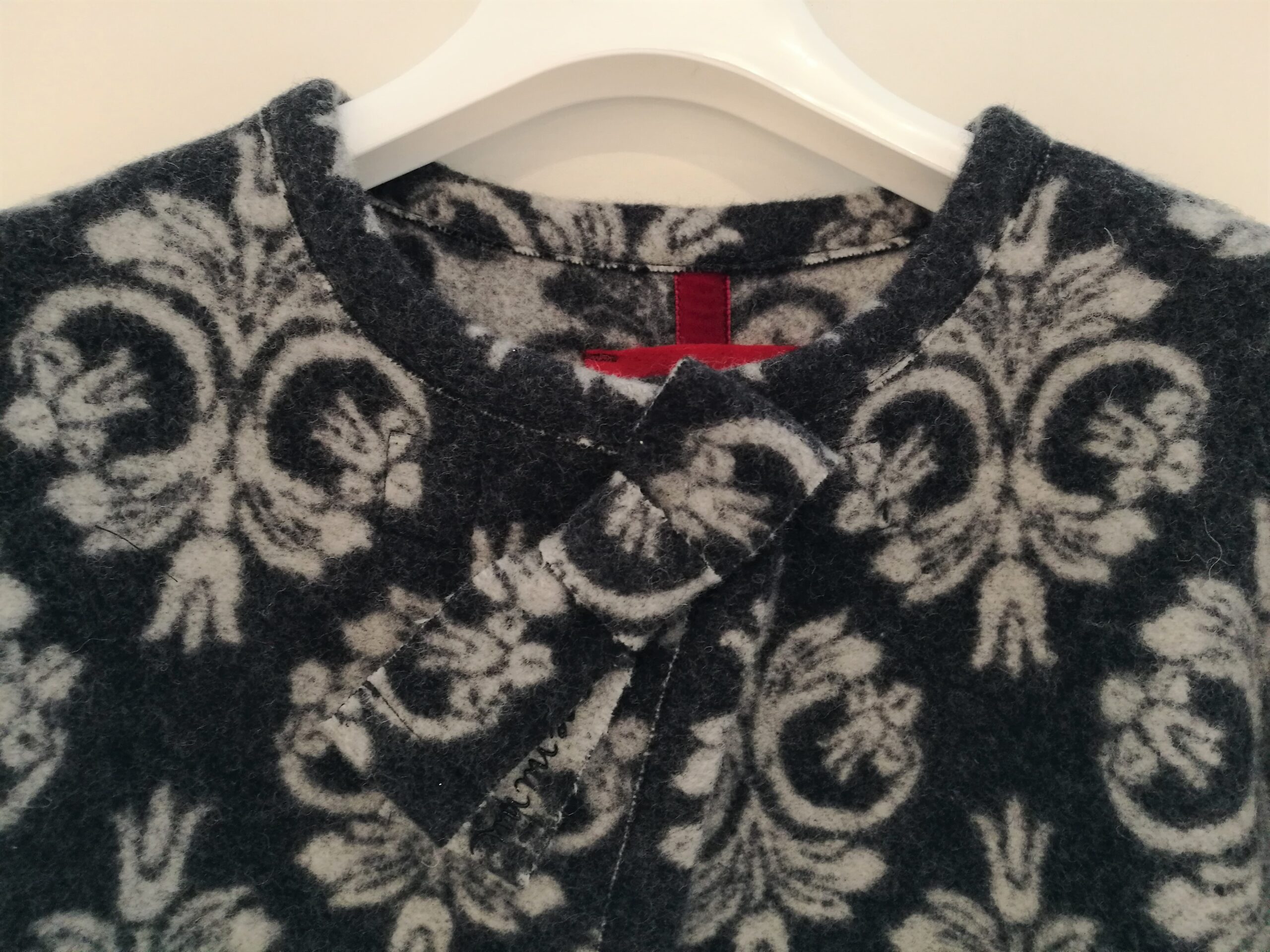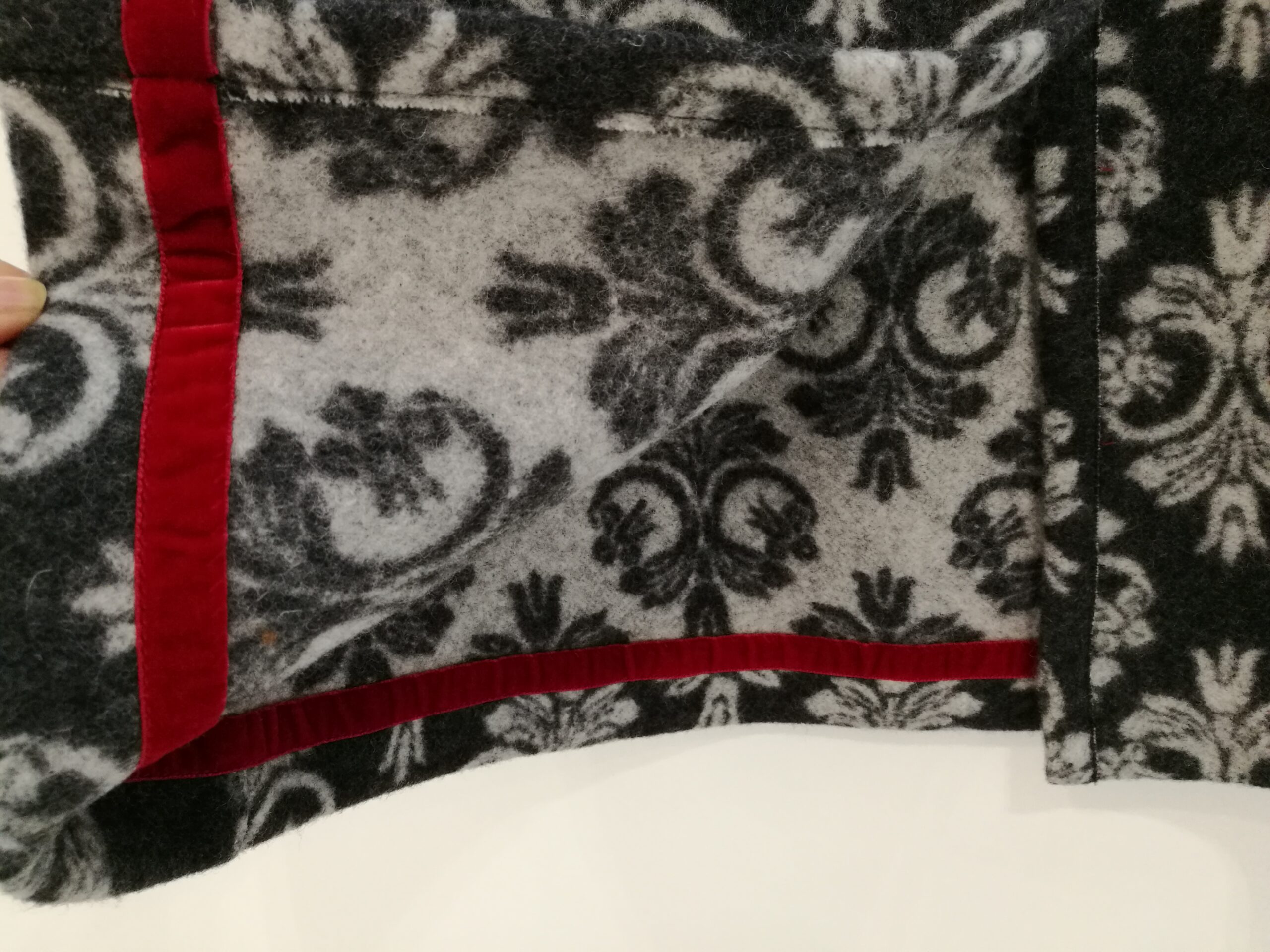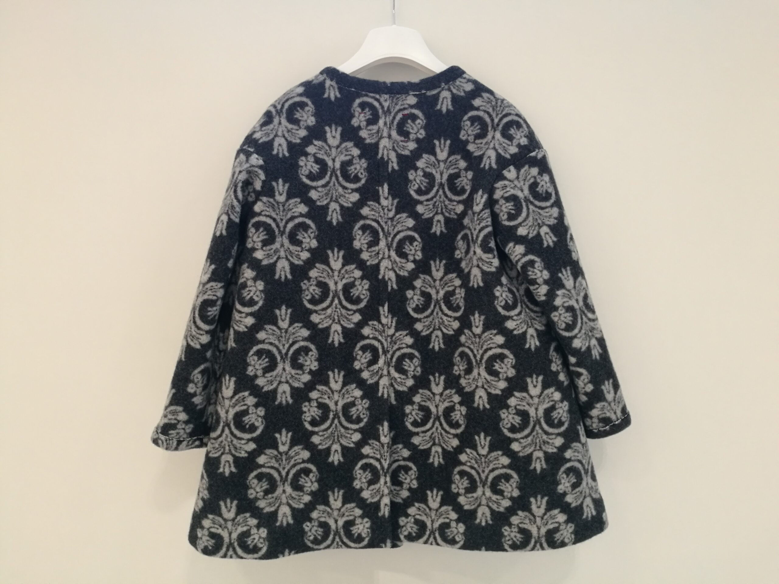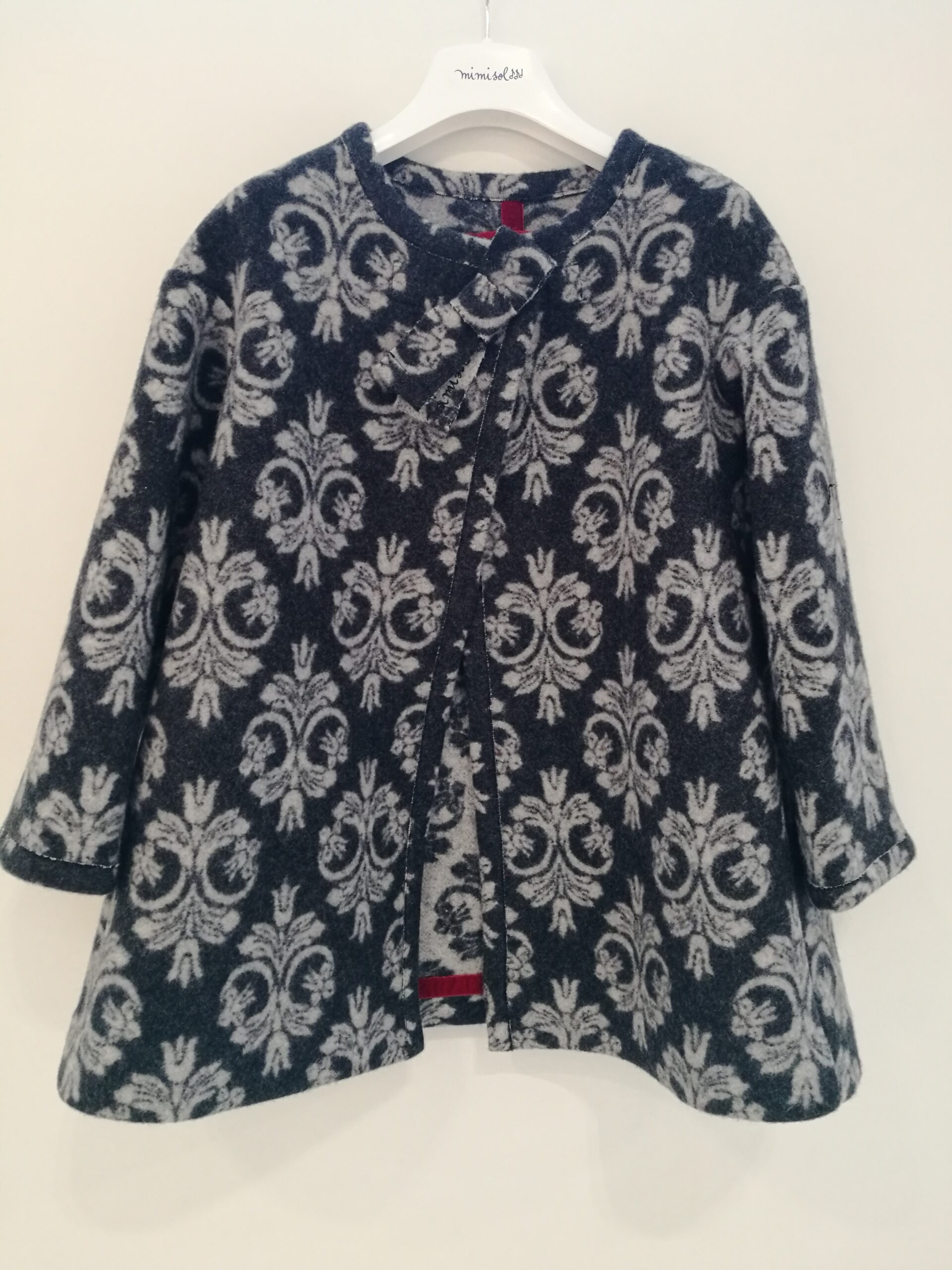 Raffinatissimo cappotto grigio con disegno retrò. Abbottonatura alta con bottoni calamita. Fiocco con logo “Mimisol”.