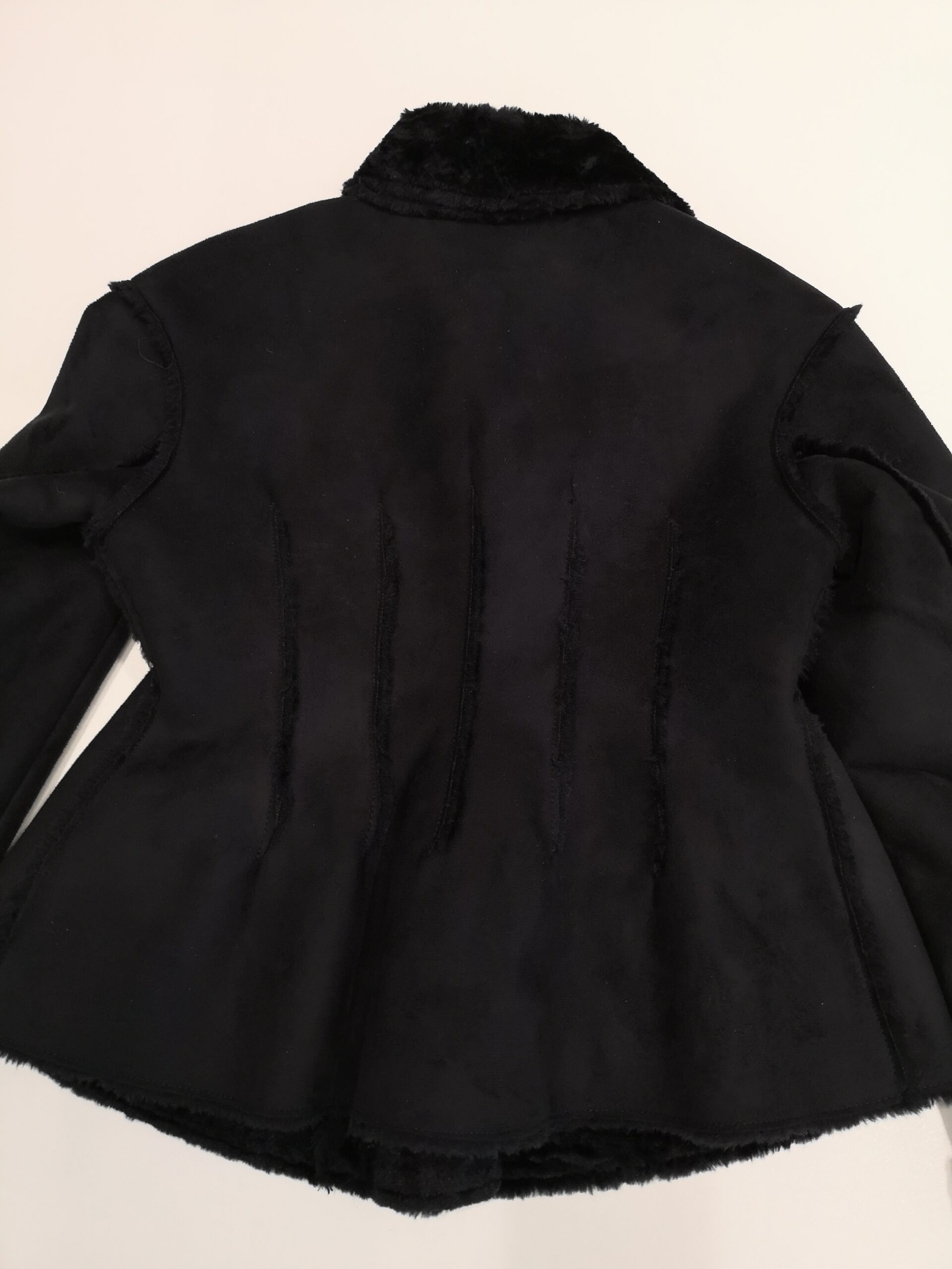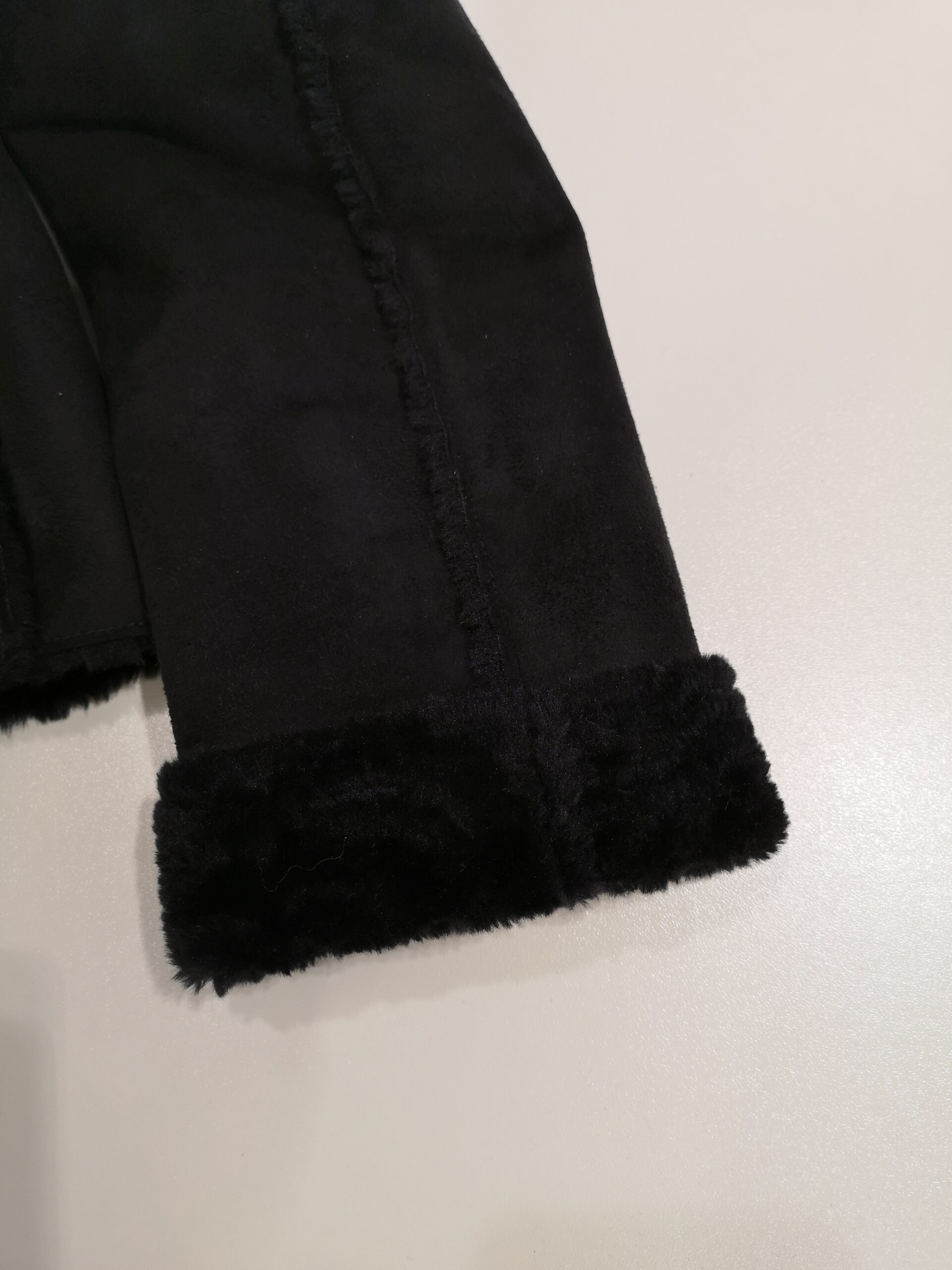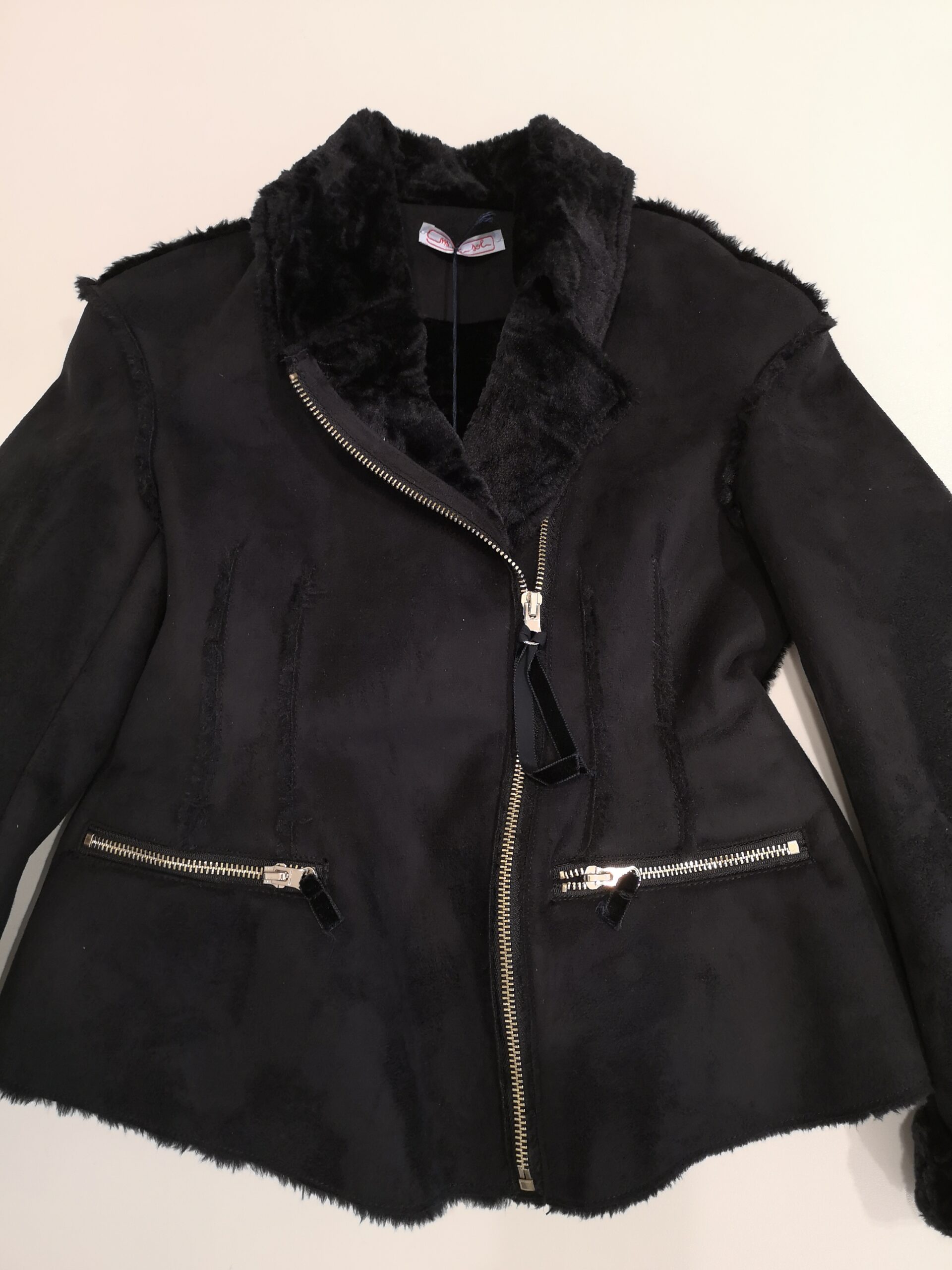 Giubbotto ecomontone nero con interno pelliccia. Chiusura con zip e tasche con zip in contrasto.