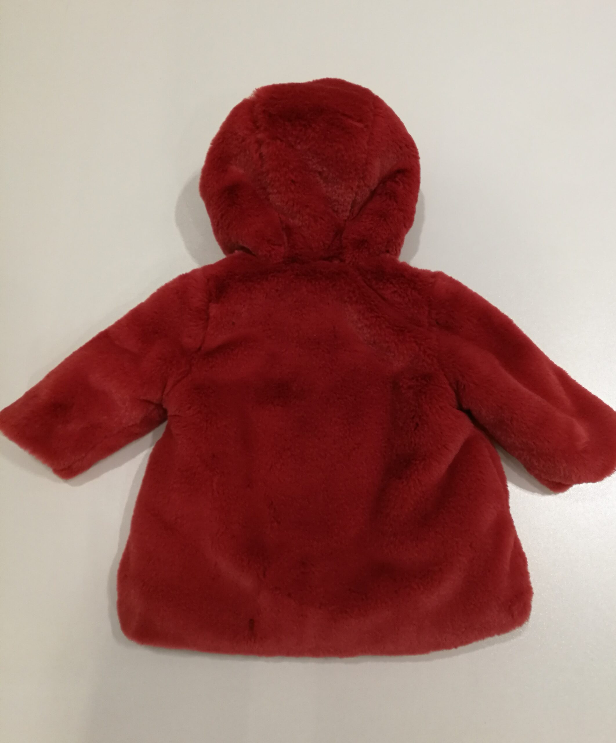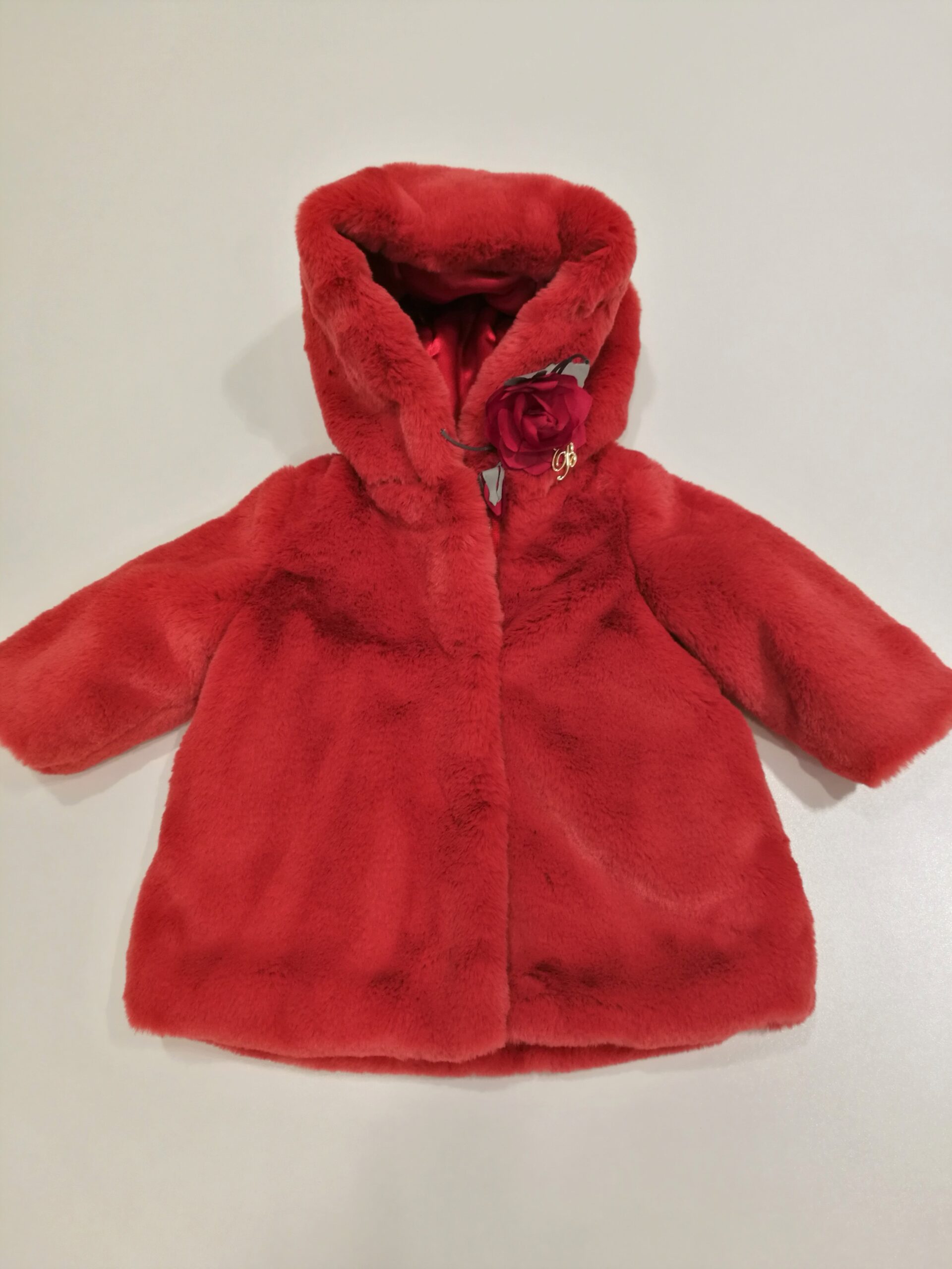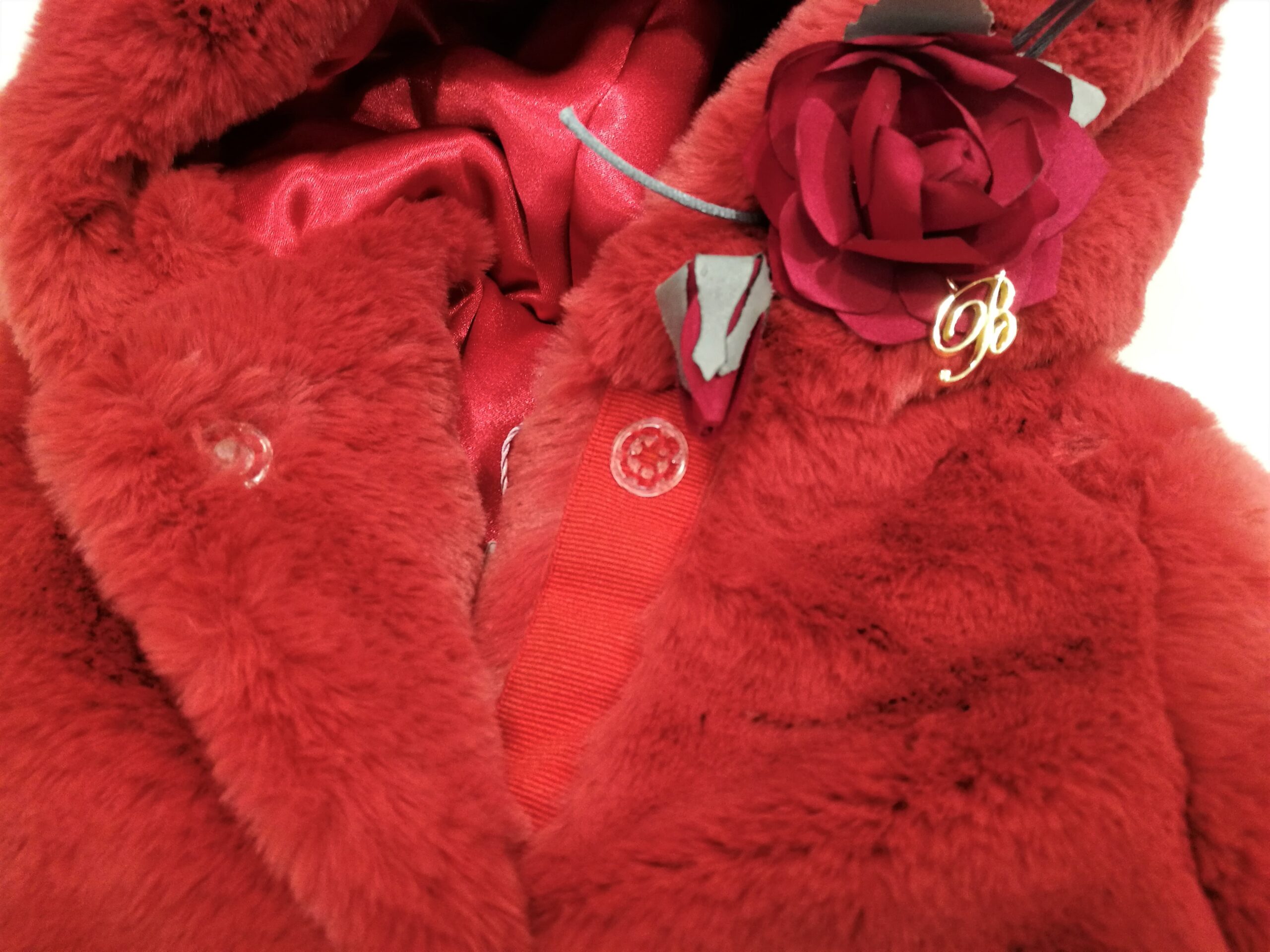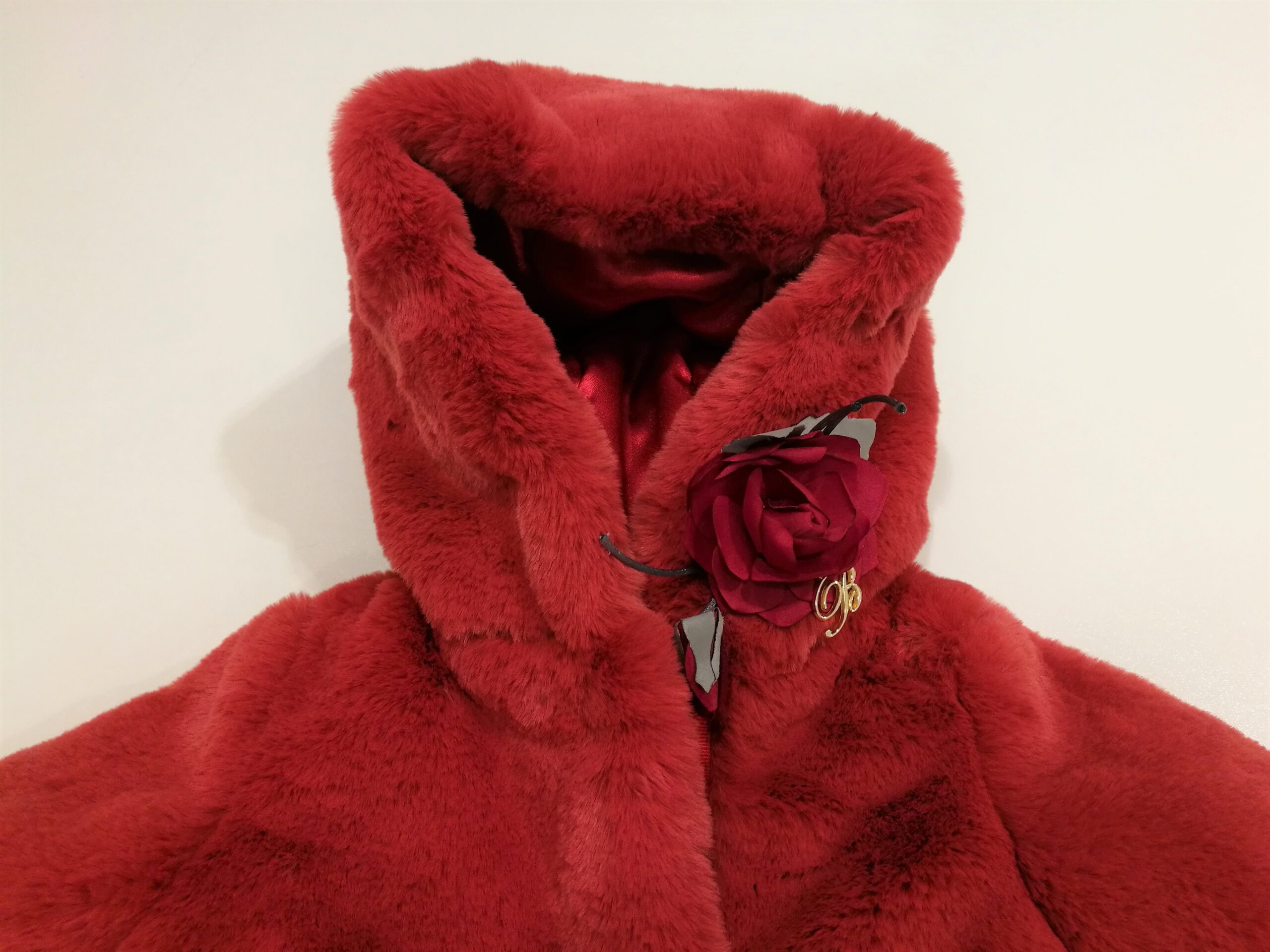 Giubbino in morbidissima pelliccia rossa con cappuccio. Apertura con bottoni davanti. Applicazione di una rosa con “B” di Blumarine. Foderata all’interno.