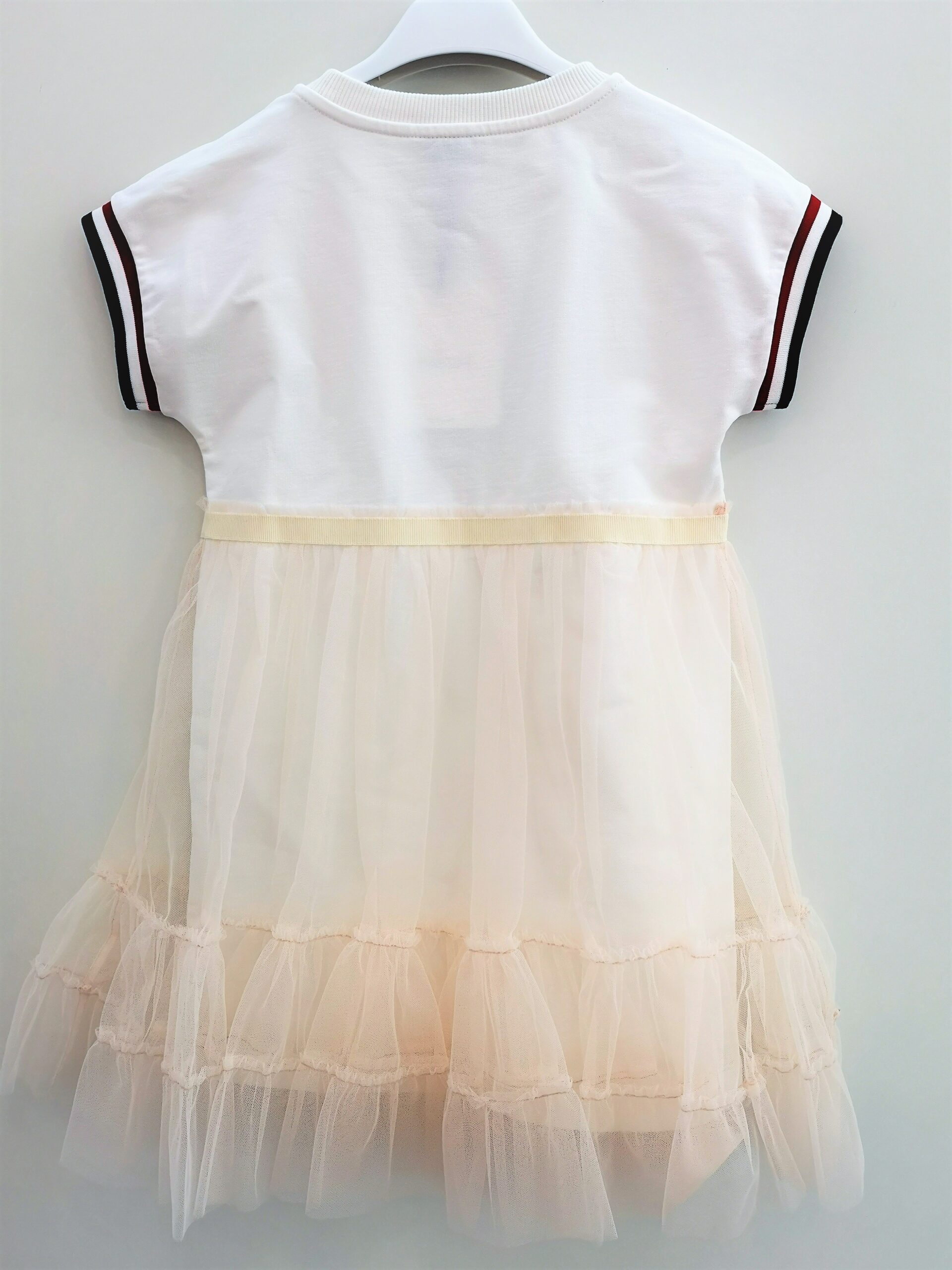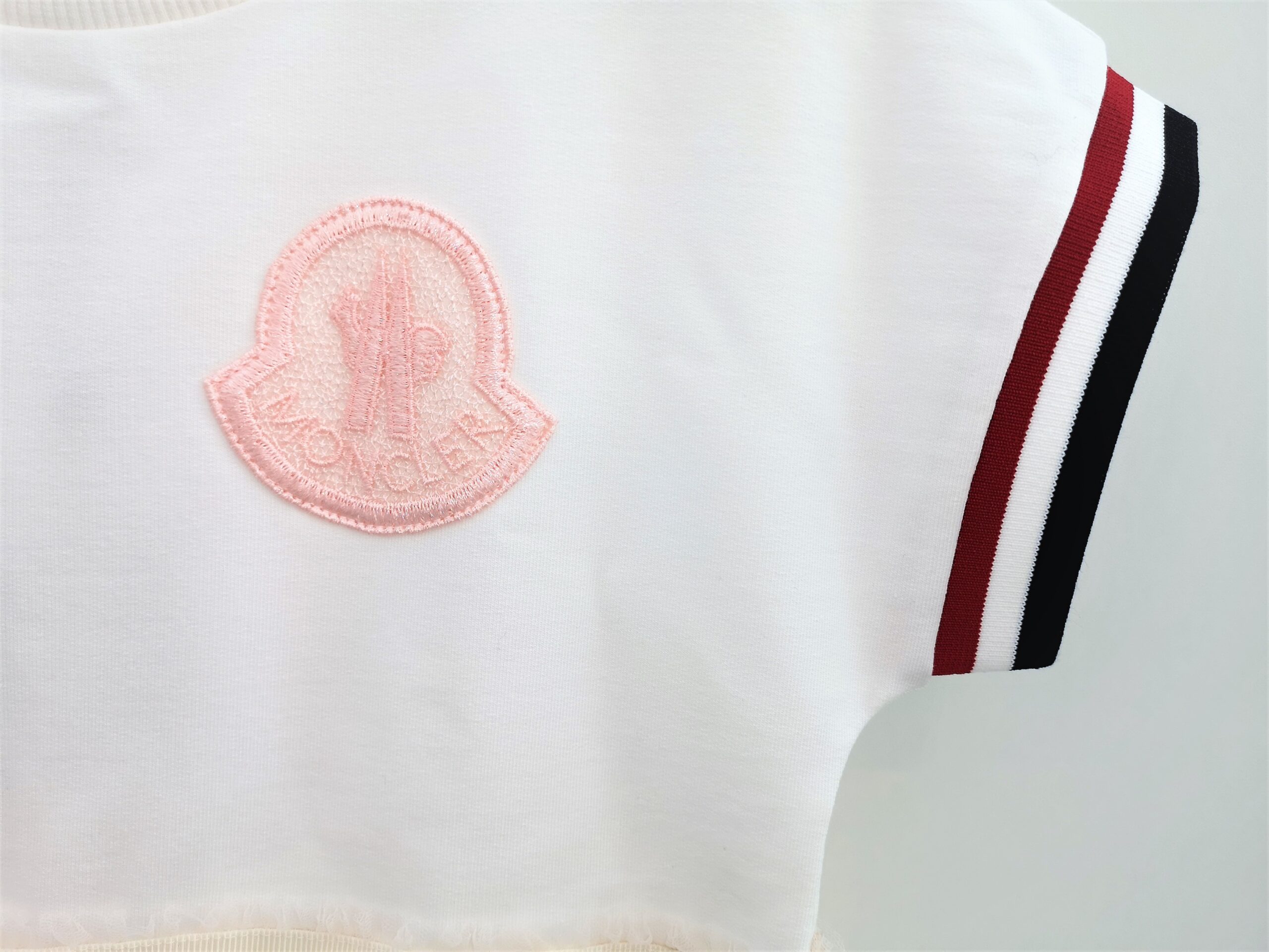 Abito in cotone bianco manica corta. Parte superiore don stemma logo rosa e manica bordata in contrasto.