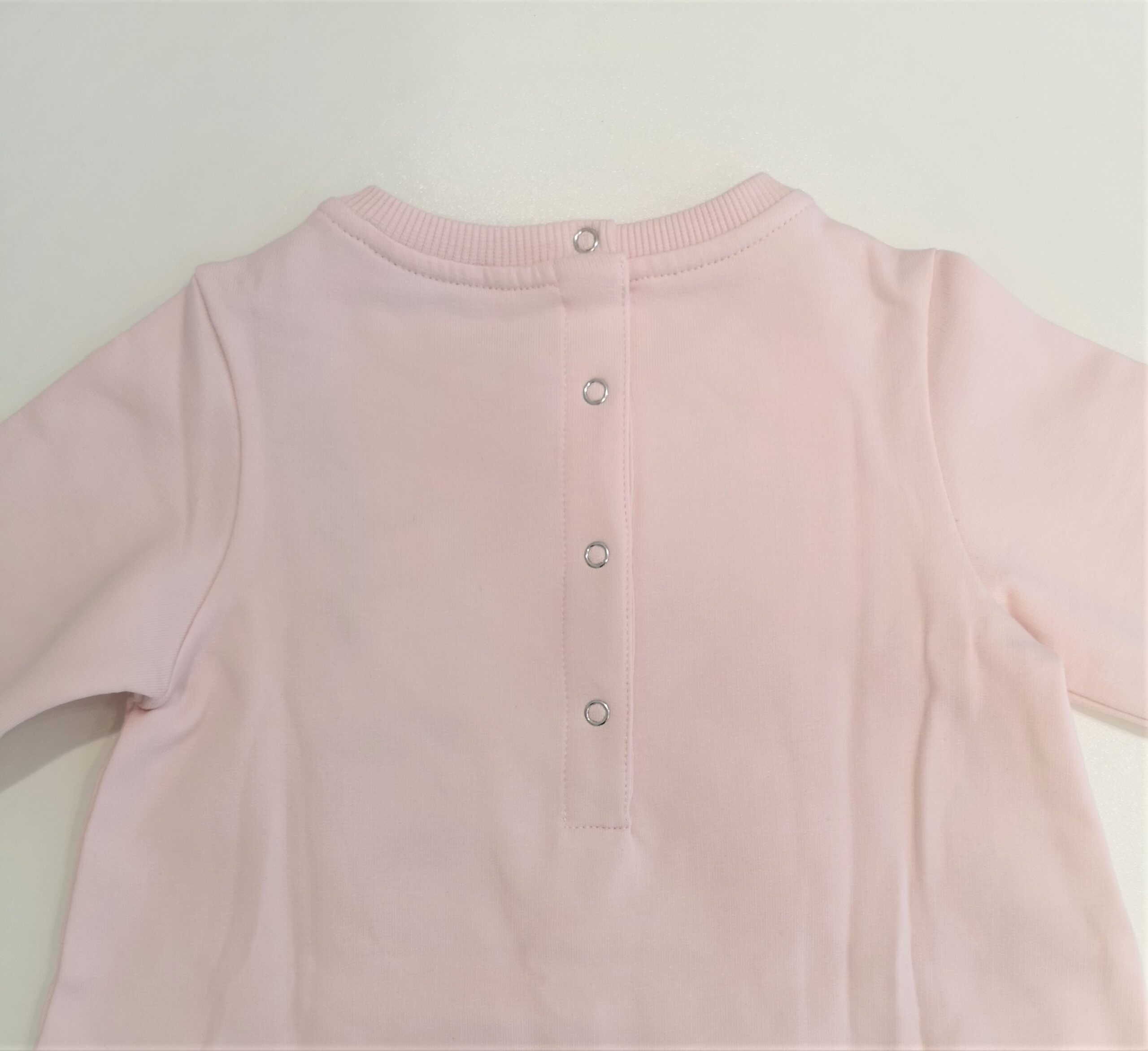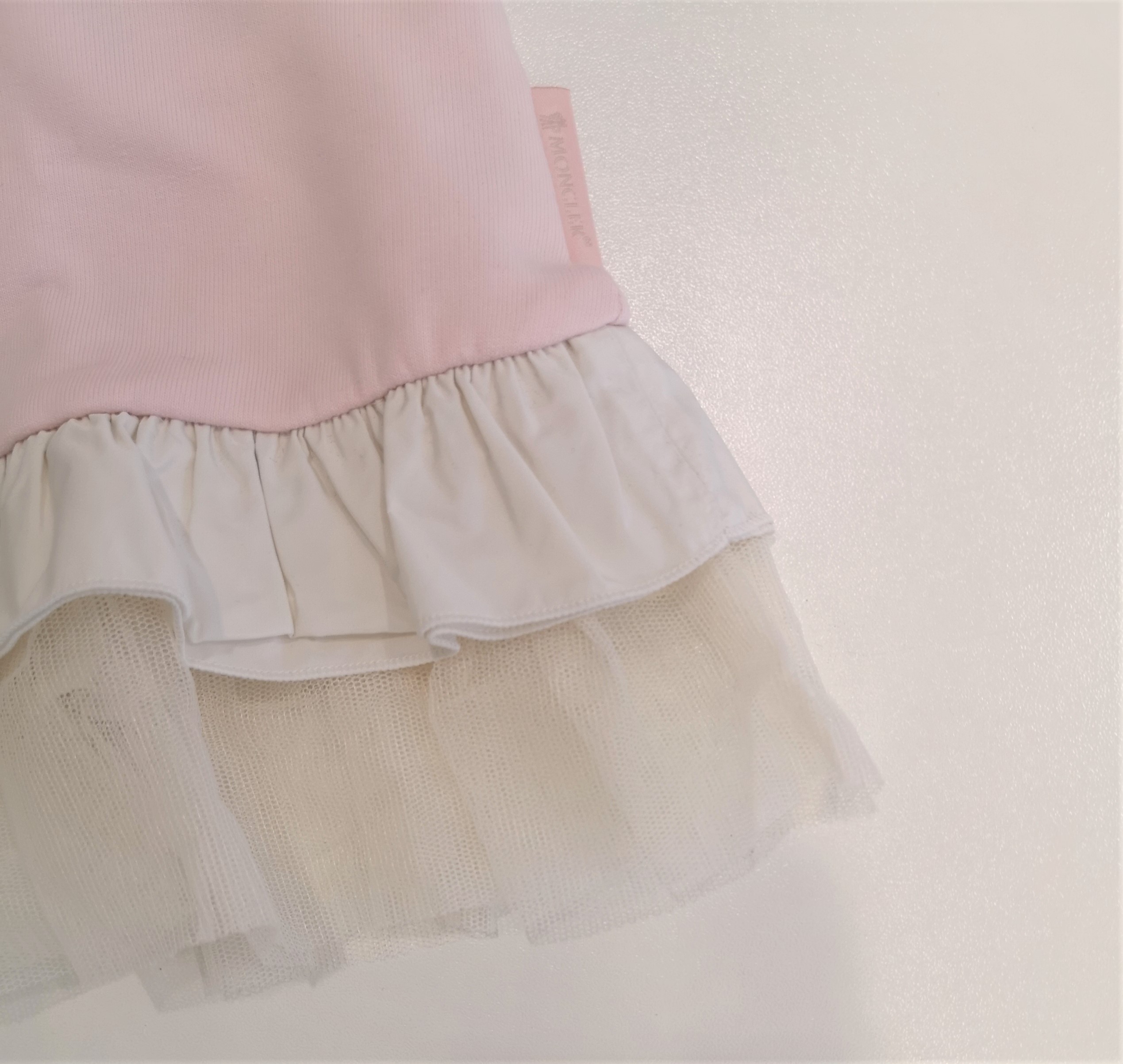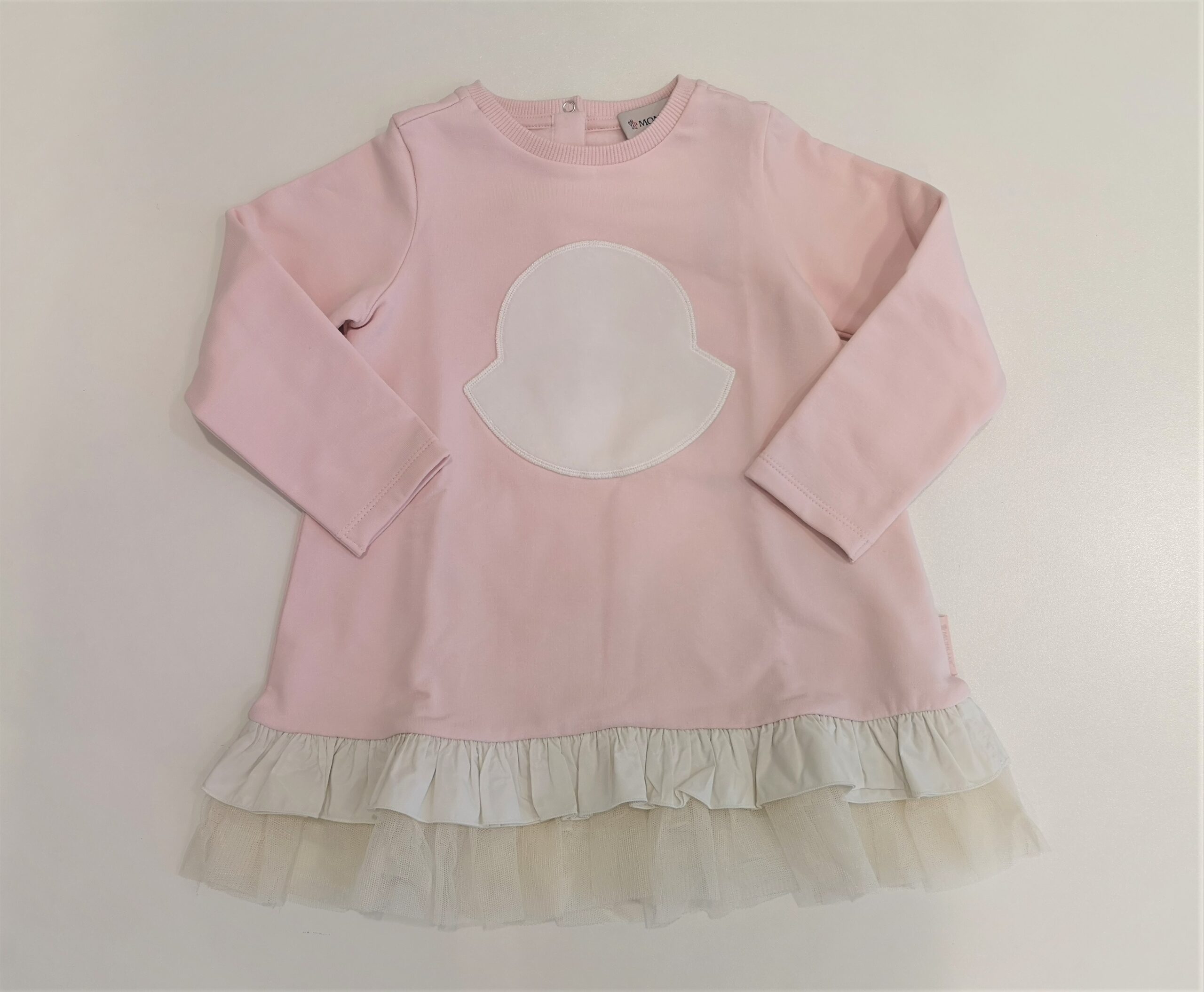 Vestito rosa manica lunga in felpa con inserto sagoma logo davanti. Doppia balza panna con tulle.