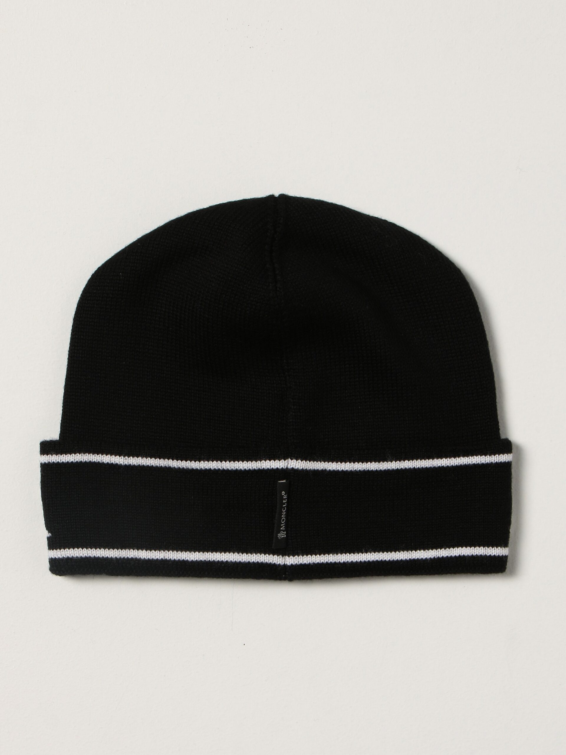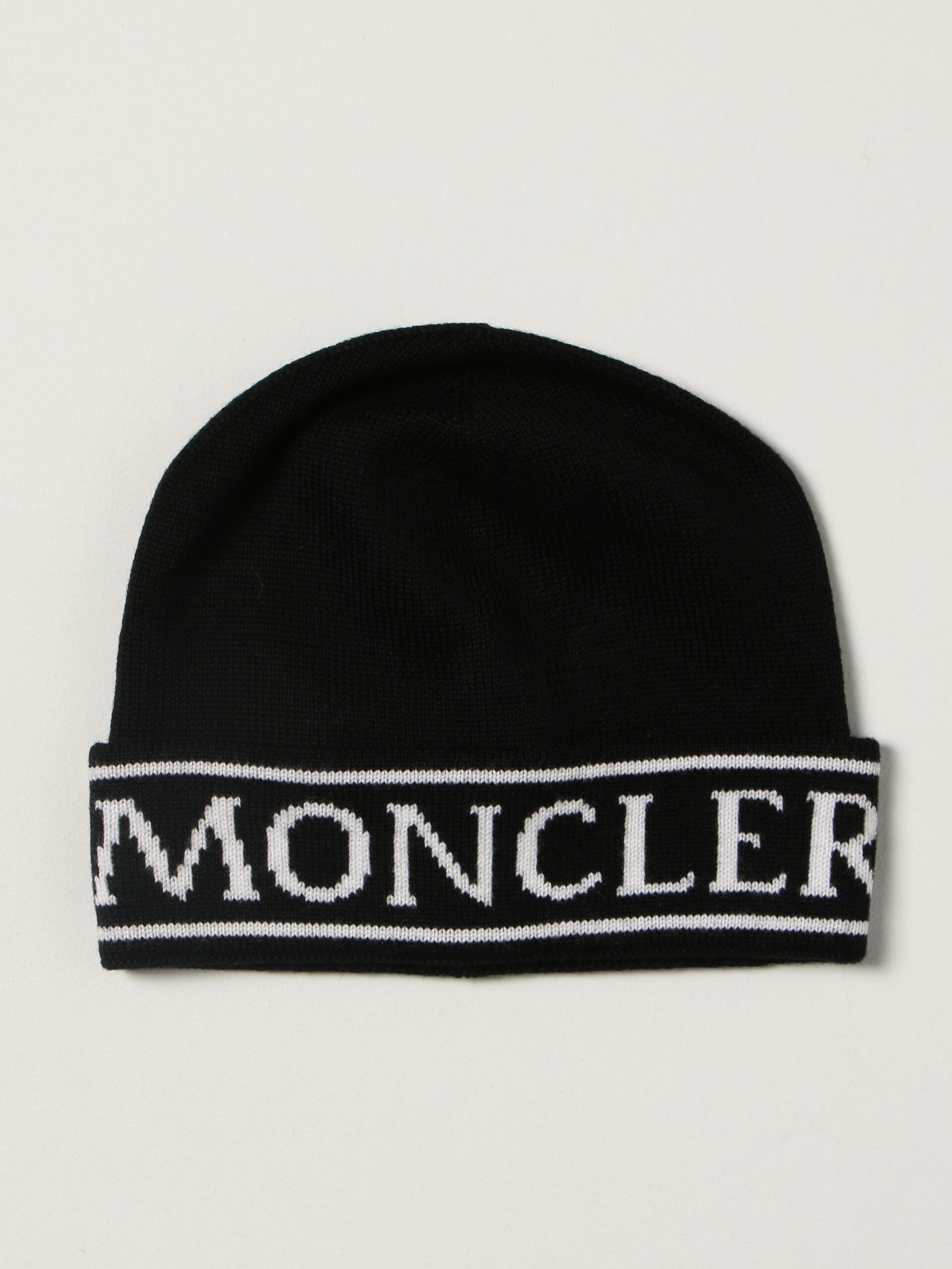 Berretto tricot fondo nero con fascia logata. 100% lana. Logo Moncler in feltro