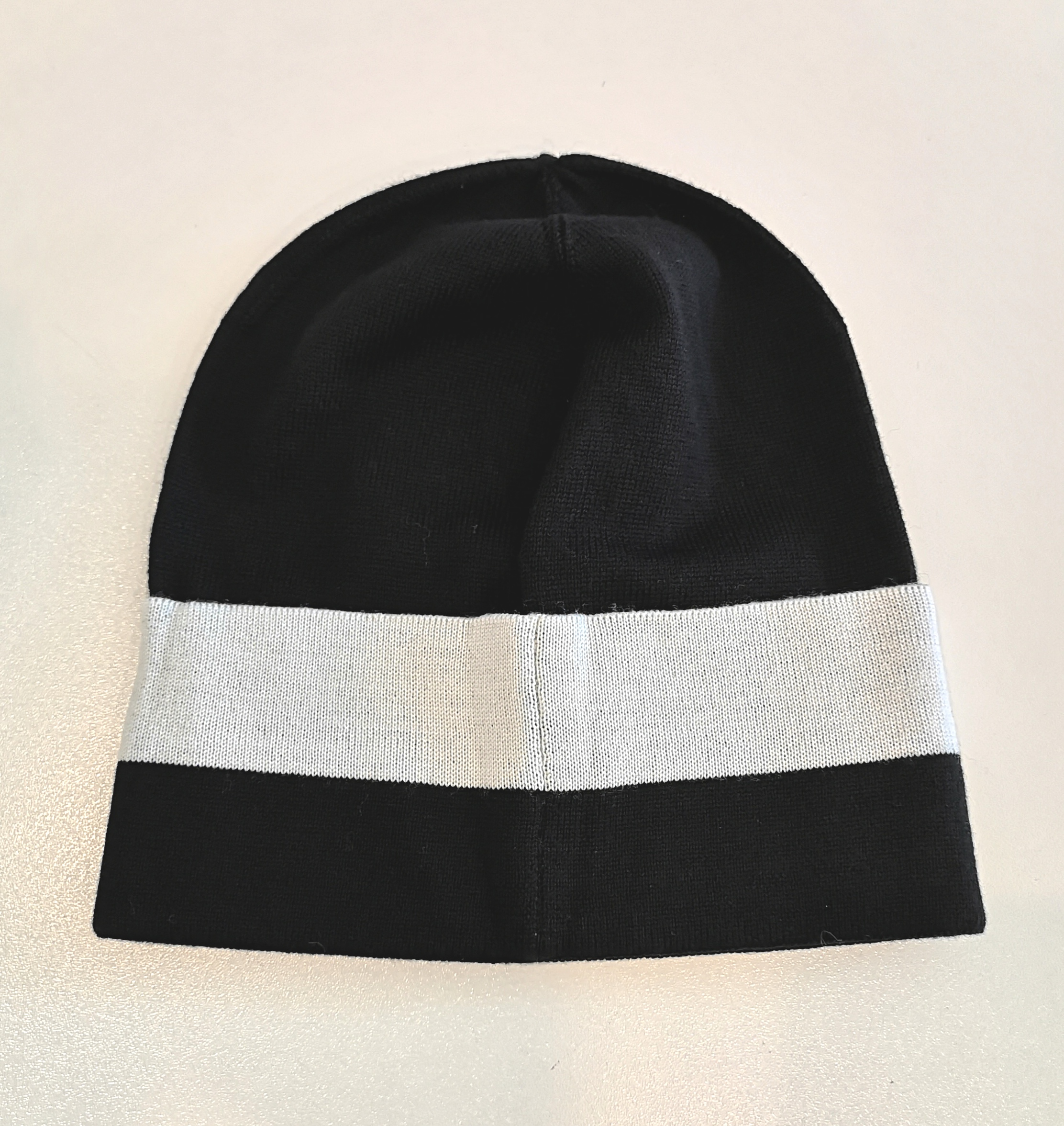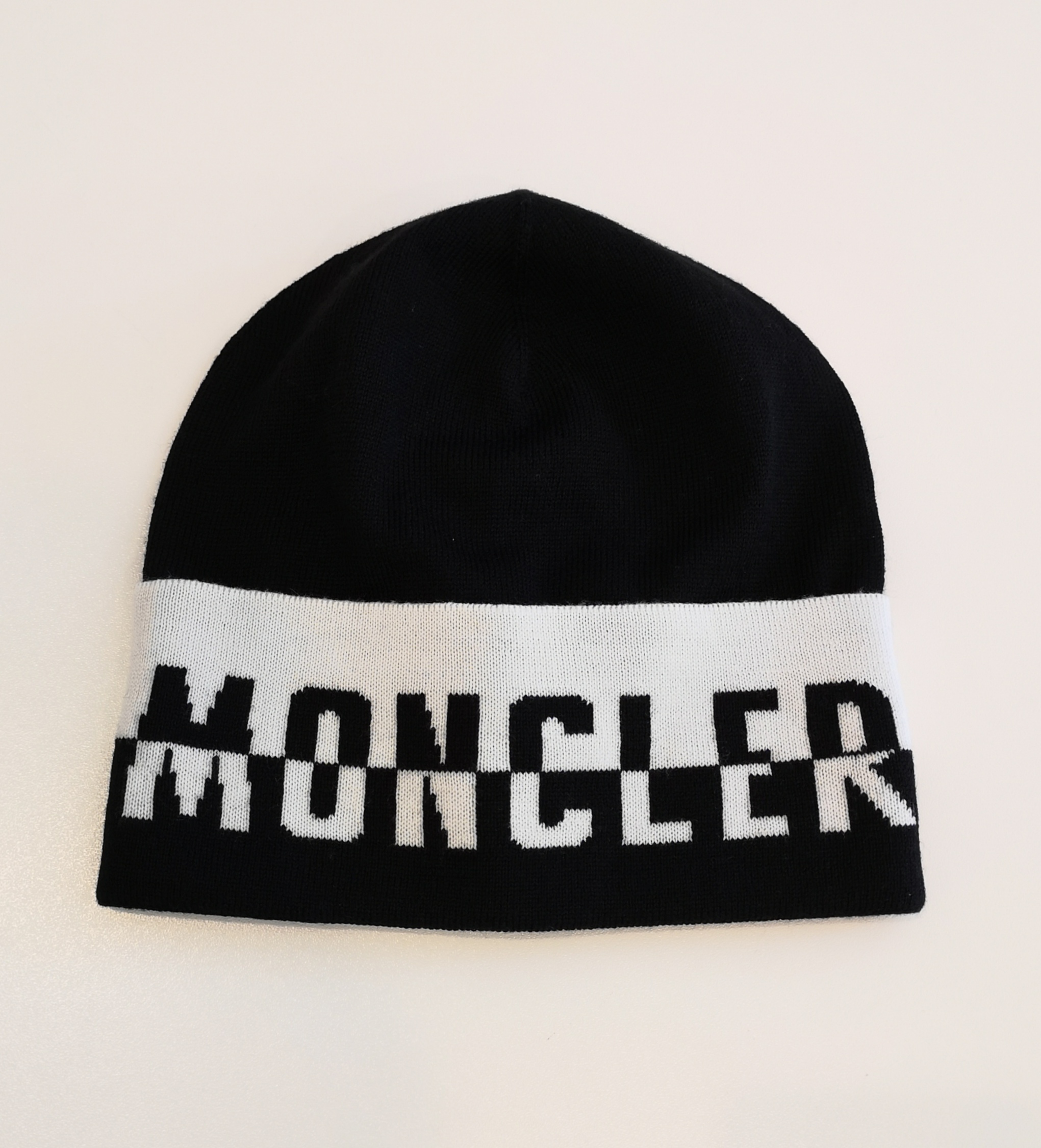 Berretto tricot fondo nero con fascia logata. 100% lana. Logo Moncler in feltro