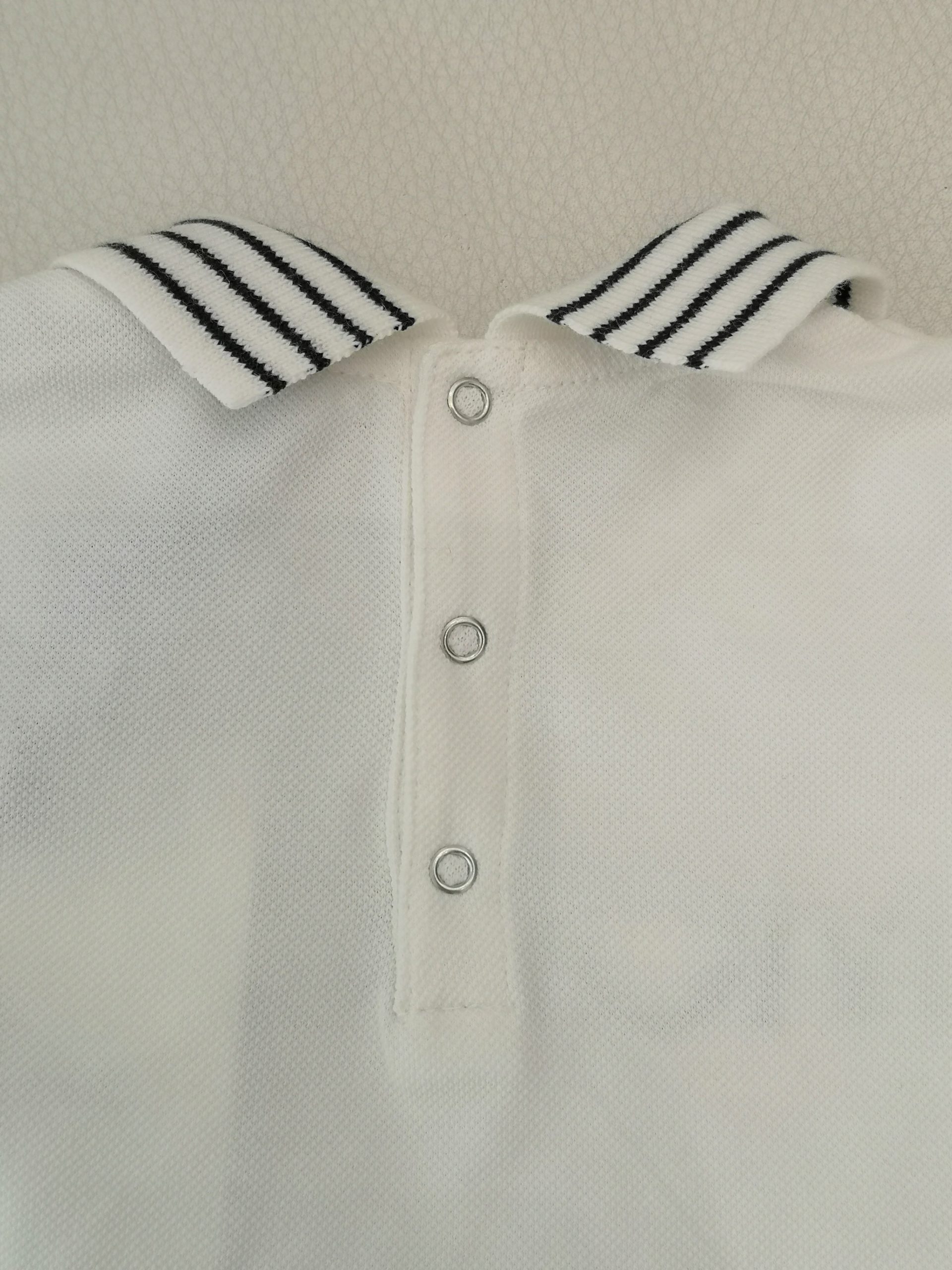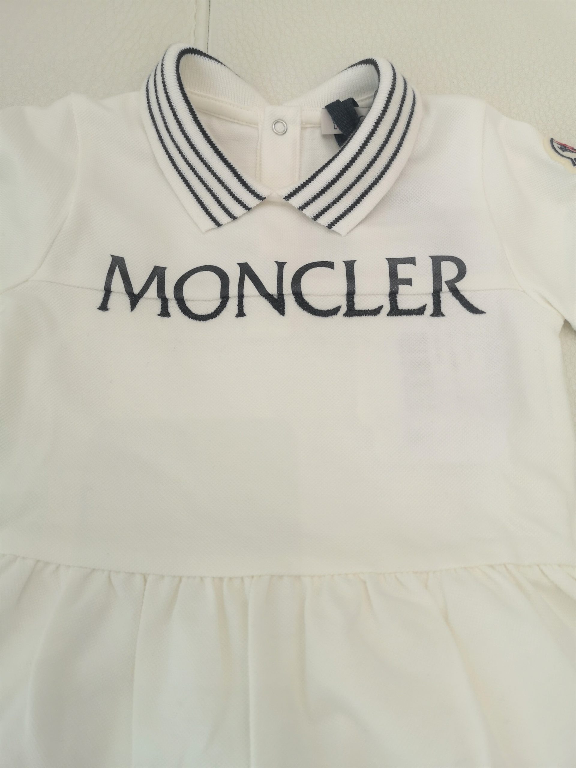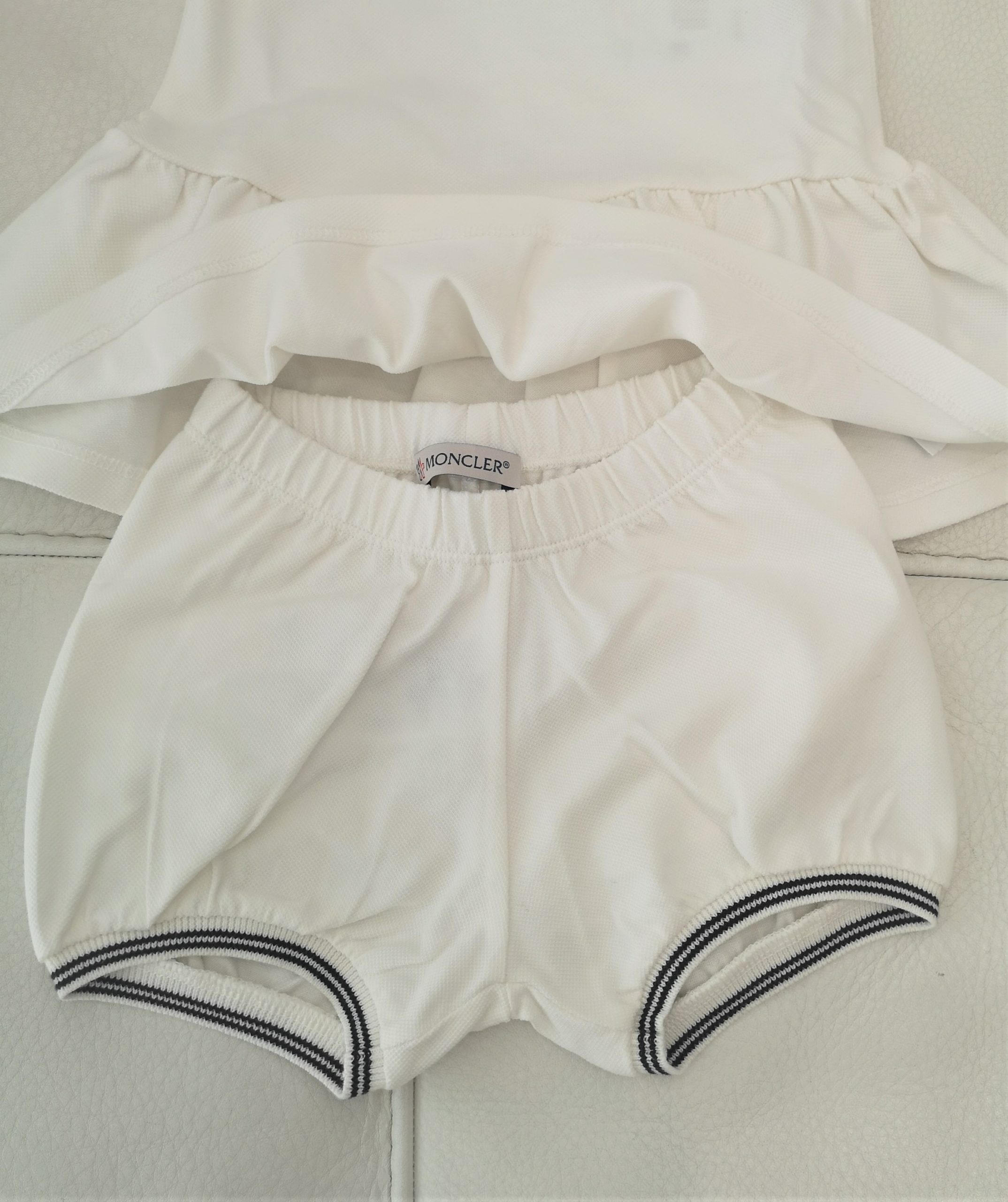 Completo 2 pezzi in tessuto piquet bianco: vestito manica corta modello polo con culotte abbinata e scritta MONCLER davanti in contrasto nero. Colletto polo con righe nere, apertura dietro con bottoncini. Logo sulla manica.