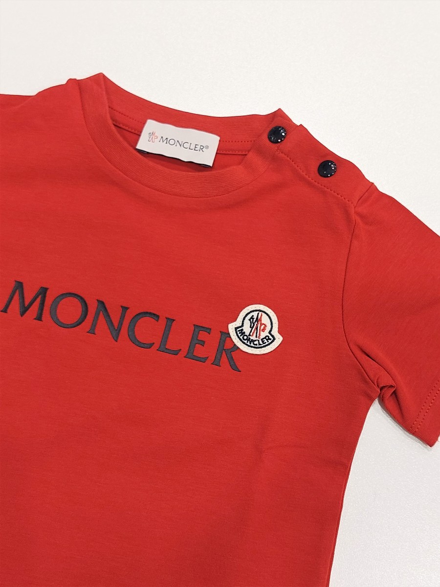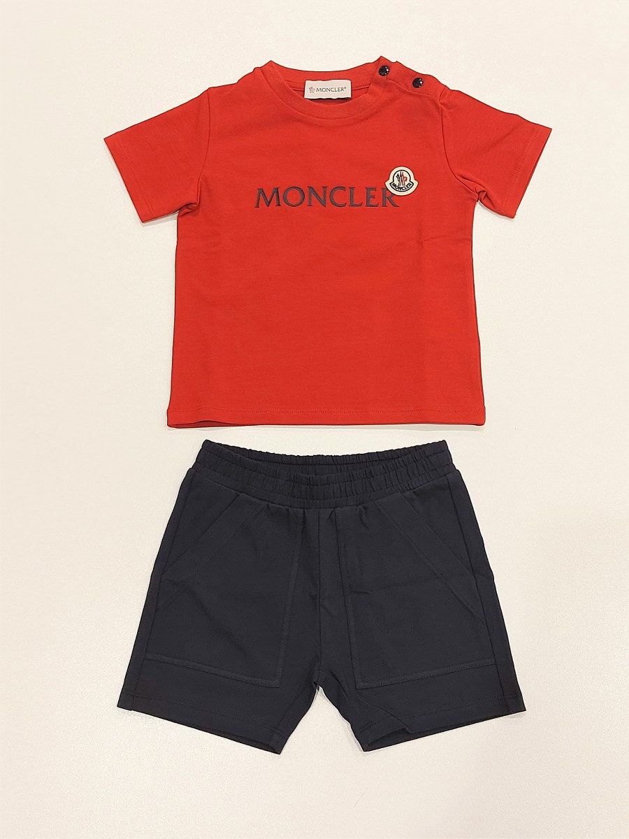Completo due pezzi: t-shirt manica corta rossa con scritta MONCLER in blu. Logo in feltro davanti. Pantaloncini blu