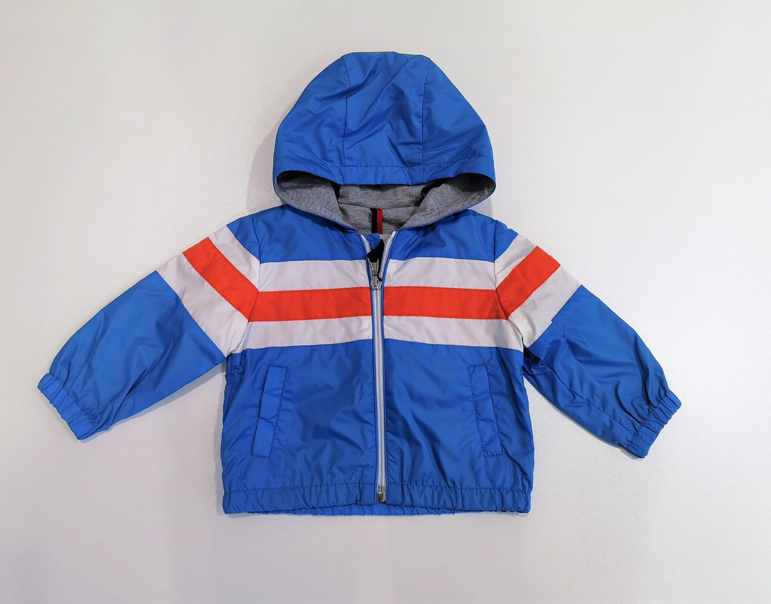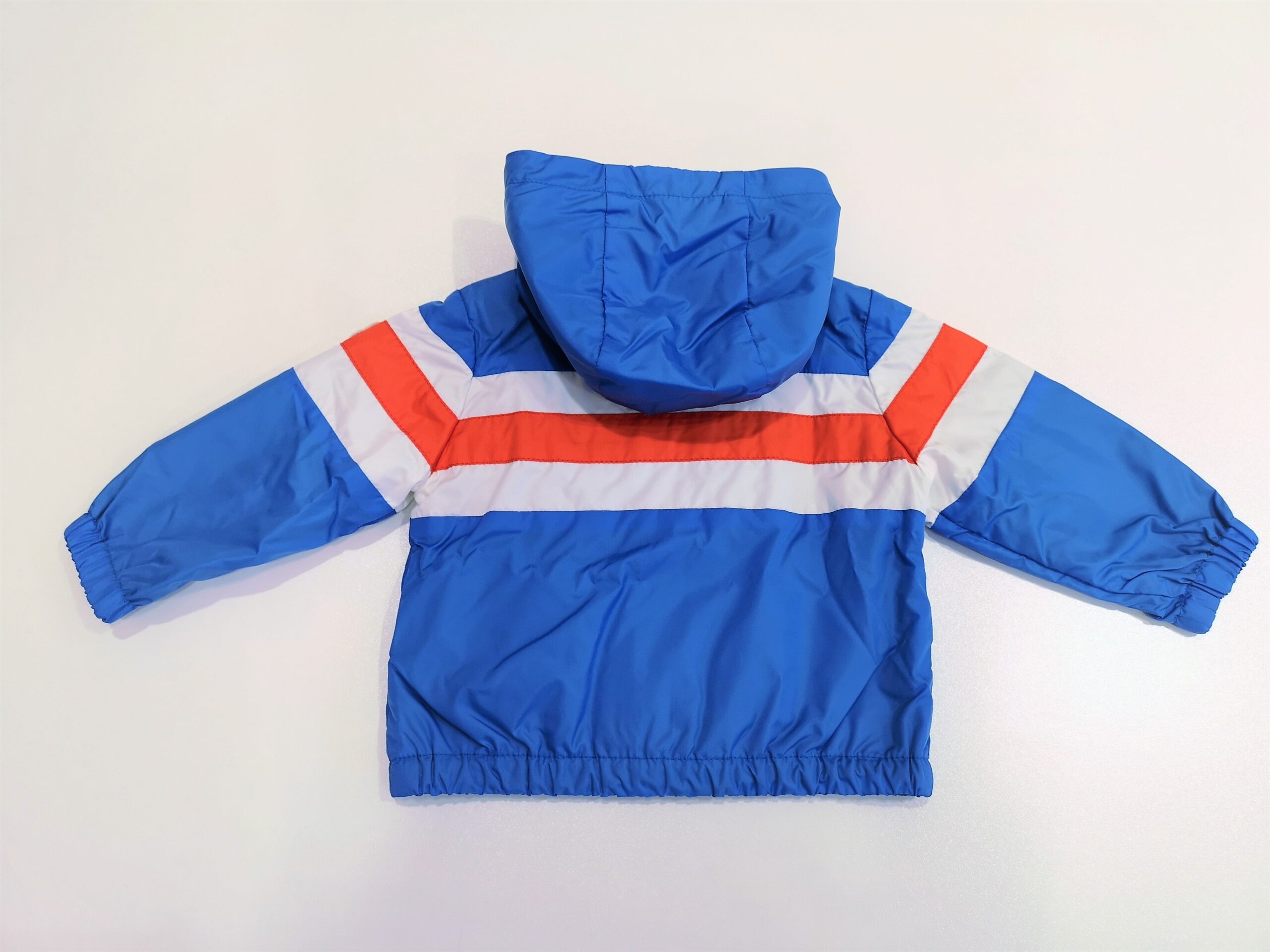 Giubbotto leggero turchese con fasce bianco-arancio con cappuccio. Tasche davanti. Apertura con zip davanti. Logo sulla manica