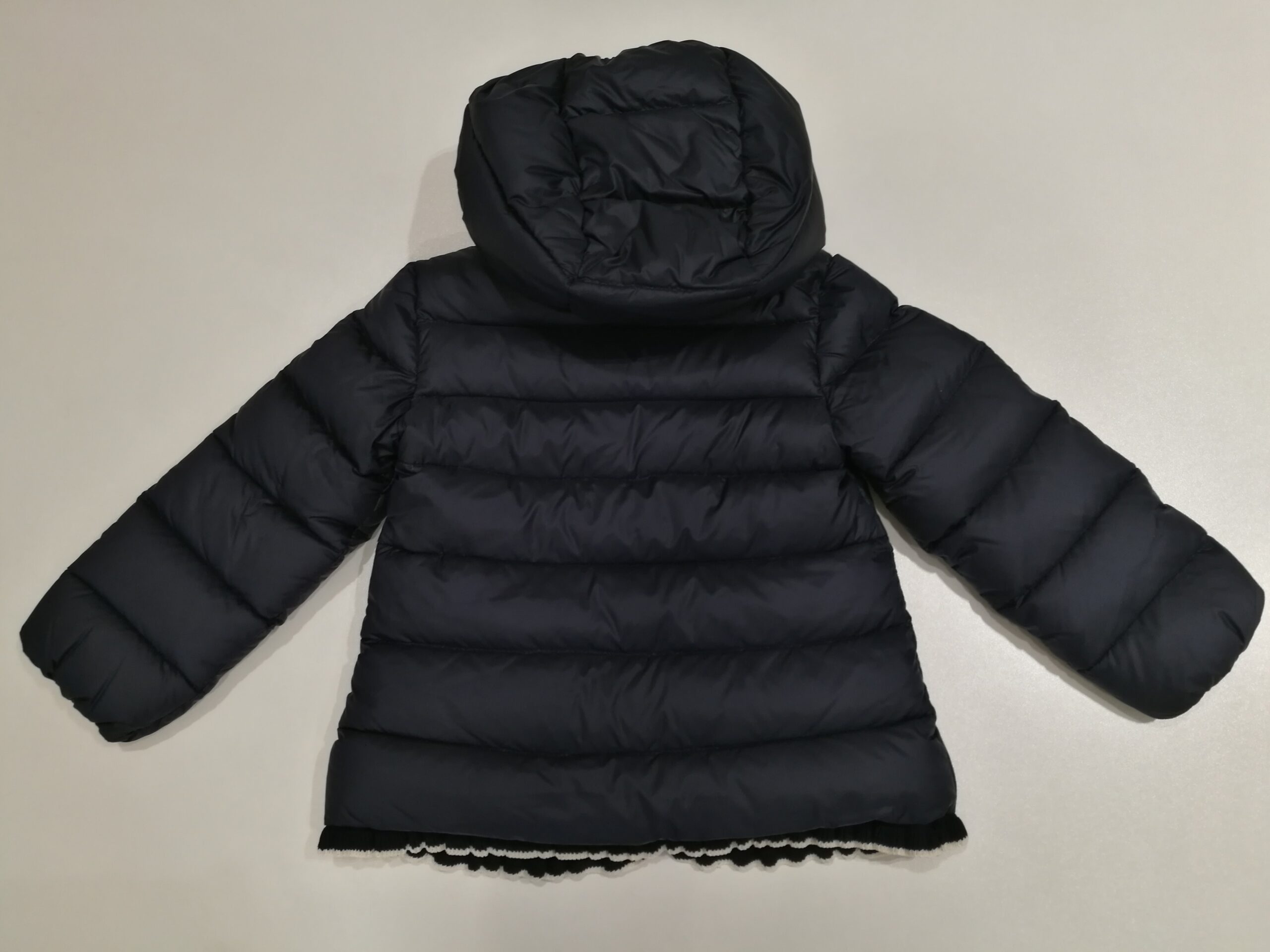 Piumino di colore blu by Moncler Girl realizzato in nylon imbottito con la migliore qualità di piuma d’oca. Chiusura frontale full-zip bordata in maglia. Iconica patch logo applicata sulla manica. Ruches in maglia sulle taschine e sul bordo inferiore. Cappuccio staccabile. Polsini e cappuccio con bordo elasticizzati per una maggiore protezione dal freddo e dal vento.